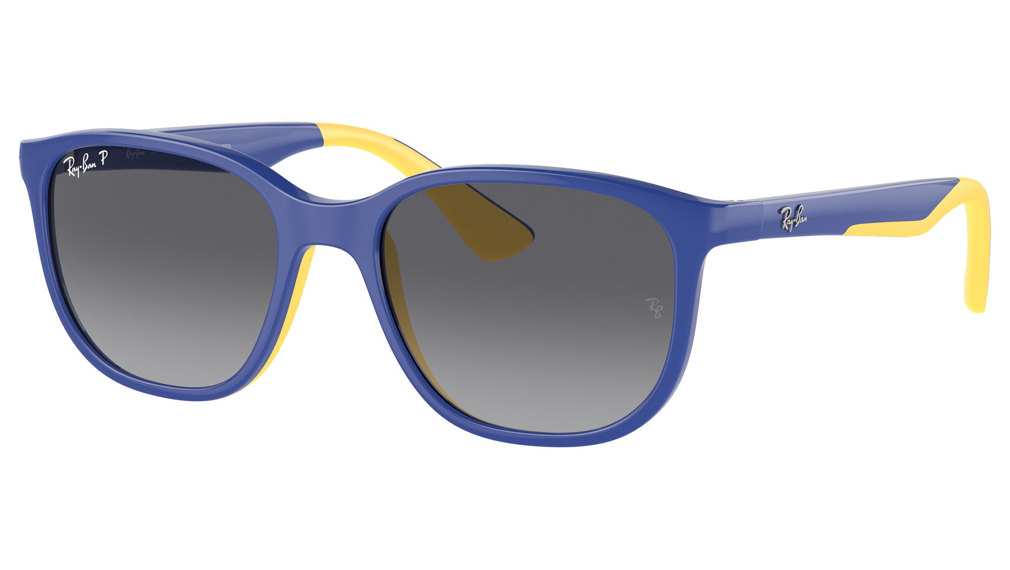 Occhiali da sole Ray-Ban Kids RJ9078S in iniettato codice colore 7132T3 azzurro su giallo. Forma quadrata unisex full rim con lenti grigio. Con custodia originale e garanzia. Rivenditore autorizzato Ray-Ban.