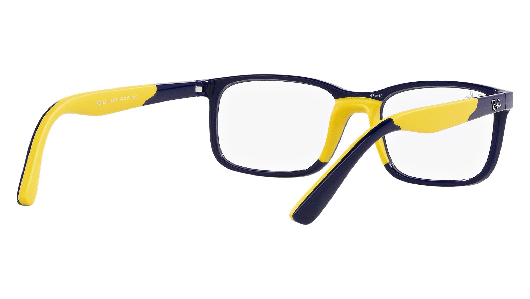 Occhiali da vista Ray-Ban Kids RY1621 color blu scuro su giallo in iniettato codice colore 3937. Forma unisex rettangolare full rim con lenti demo. Con custodia originale e garanzia. Rivenditore autorizzato Ray-Ban.