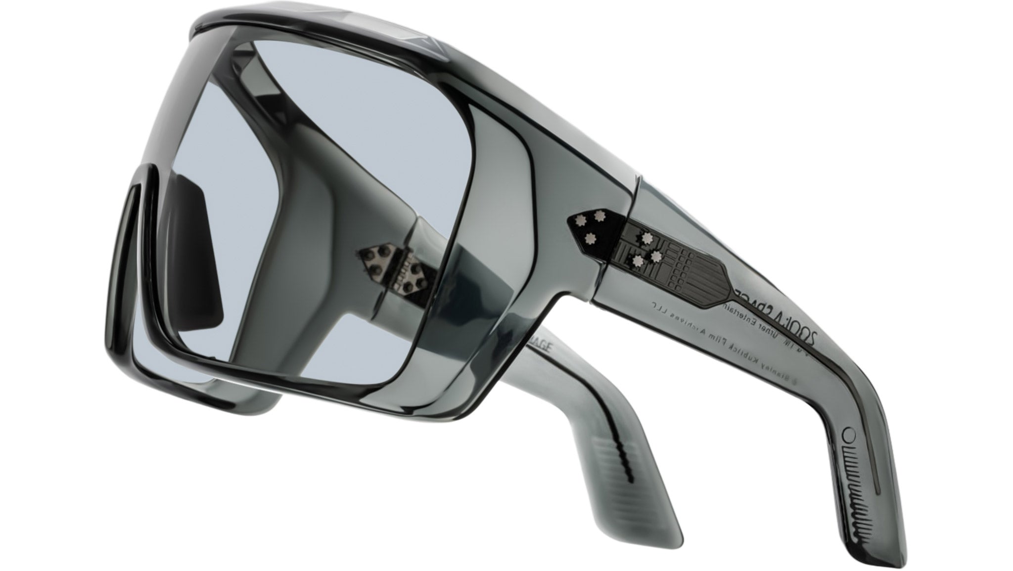 Crafted from gray 10mm cured cellulose acetate, this frame features custom acetate temples with precious metal hardware and a gray nylon shield lens offering 100% UV protection. The design is elevated by exposed silver HAL 9000 wirecores and silver tension-secured custom 9-barrel hinges, ensuring strength and precision. Custom rubber nose pads provide superior comfort and fit, while the gray nylon lens is finished with a backside anti-reflective treatment, combining futuristic design with exceptional craftsmanship and optimal visual clarity.