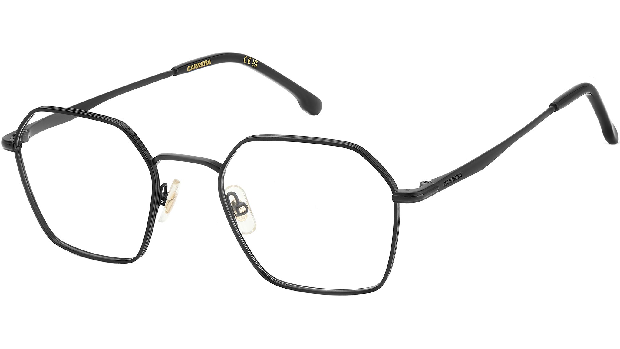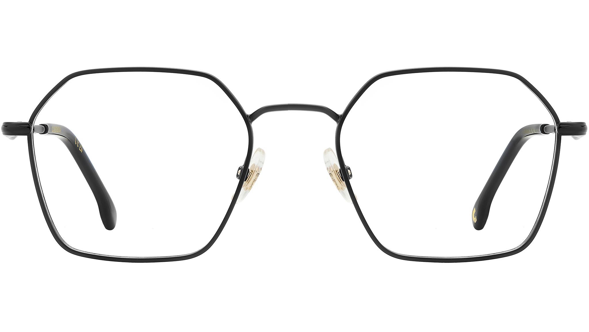 Occhiali da vista Carrera modello 335 colore 003 matte black. Allure vintage e stile intramontabile per questi occhiali da vista Carrera dai profili sottili. Indimenticabile la silhouette del frontale, vagamente esagonale, leggera sul volto perché realizzata in acciaio inossidabile. Le aste in metallo sono scolpite della classica shape a pinna, eredità del design storico Carrera. Il brand è esplicitato nella firma laserata e nella bandiera che colora i terminali multistrato. Disponibile in più varianti colore, anche con frontale smaltato.