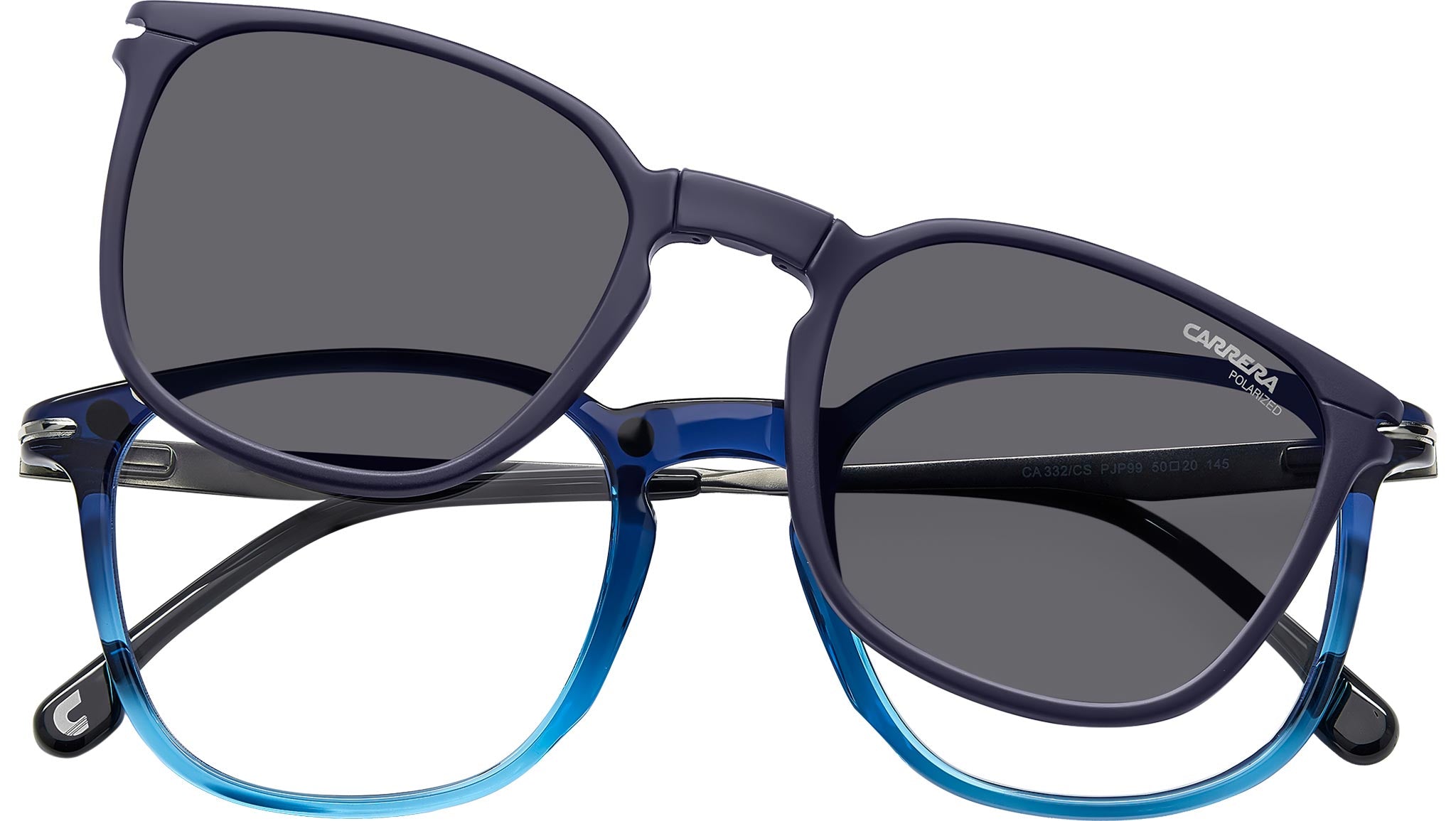 Occhiali da sole Carrera modello CA 332/CS colore PJP M9 blue. Esteticamente impeccabili questi occhiali da vista con lenti da sole clip-on firmati Carrera. Forma squadrata per il frontale in acetato leggero, decorato dall’inserto metallico a forma di “C”. Quest’ultimo rimane visibile anche quando si indossano le lenti clip-on polarizzate: stile e praticità vanno a braccetto. Il dettaglio in più? Le lenti clip-on sono pieghevoli, perfette da portare sempre con sé. Molteplici le varianti colore, tutte impeccabili.