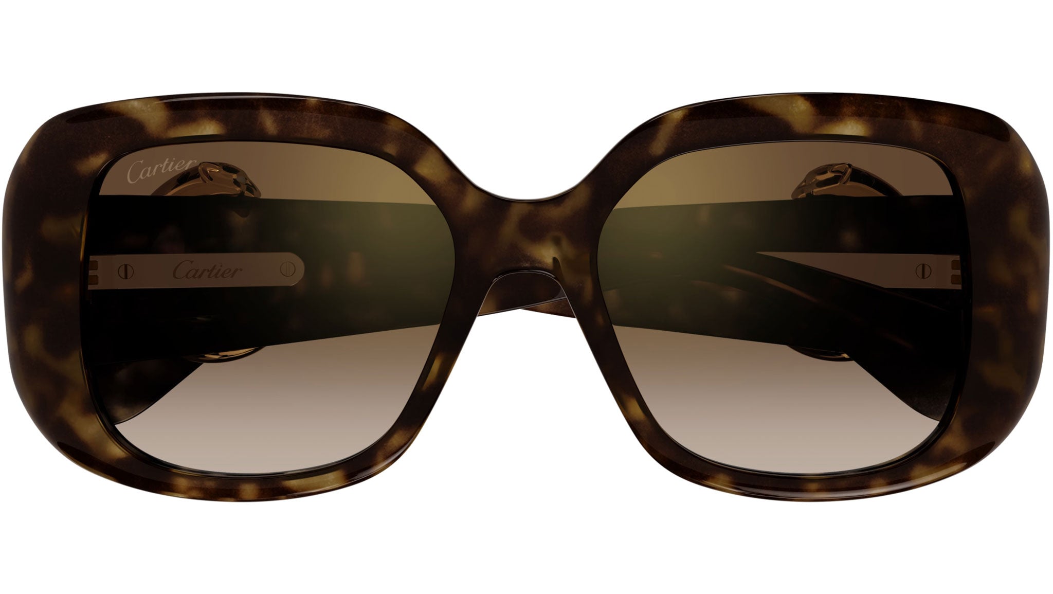 Occhiali da sole Cartier linea Core Range modello CT0471S rectangle in acetato riciclato codice colore 002 tartaruga scuro con aste tartaruga e lenti color marrone sfumato con flash oro.