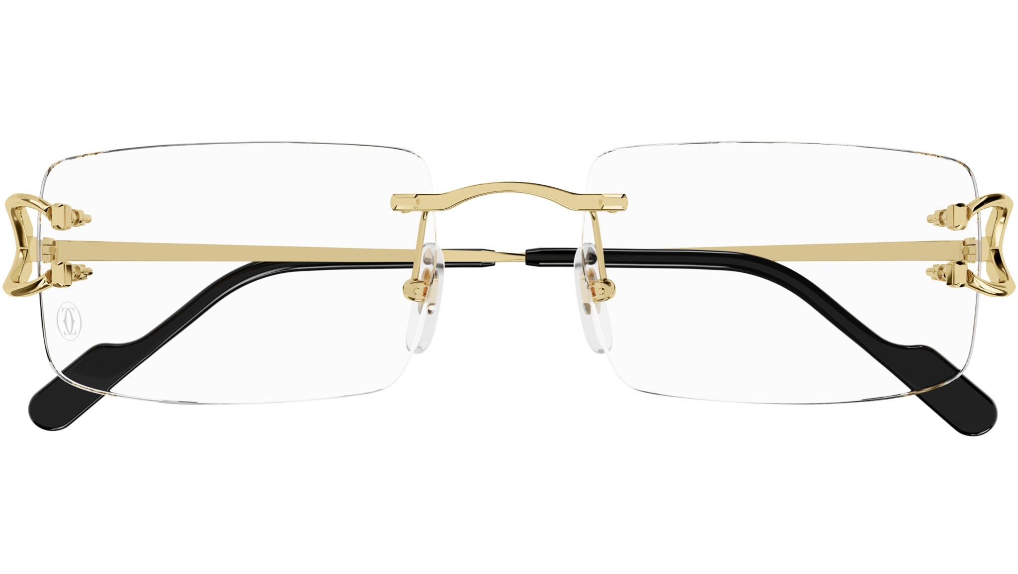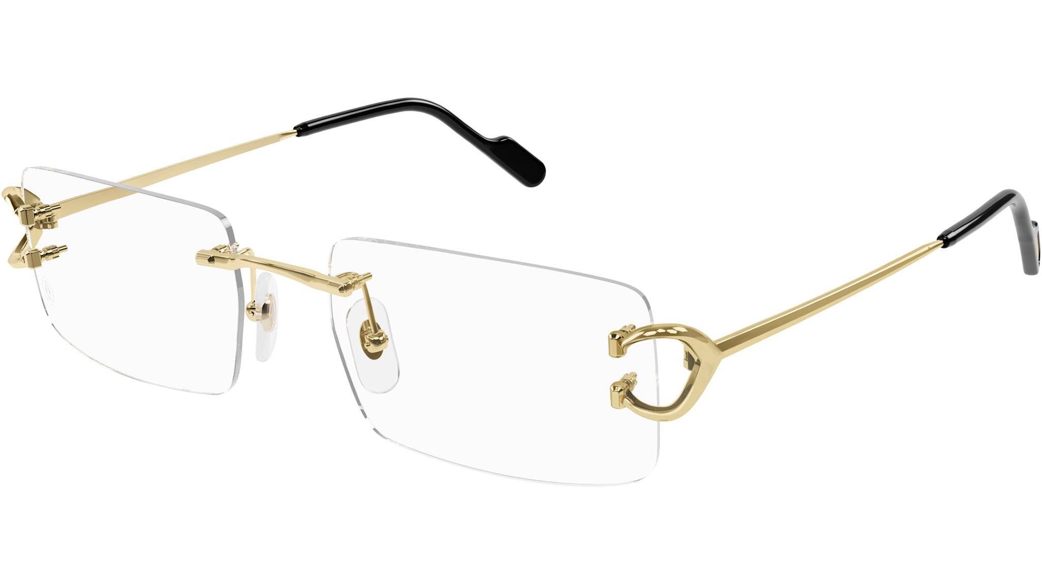 Occhiali da vista Cartier Core Range modello CT0488O rectangle in metallo codice colore 001 oro finitura smooth con aste oro e lenti demo da materiale riciclato con strato HR e filtro AR blu.