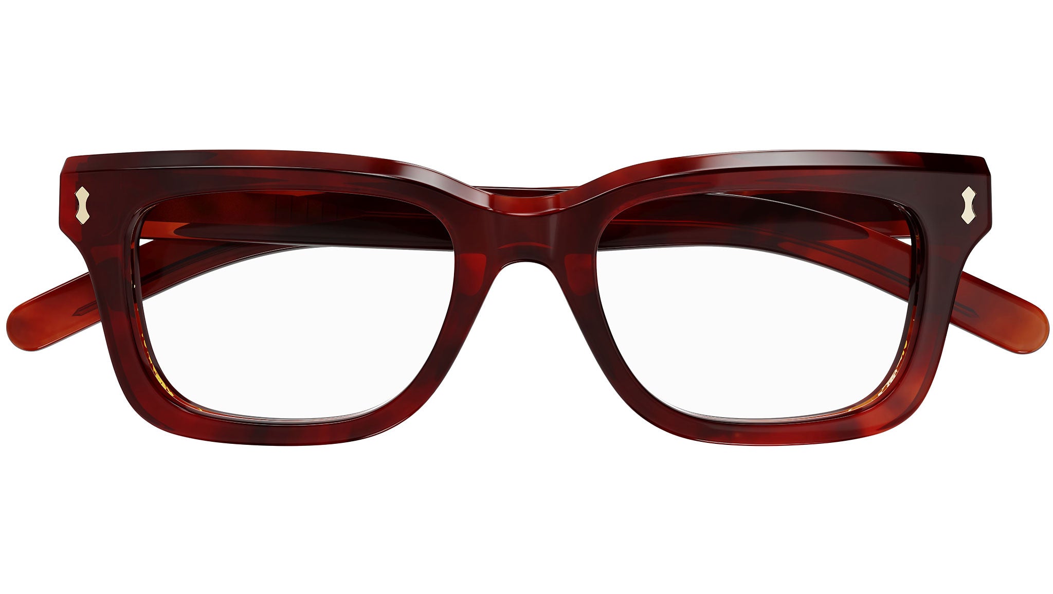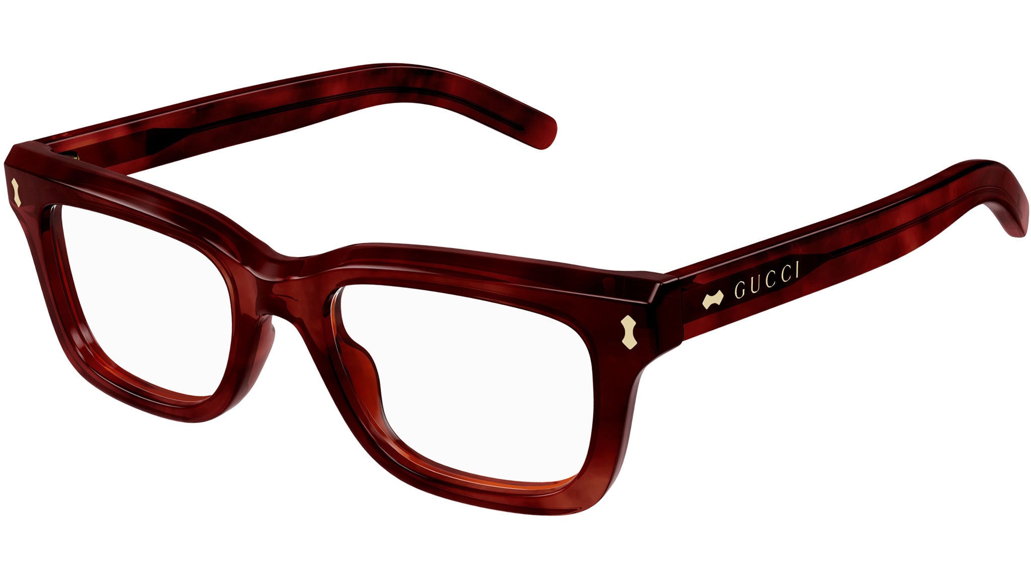 Occhiali da vista Gucci Rivets modello GG1522O rettangolari in acetato riciclato codice colore 007 avana rossastro lucido con astine tartaruga e lenti demo.