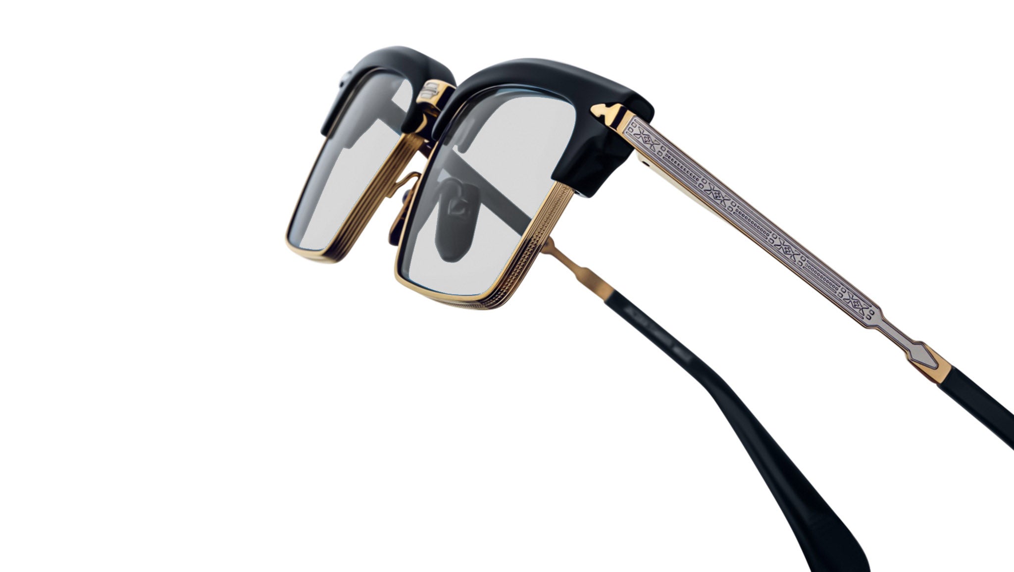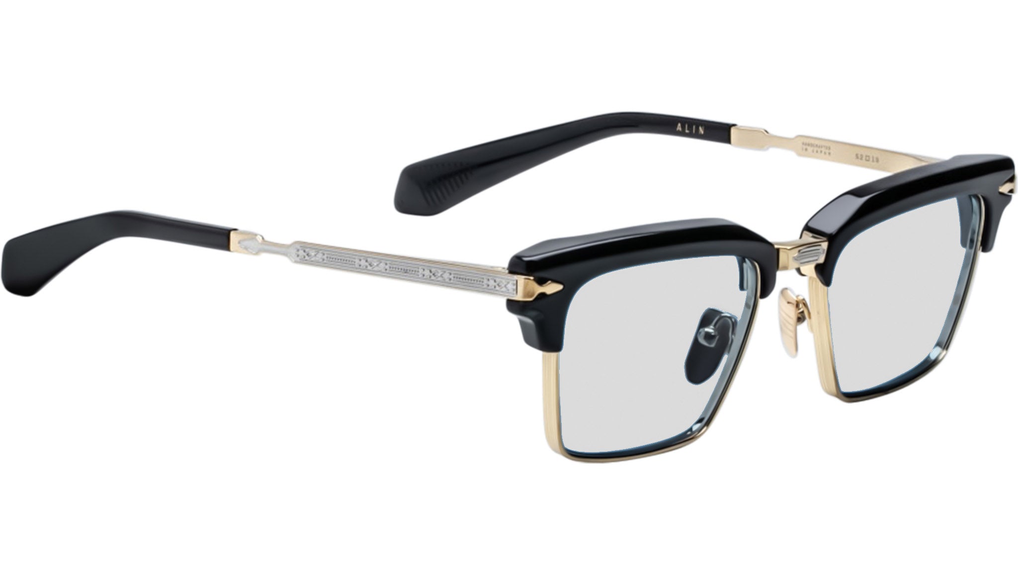 Crafted from 100% beta titanium in an exclusive Moon Gold finish with refined silver accents, this eyewear exemplifies precision and sophistication. The frame is complemented by black cured cellulose acetate detailing and silver-engraved titanium temples with acetate tips for enhanced comfort. A tension-secured custom arrowhead monoblock hinge in Moon Gold ensures durability and seamless movement, while the black cellulose acetate custom nose pads feature an engraved logo and delicate hairline detailing. This piece is presented with a custom hard case, microfiber cloth, and certificate of authenticity, reflecting the brand's commitment to exceptional craftsmanship and exclusivity.