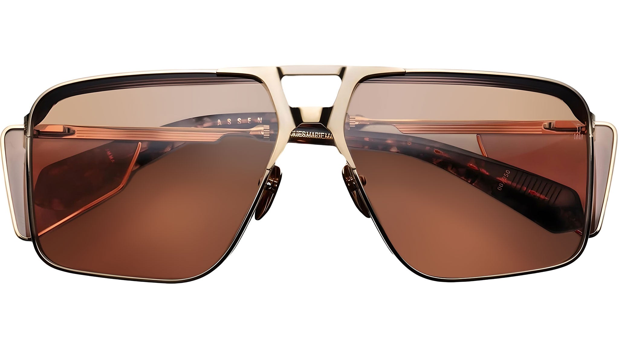 Gold 100% beta titanium frame with orange lenses, Moon Gold hairline engraved titanium temples with agar tips, Moon Gold tension-secured custom monoblock hinge, custom nose pads with logo and hairline engraving, orange CR-39 eyeshields and 4 base lens with backside anti-reflective treatment, offering 100% UV protection.