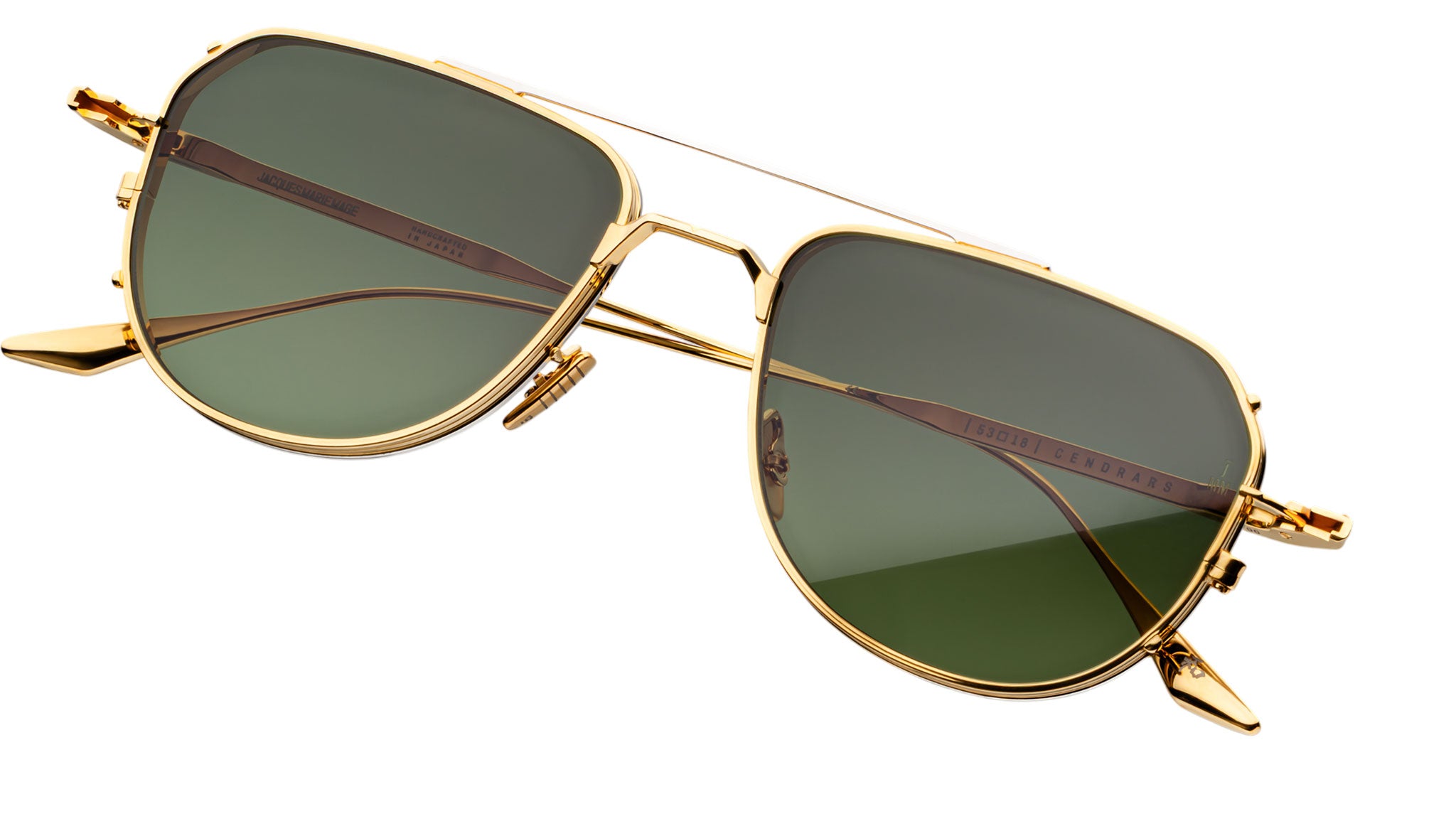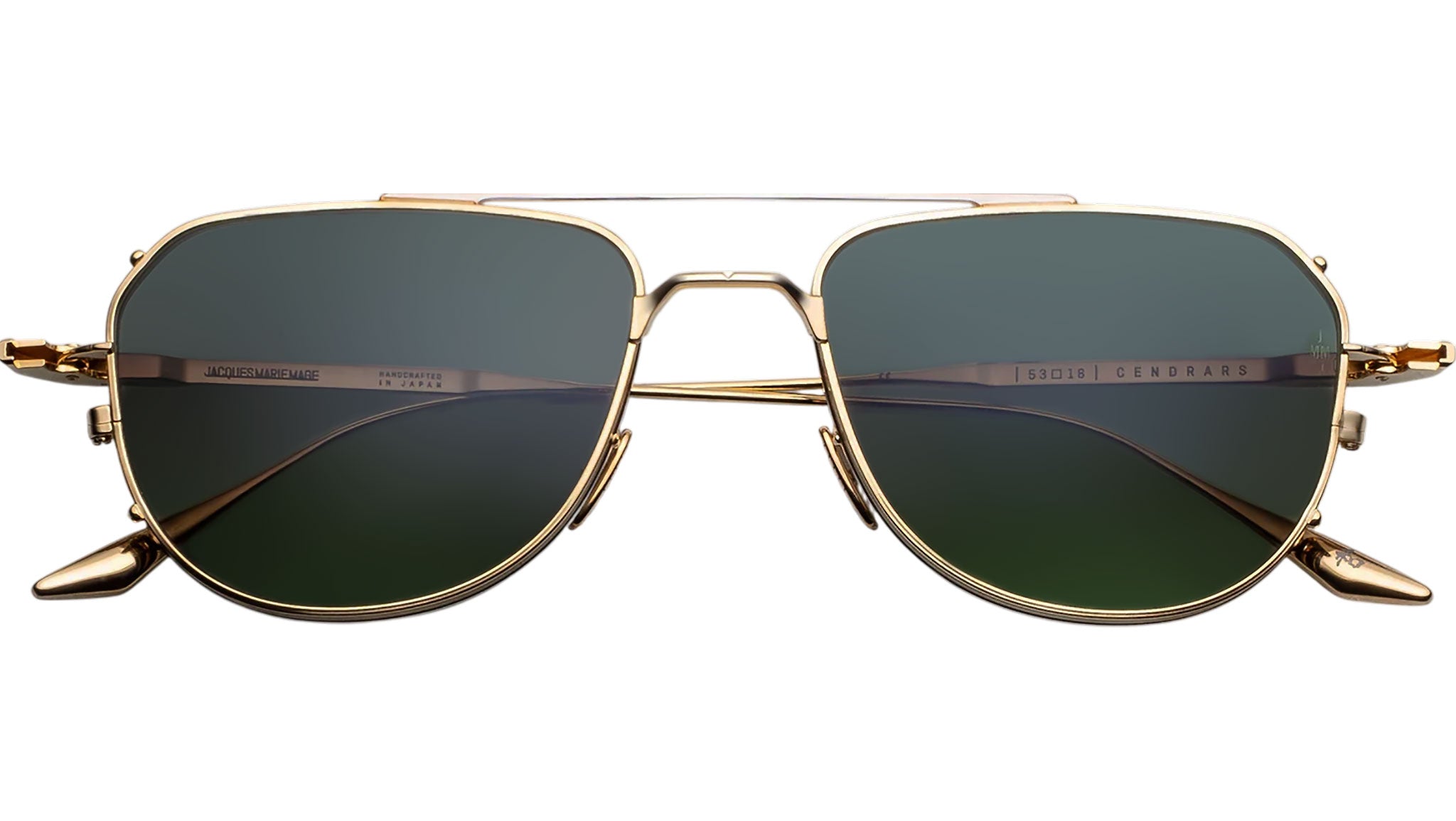 The Jacques Marie Mage Cendrars are midcentury-inspired titanium pilot sunglasses defined by a streamlined silhouette and refined proportions. Featuring a distinctive double wire-rim construction, custom monoblock hinges, and finely detailed temples adorned with subtle epoxy embellishments, this design reflects both structural precision and expressive restraint. Winged temple tips complete the composition with a sculptural flourish. Named after novelist and poet Blaise Cendrars, these 1950s-inspired spectacles embody the cultivated charisma of a modern flâneur, merging literary spirit with masterful craftsmanship in a timeless and sophisticated form.