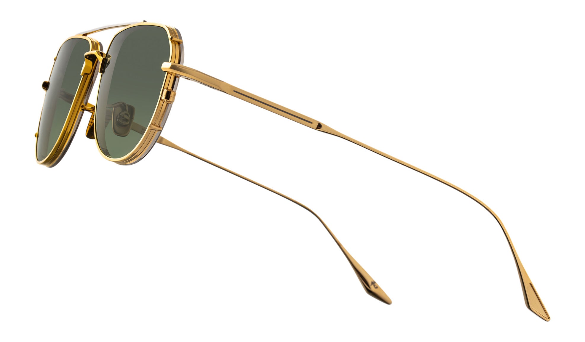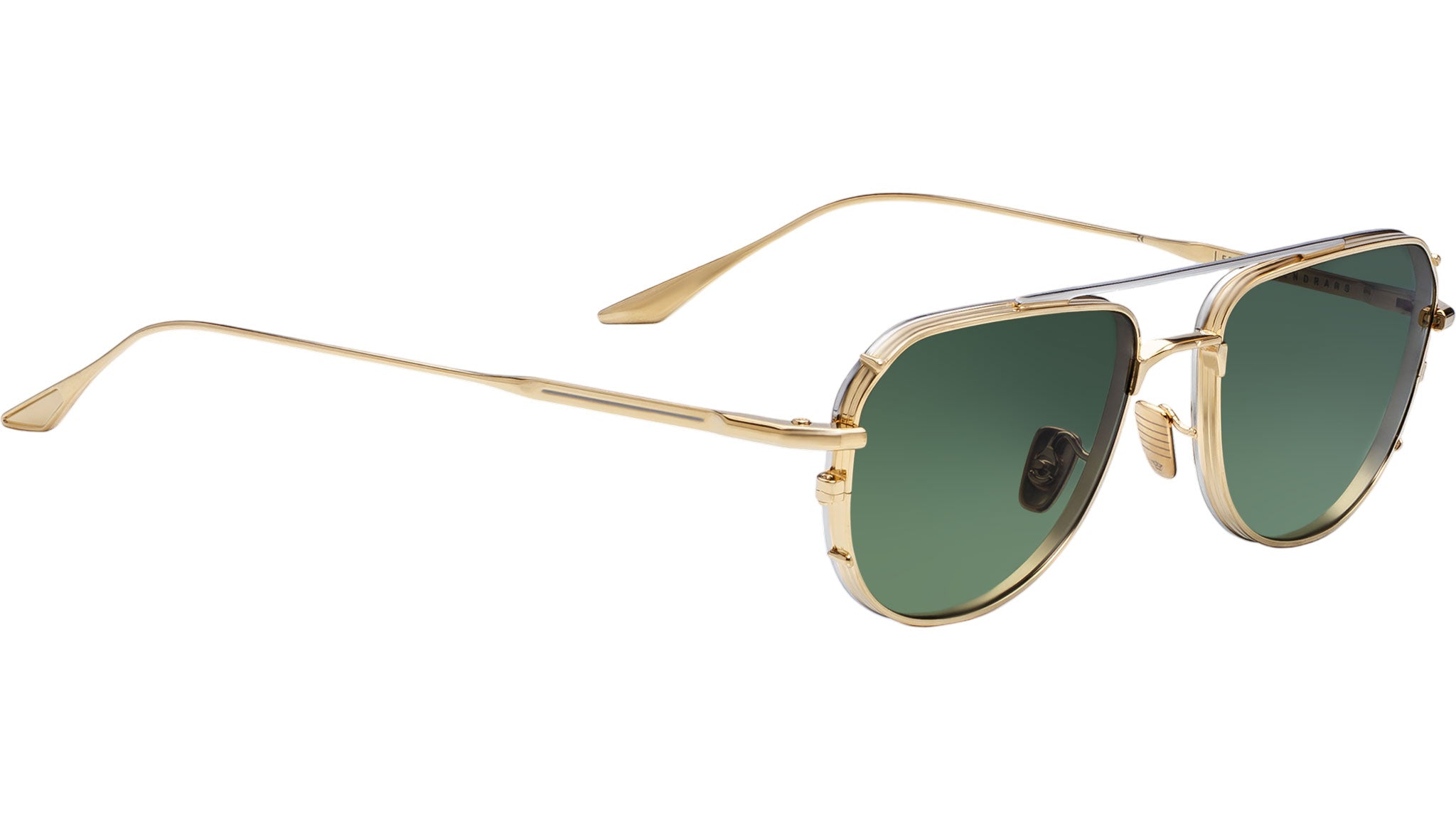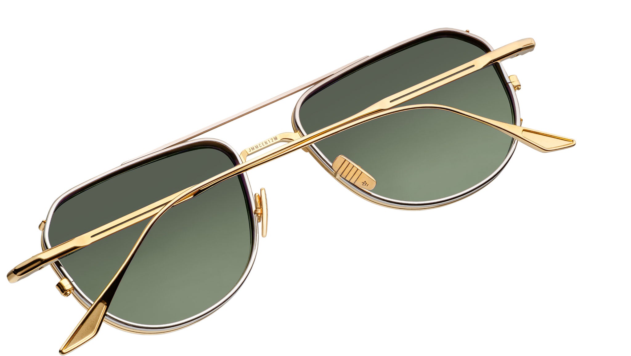 100% beta titanium spectacles in dark gold with silver palladium accents, complemented by Armorlite 4-base lenses in moss gradient with backside anti-reflective treatment, titanium nose bridge finished in dark gold, dark gold eye rims with double edges, back eyerim finished in silver palladium, top bar finished in silver palladium, monoblock hinges with hairline details.