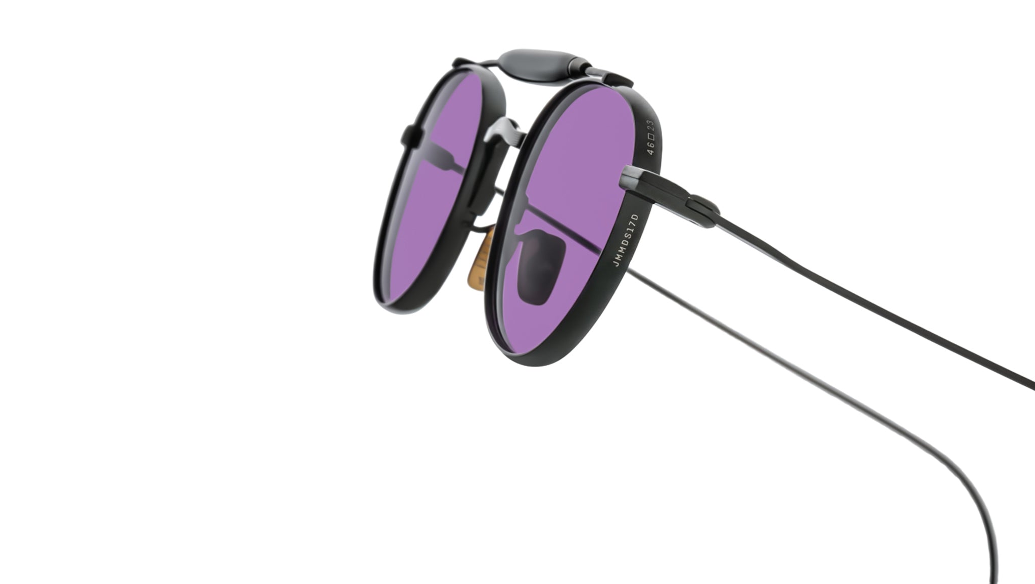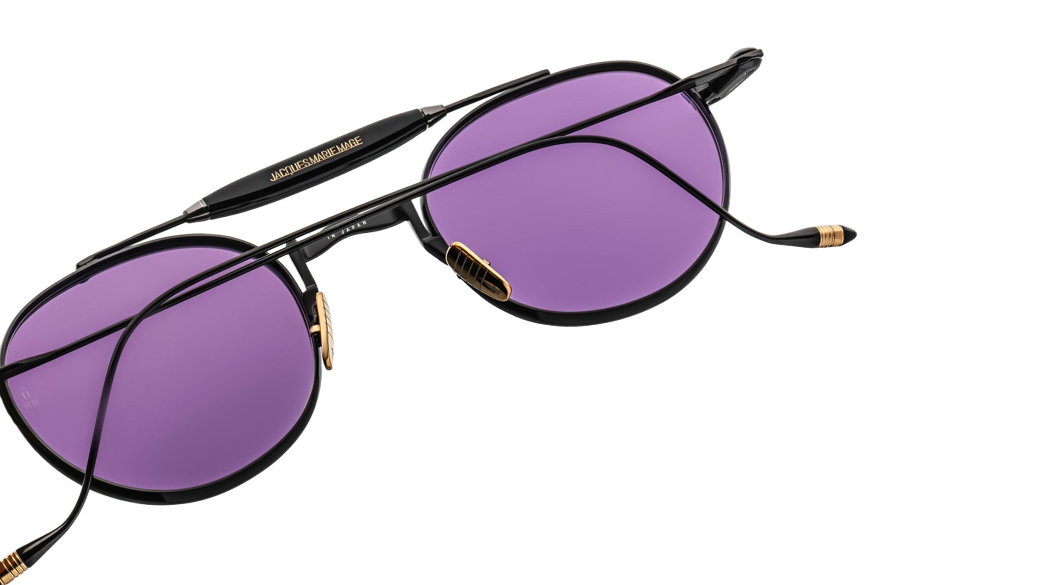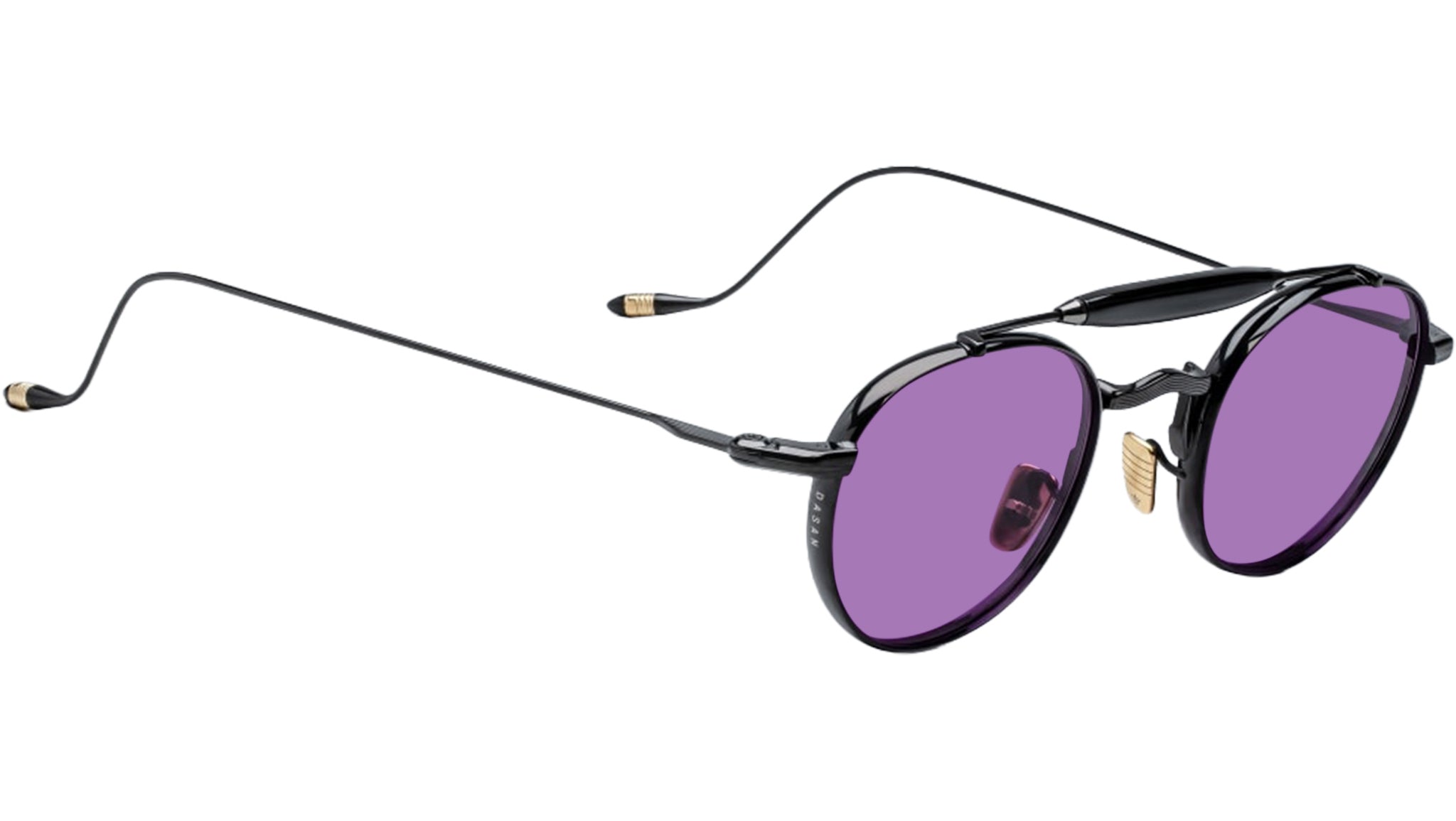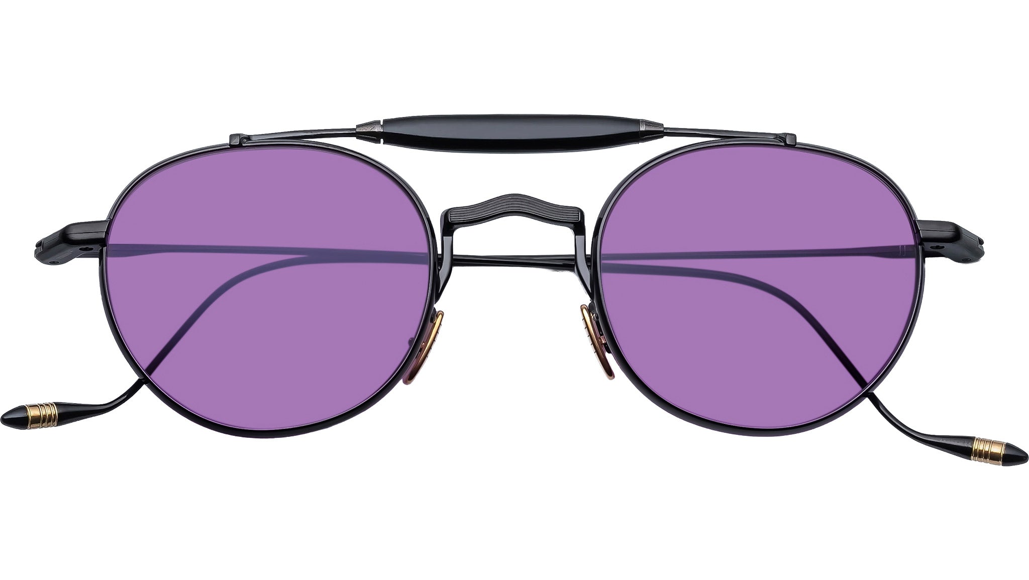 Black 100% beta titanium frame with black cured cellulose acetate bridge accent and purple lenses. Black titanium wire temples with black epoxy tips. Black tension-secured custom hairline block hinge. Black acetate bridge accent. Custom nose pads with logo and hairline engraving. Violet CR-39 2-base lenses with backside anti-reflective treatment. Frame shape: round. 100% UV protection.