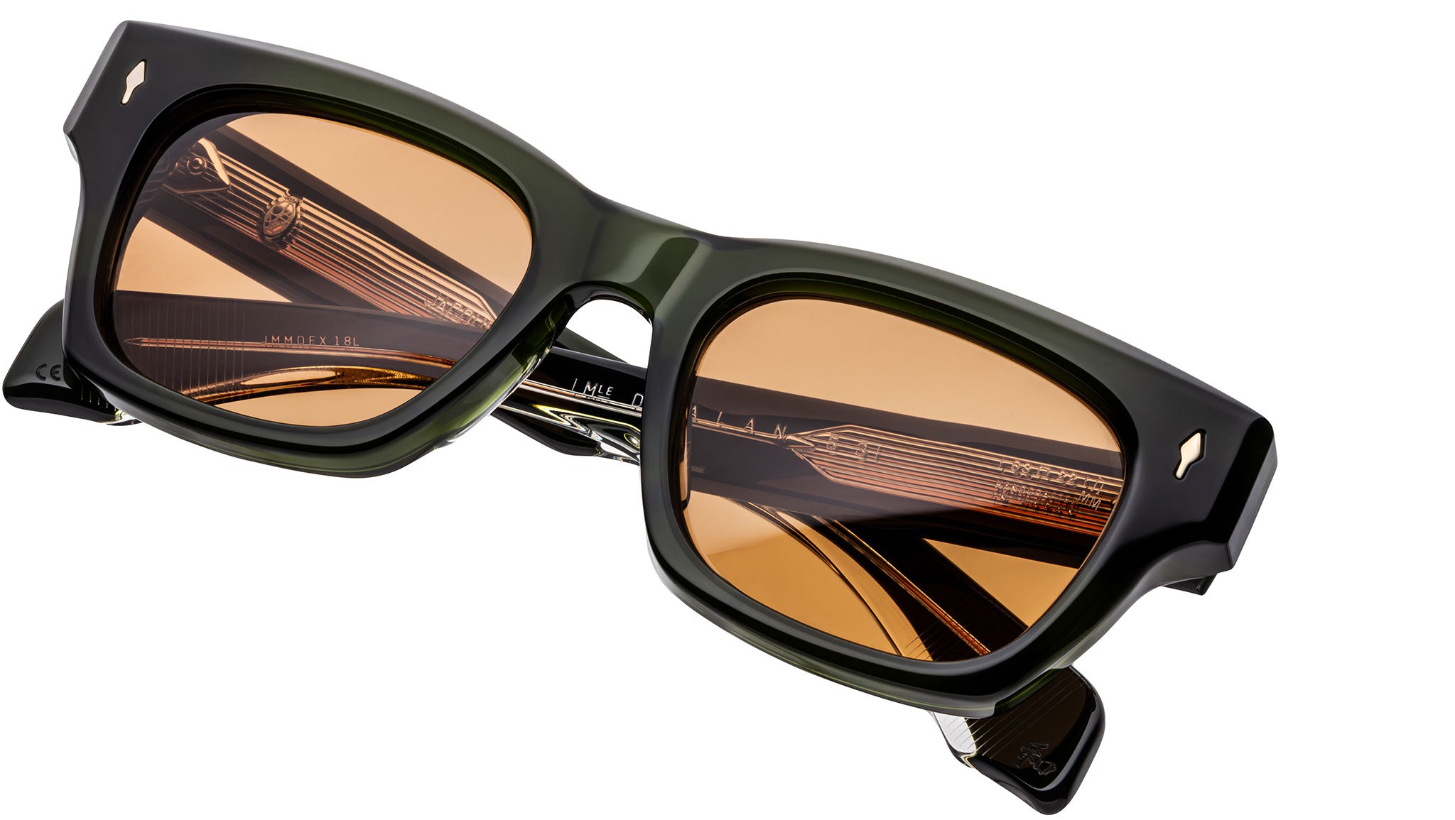 Green 10mm cured cellulose acetate frame with custom double-laminated acetate temples featuring precious metal hardware, silver signature arrowhead front pin, inner wirecore, tension-secured custom 7-barrel hinge, silver domed 3D metal cameo logo, orange CR-39 6-base lenses with backside anti-reflective treatment.