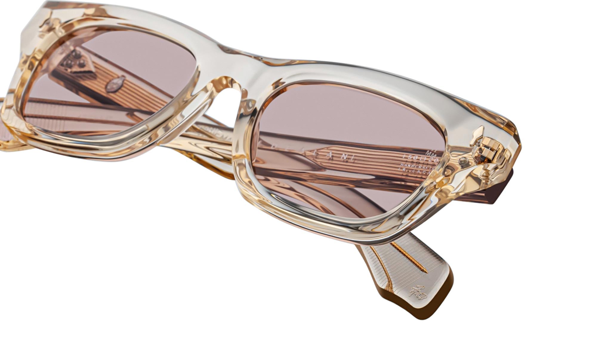 Pink 10mm cured cellulose acetate frame with custom double-laminated acetate temples and pink lenses. Features a light gold arrowhead front pin, exposed light gold wire core with custom hairline engraving, and a light gold tension-secured custom 7-barrel hinge. Dusty mauve CR-39 6 base lenses with backside anti-reflective treatment ensure clarity and comfort. Frame shape: square. Provides 100% UV protection.