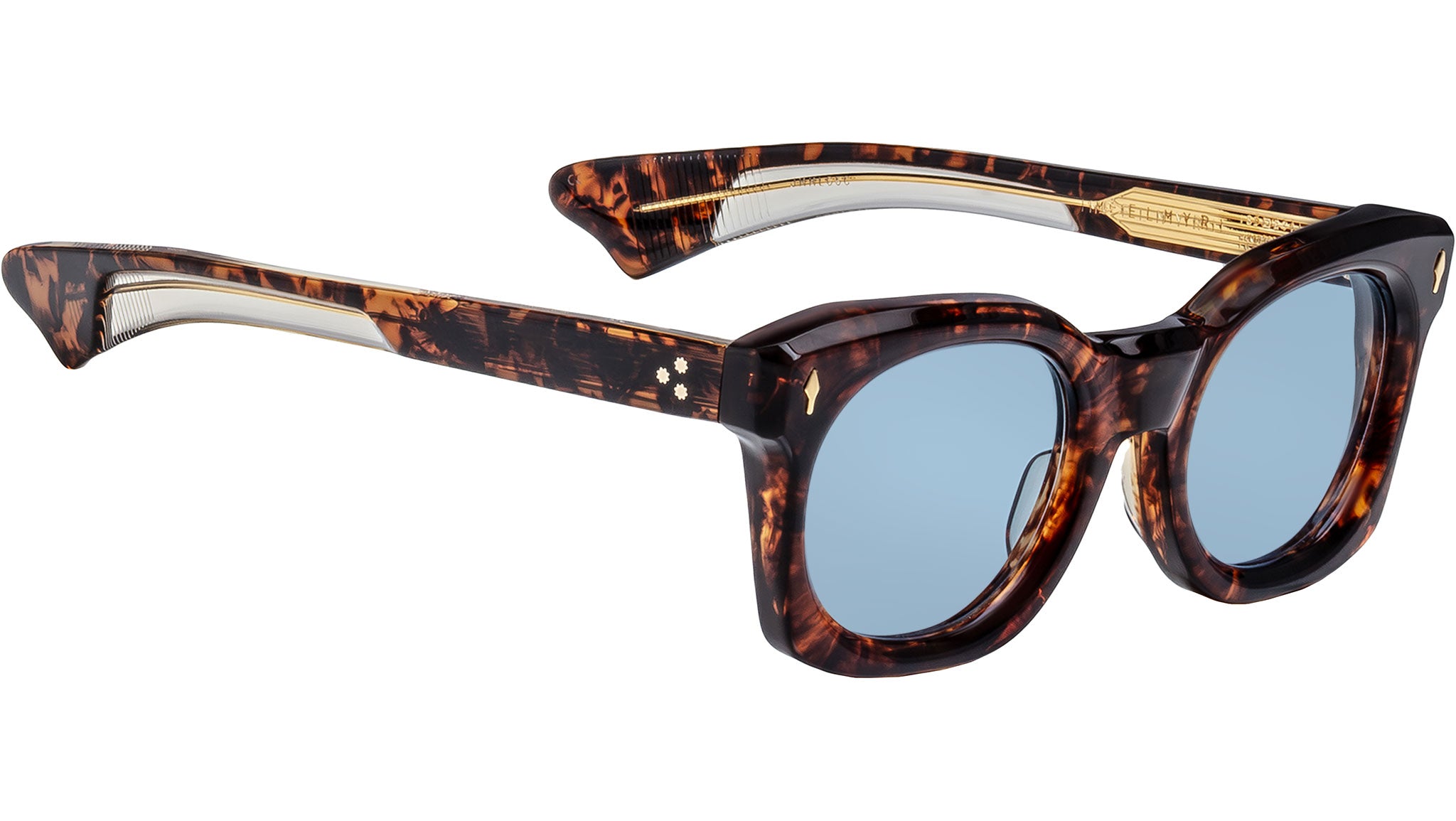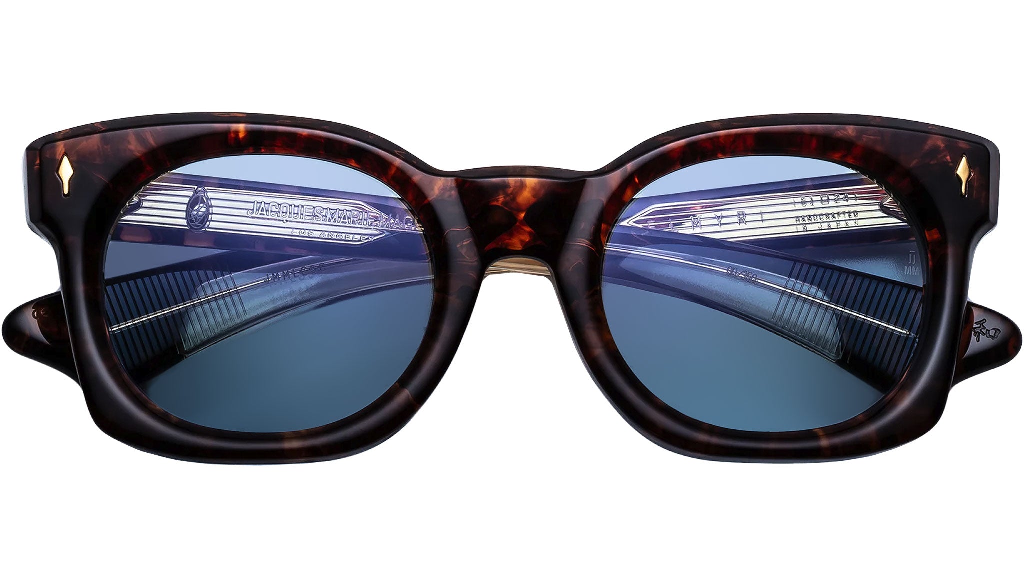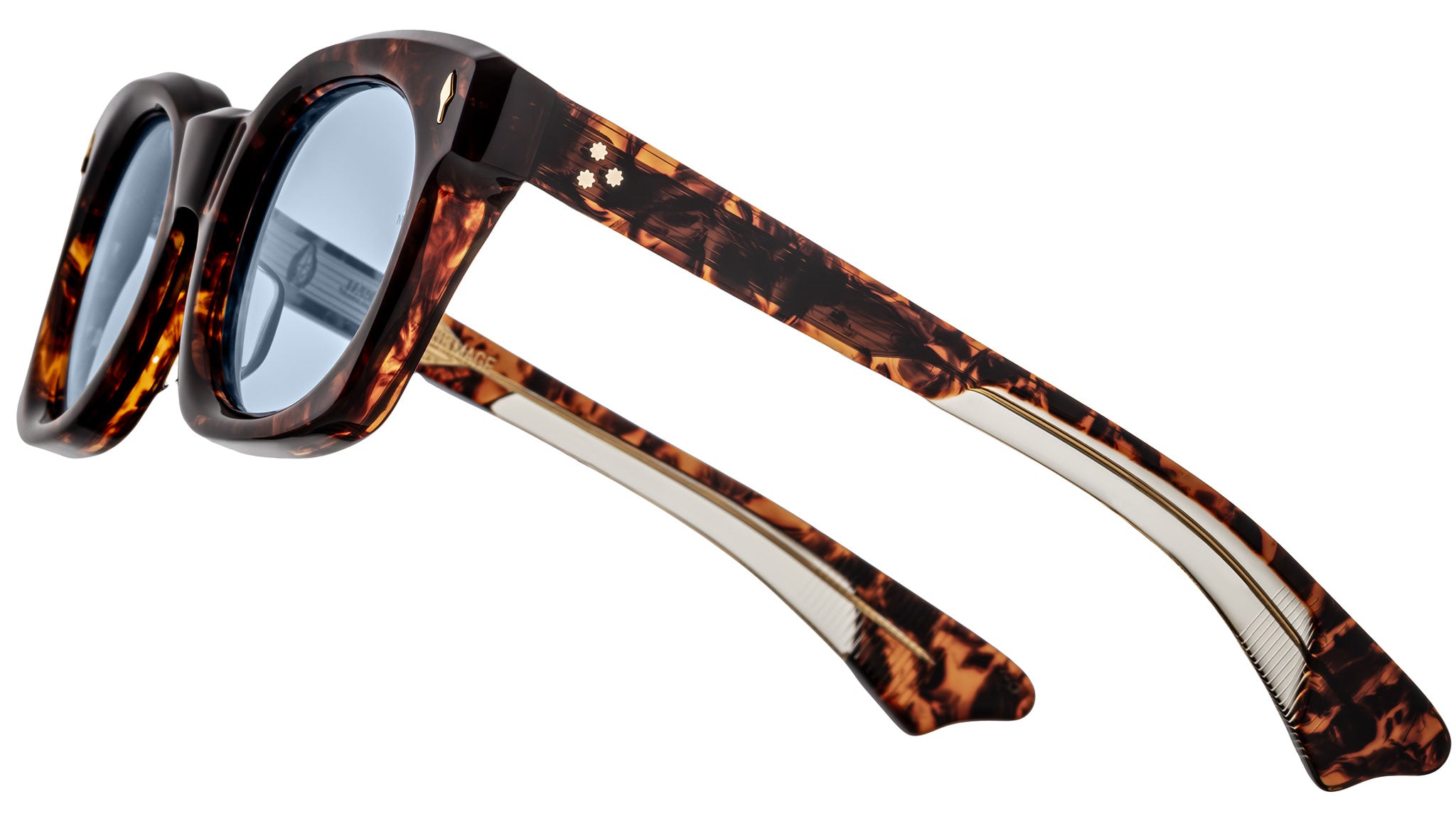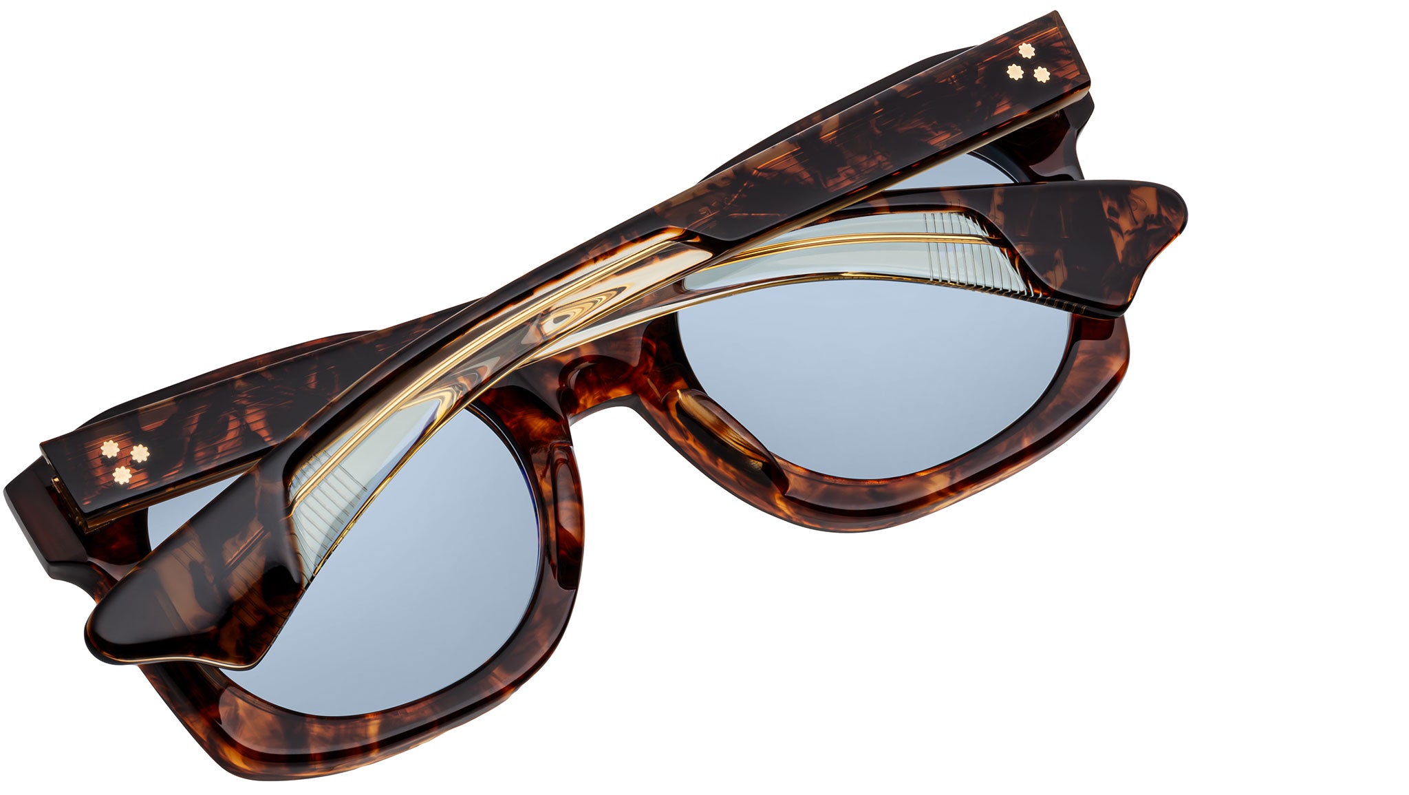 Havana 10mm cured cellulose acetate frame with custom double-laminated acetate temples featuring precious metal hardware, dark gold-finished signature arrowhead front pins, inner-exposed dark gold-finished 'Classic' wirecores, custom stainless steel 7-barrel hinges finished in dark gold with Art Deco hairline details, powder blue Armorlite 4-base lenses with backside anti-reflective treatment.