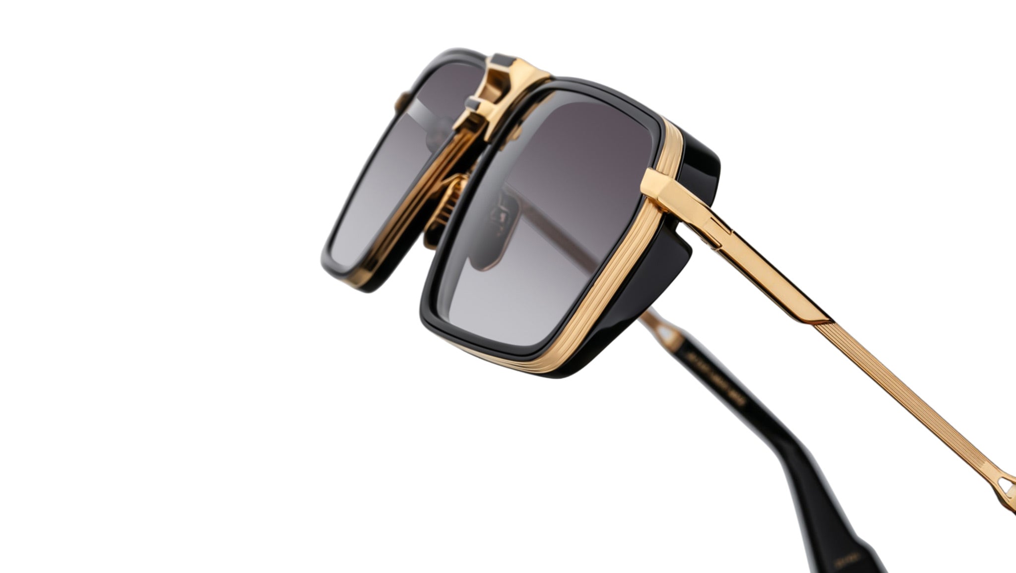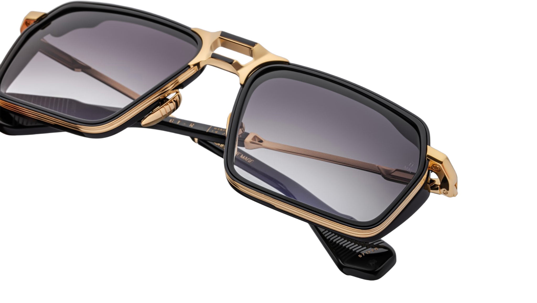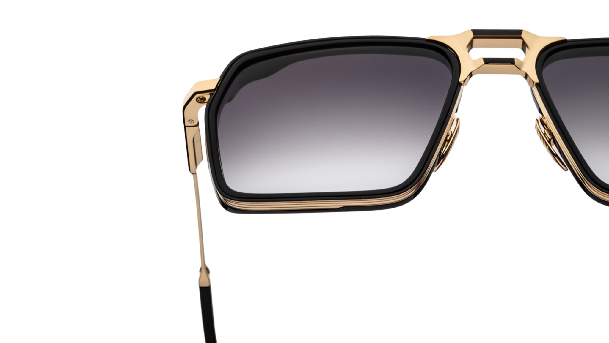Moon gold 100% beta titanium frame with 11mm black cured cellulose acetate inserts and black gradient lenses. Moon gold hairline-engraved titanium temples with acetate tips. Moon gold tension-secured custom 917 hinge. Black acetate eyerim insert. Custom nose pads with logo and hairline engraving. Crescent gradient CR-39 4-base lenses with backside anti-reflective treatment. 100% UV protection.