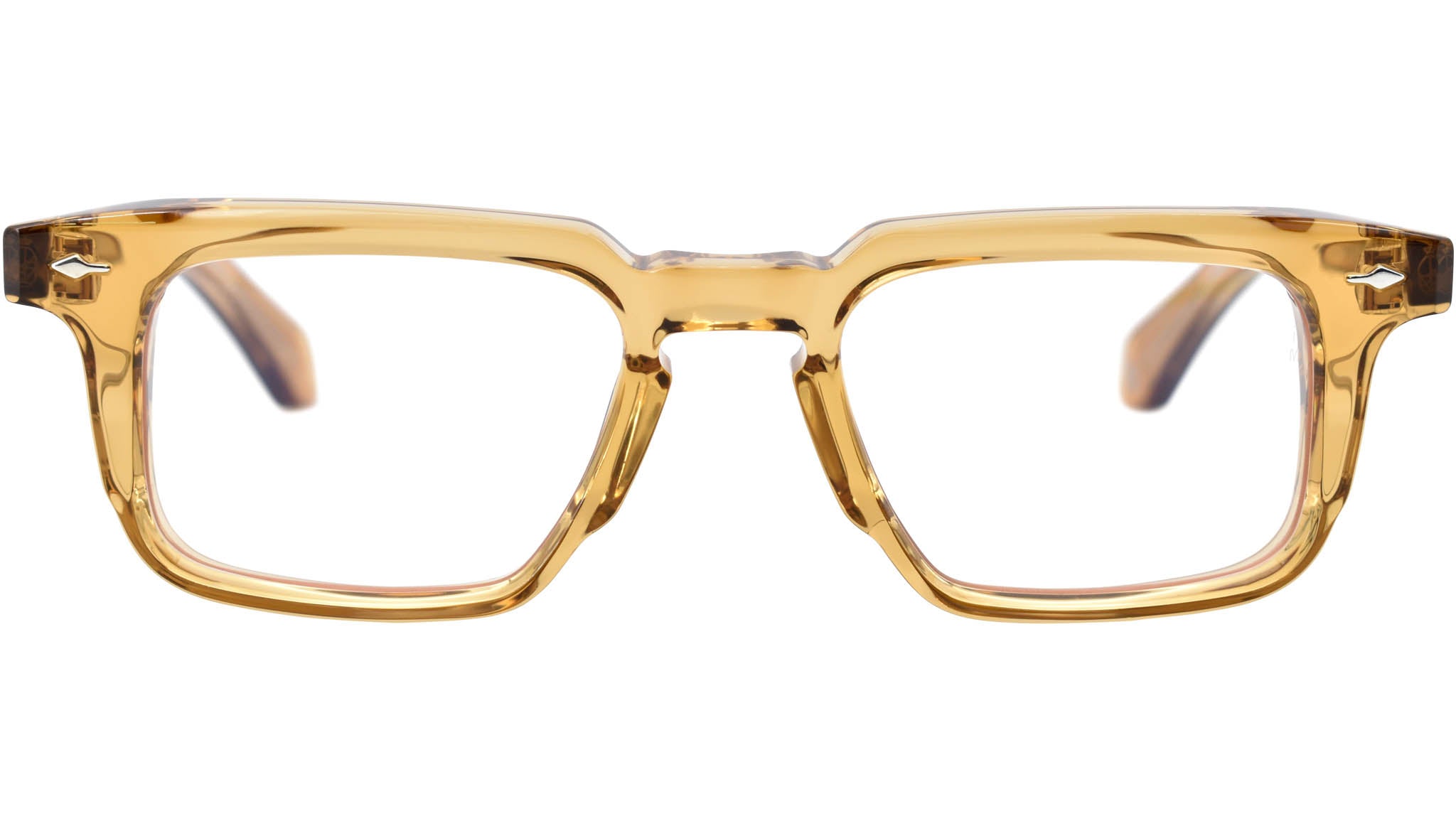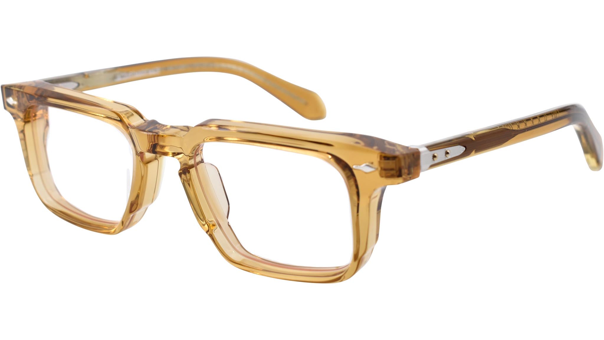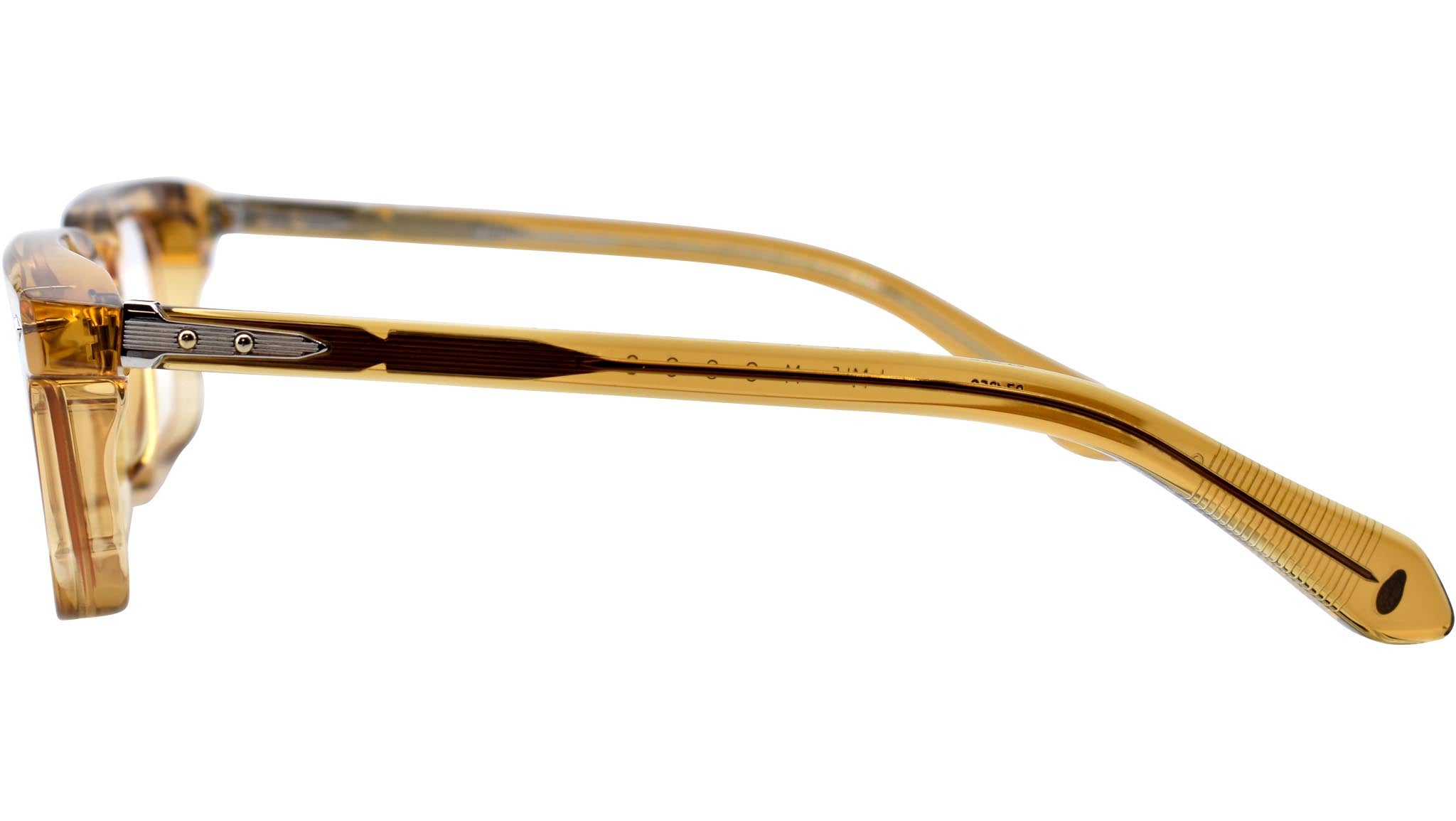 Jacques Marie Mage Moscova Ocre RX. An astute optical expression comprised of a strong rectangular lens shape, robust monoblock titanium hinge with JMM logo, and wirecore temples with signature hairline engraved details. Limited production batch of 350 pieces.