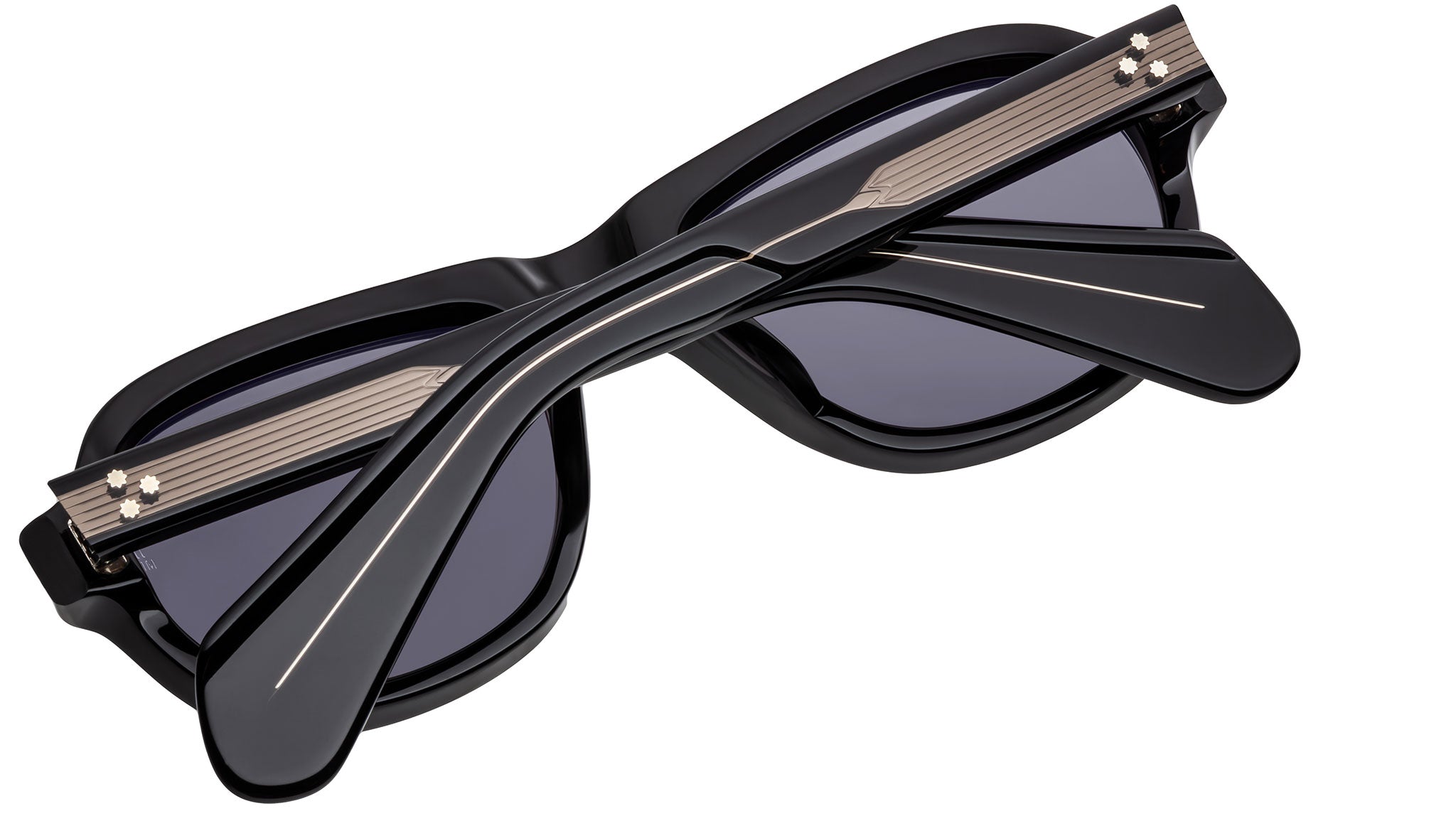 Black 10mm cured cellulose acetate frame with custom double-laminated acetate temples featuring precious metal hardware, gunmetal signature arrowhead front pin, exposed gunmetal classic wirecore, silver tension-secured custom 7-barrel hinge, charcoal CR-39 6-base lenses with backside anti-reflective treatment.