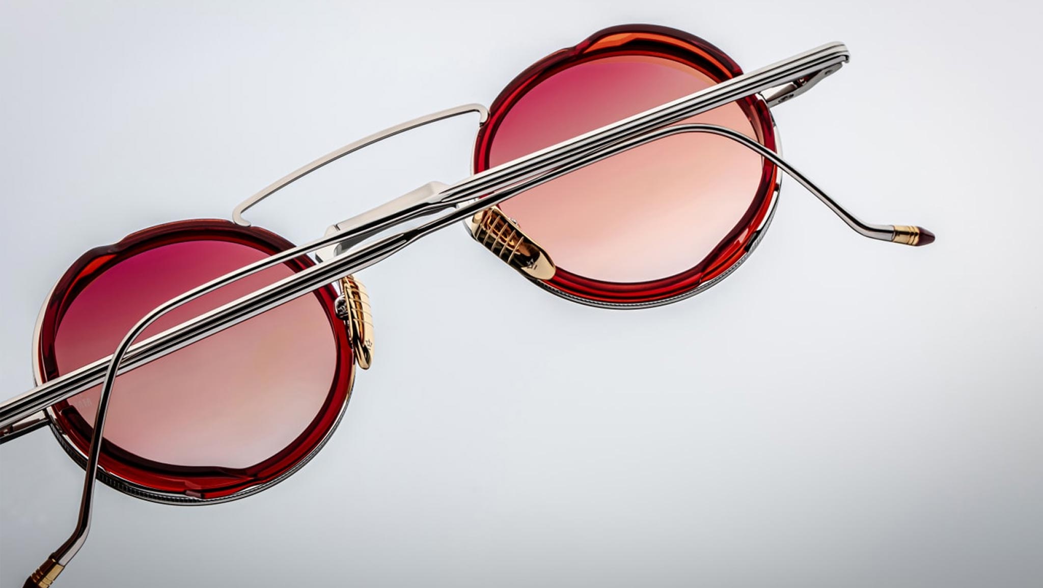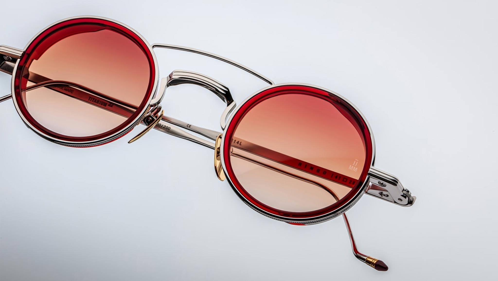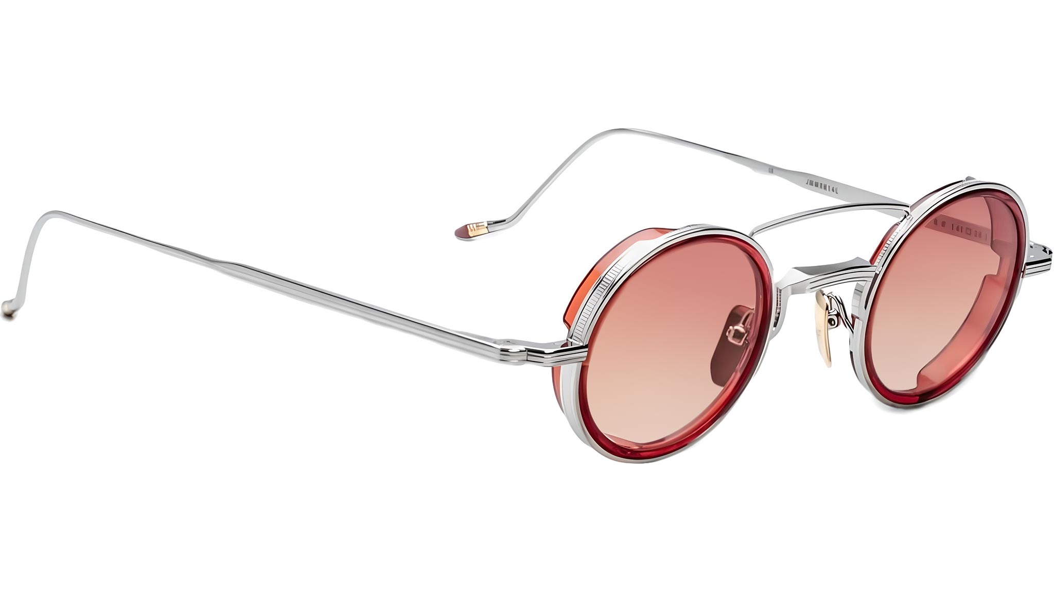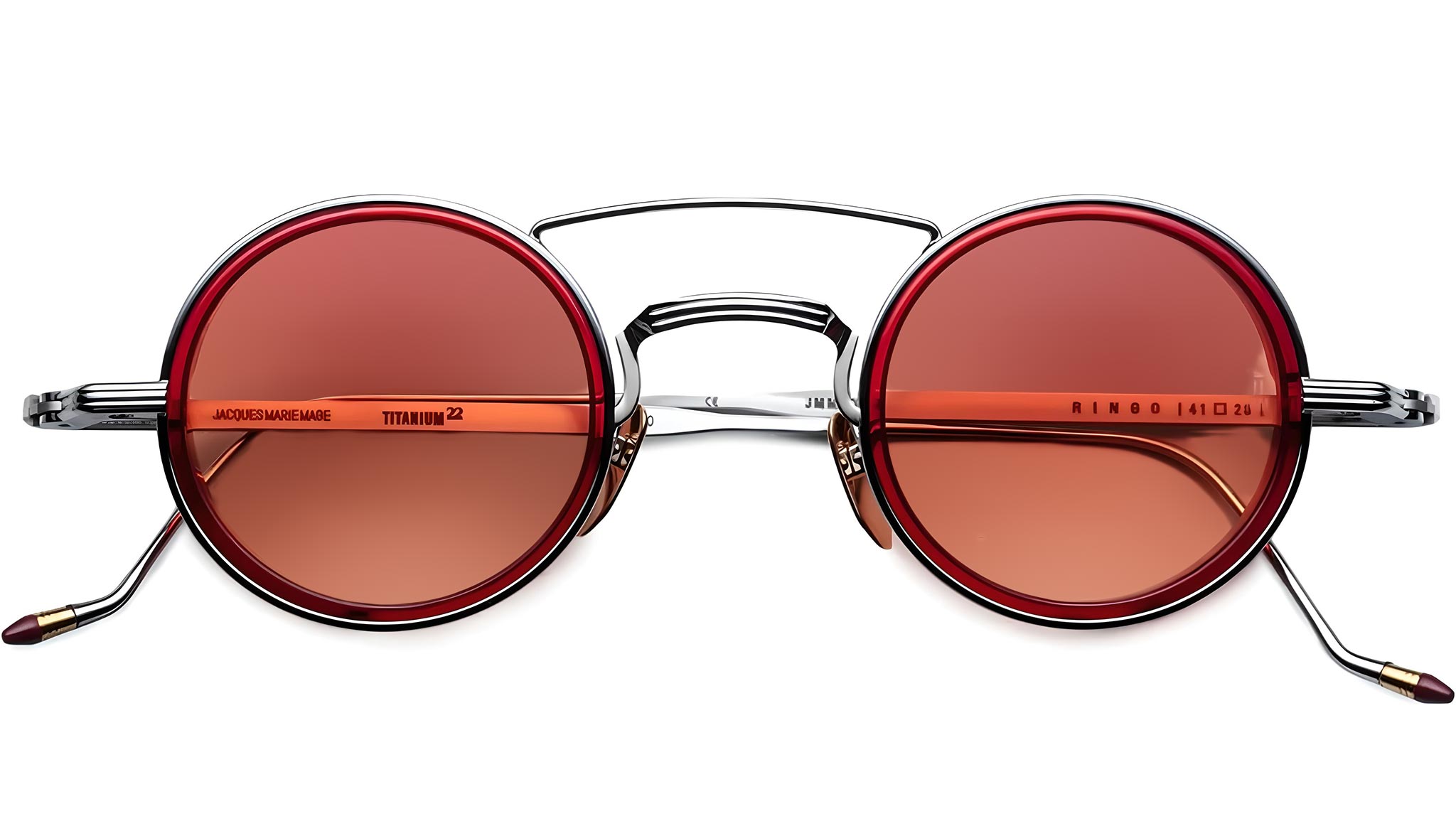 A sophisticated silver 100% beta titanium frame paired with striking red glow tri-gradient CR-39 2-base lenses featuring backside anti-reflective treatment. Adorned with crystal red acetate eyerim inserts, custom silver hairline hinges, and burgundy epoxy temple tips. Includes custom nose pads with logo and hairline engraving. Circular frame design offering 100% UV protection, merging bold aesthetics with premium craftsmanship.