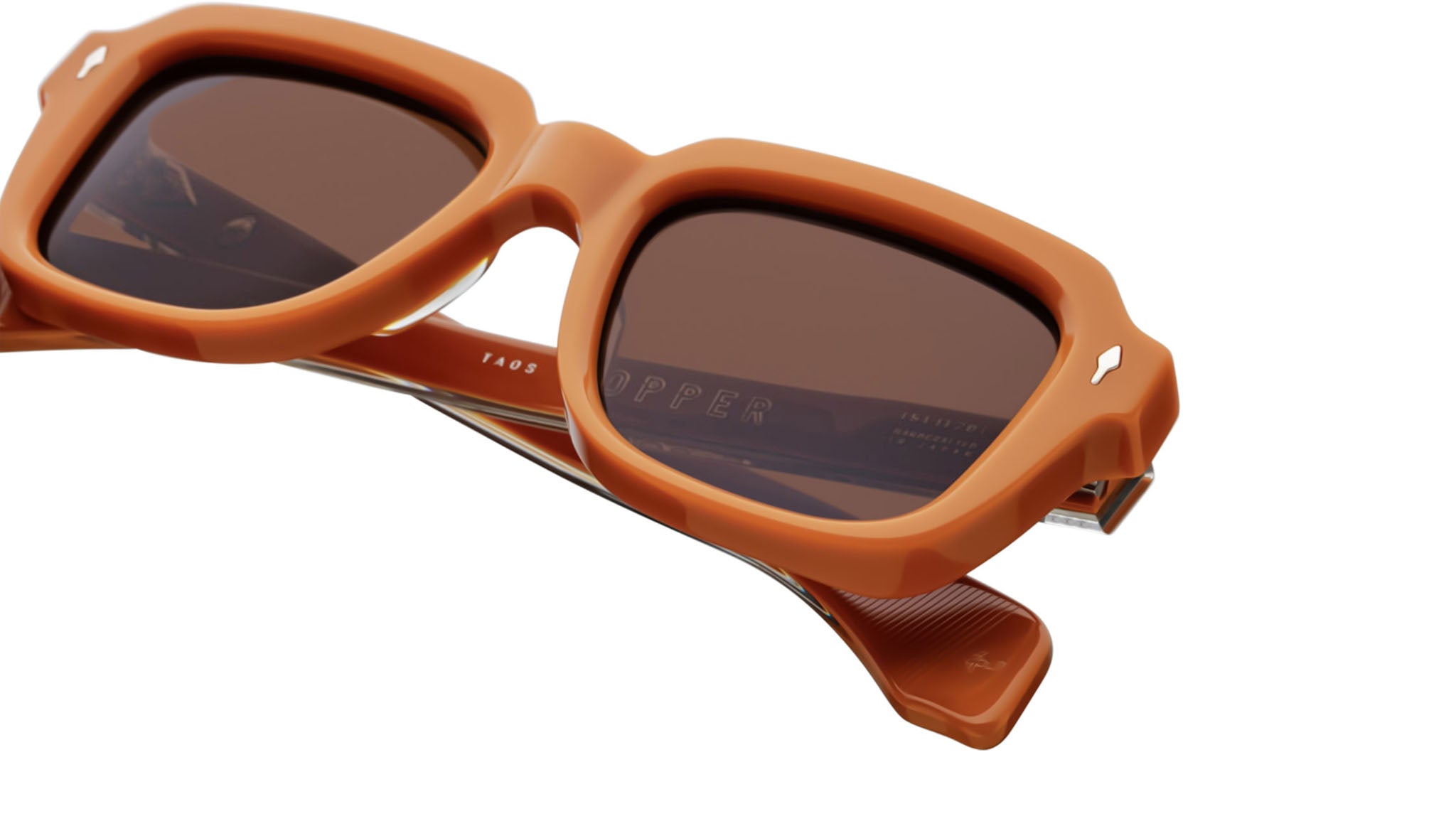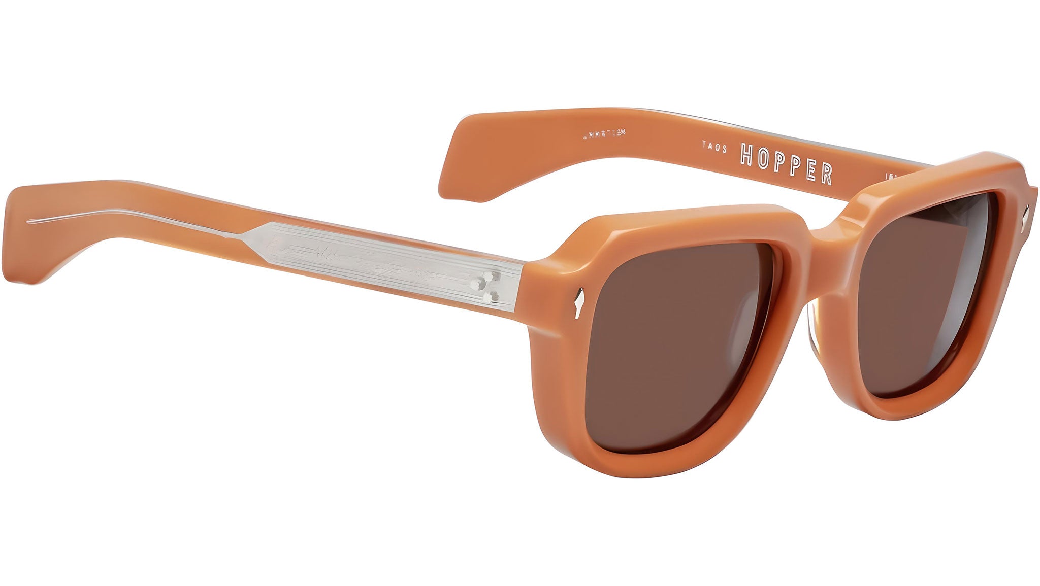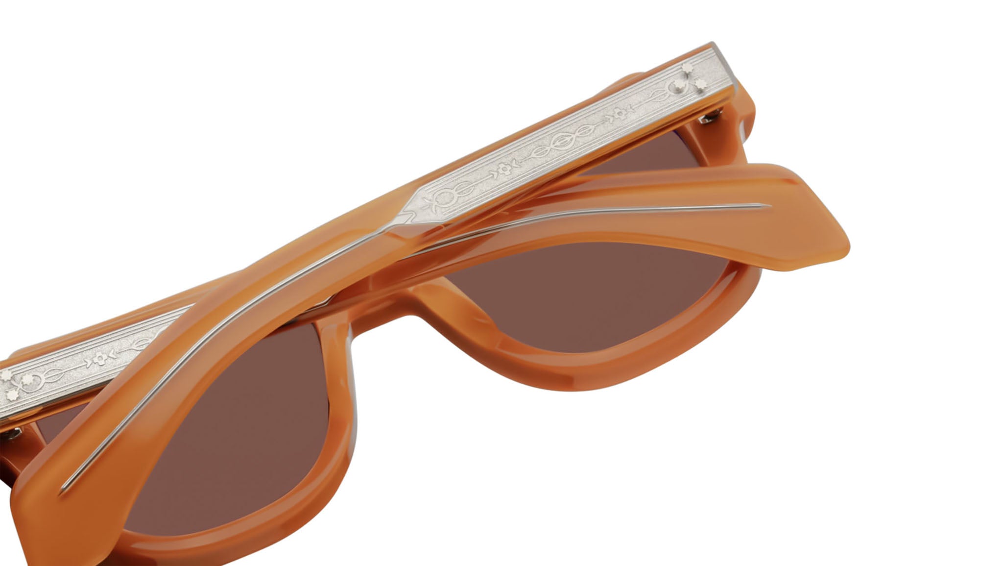 Orange 10mm cured cellulose acetate frame with custom double-laminated acetate temples and brown lenses. Silver arrowhead front pin, exposed silver wire core featuring custom Hopper filigree, and silver tension-secured custom 7-barrel hinge. Sienna CR-39 6 base lenses with backside anti-reflective treatment ensure clarity and comfort. Frame shape: square. Provides 100% UV protection.