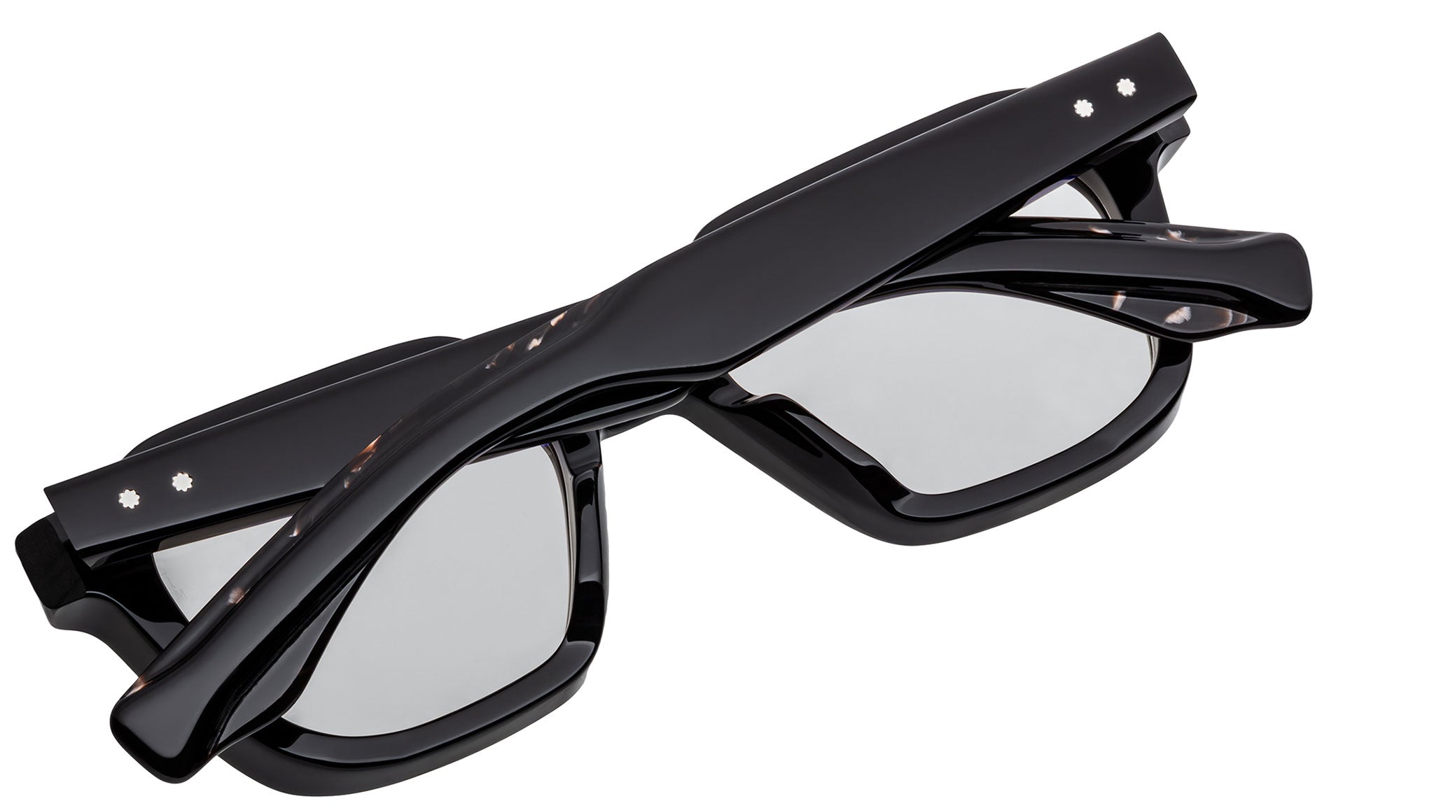Black 10mm cured cellulose acetate frame with custom double-laminated acetate temples featuring precious metal hardware and light brown lenses. Sterling silver signature arrowhead front pins, hidden silver-finished 'Classic' wirecores, custom stainless steel 5-barrel hinges finished in silver with Art Deco hairline details, Superlight Brown Armorlite 4-base lenses with backside anti-reflective treatment.