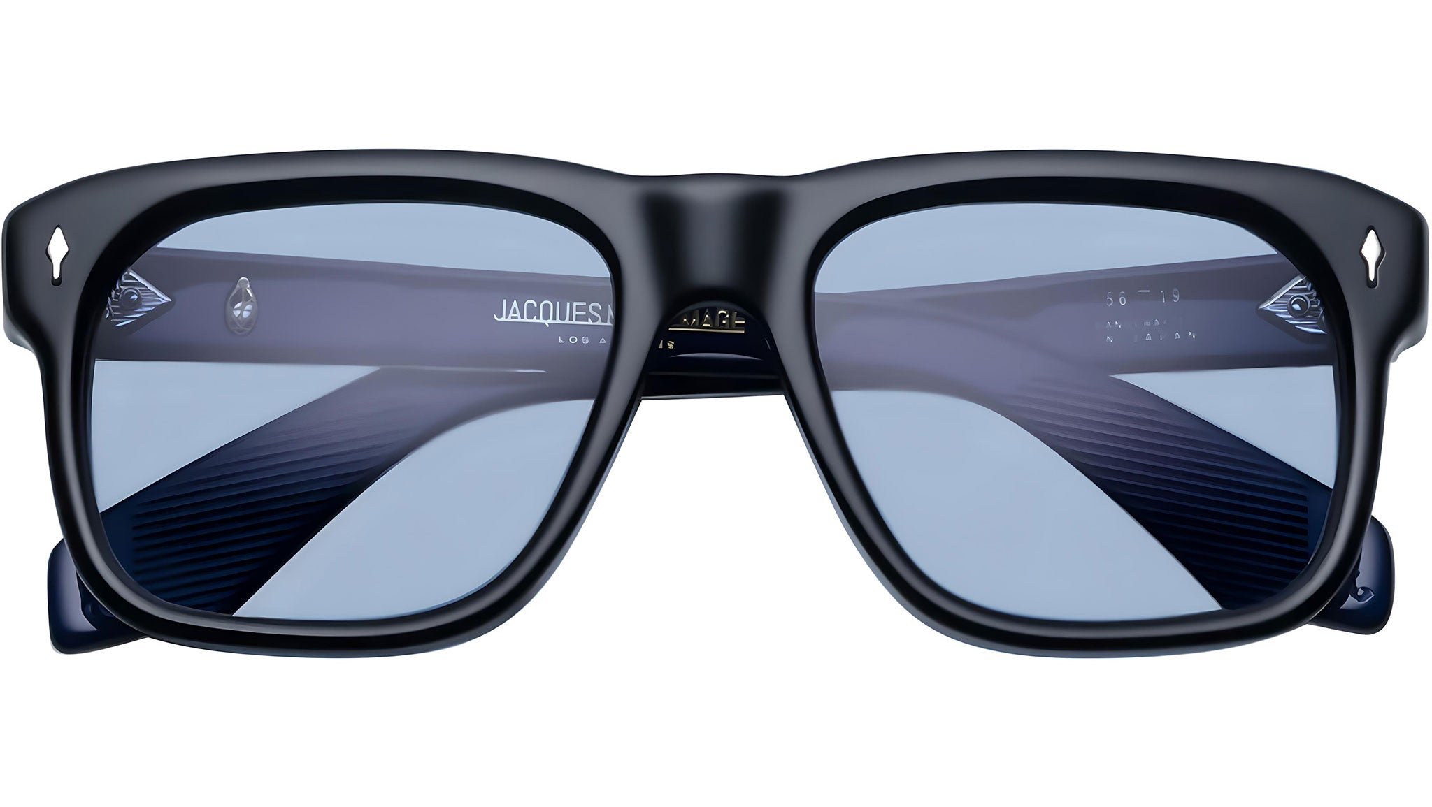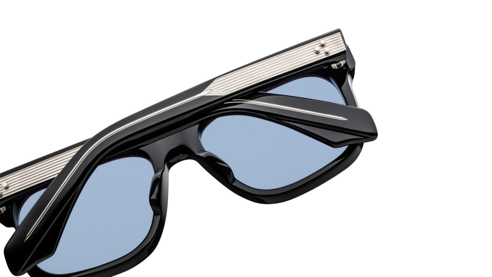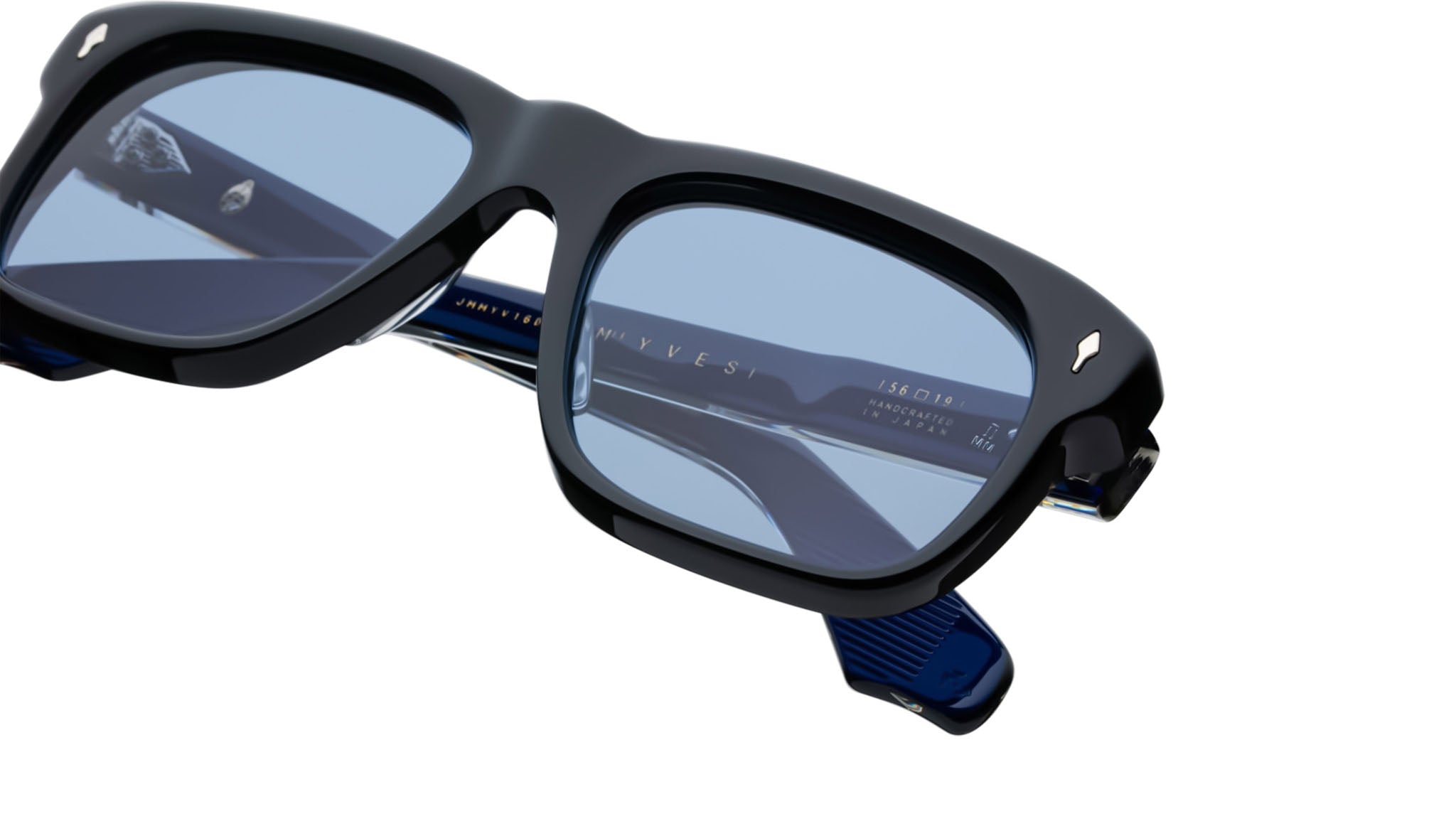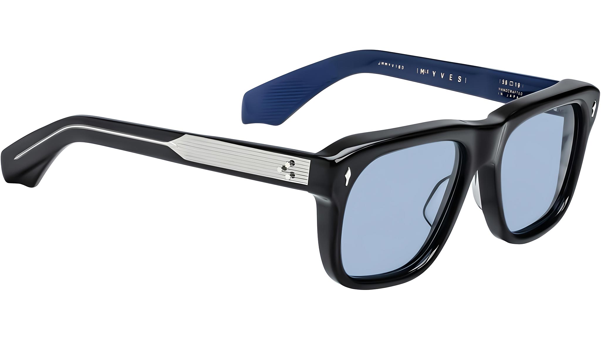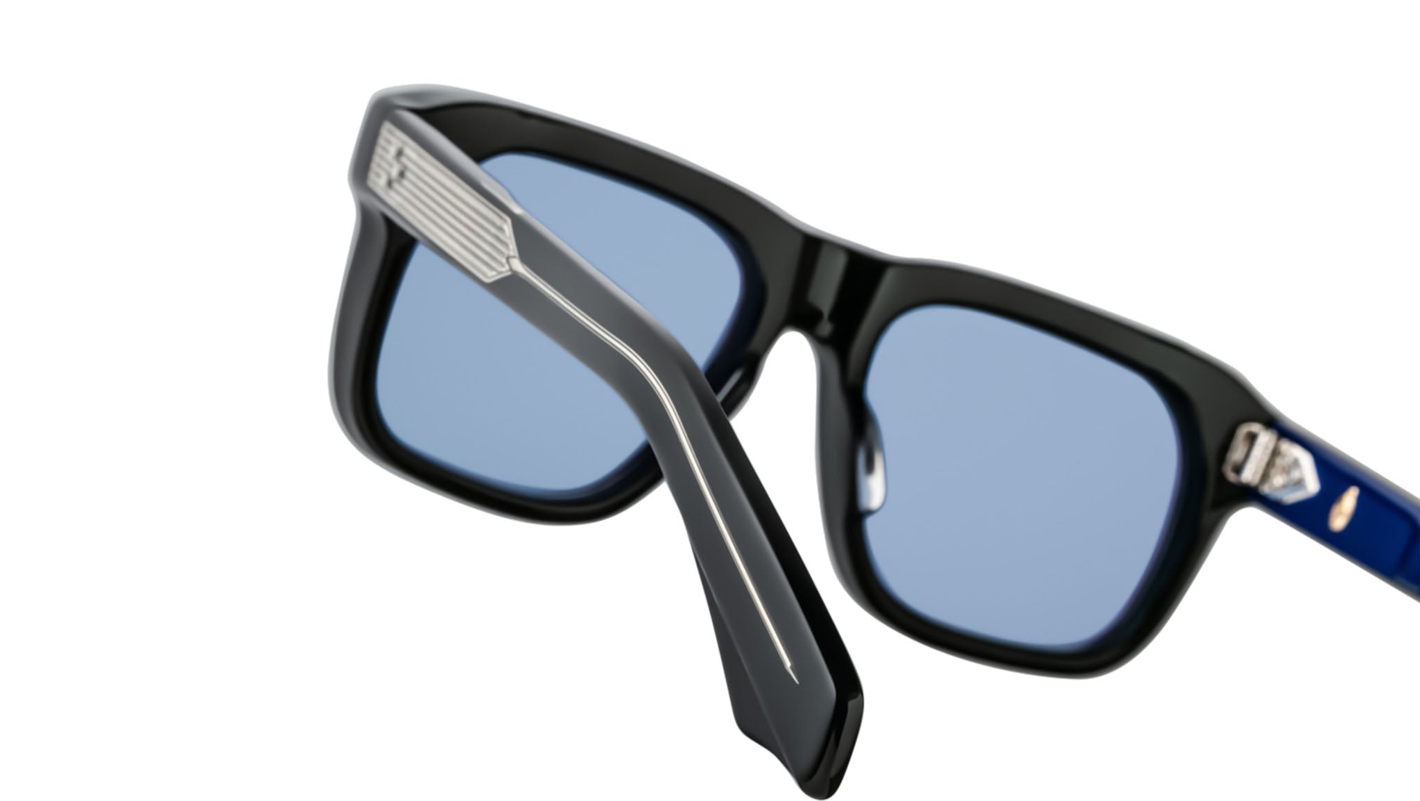 LIMITED PRODUCTION BATCH OF 500 PIECESBlack 10mm cured cellulose acetate frame with custom double-laminated acetate temples and blue lenses. Silver signature arrowhead front pin, exposed silver temple with custom hairline-engraved wirecore, and silver tension-secured custom 7-barrel hinge with spur-shaped rivets enhance the design. Cerulean CR-39 4 base lenses with backside anti-reflective treatment ensure clarity and comfort. Frame shape: square. Provides 100% UV protection.