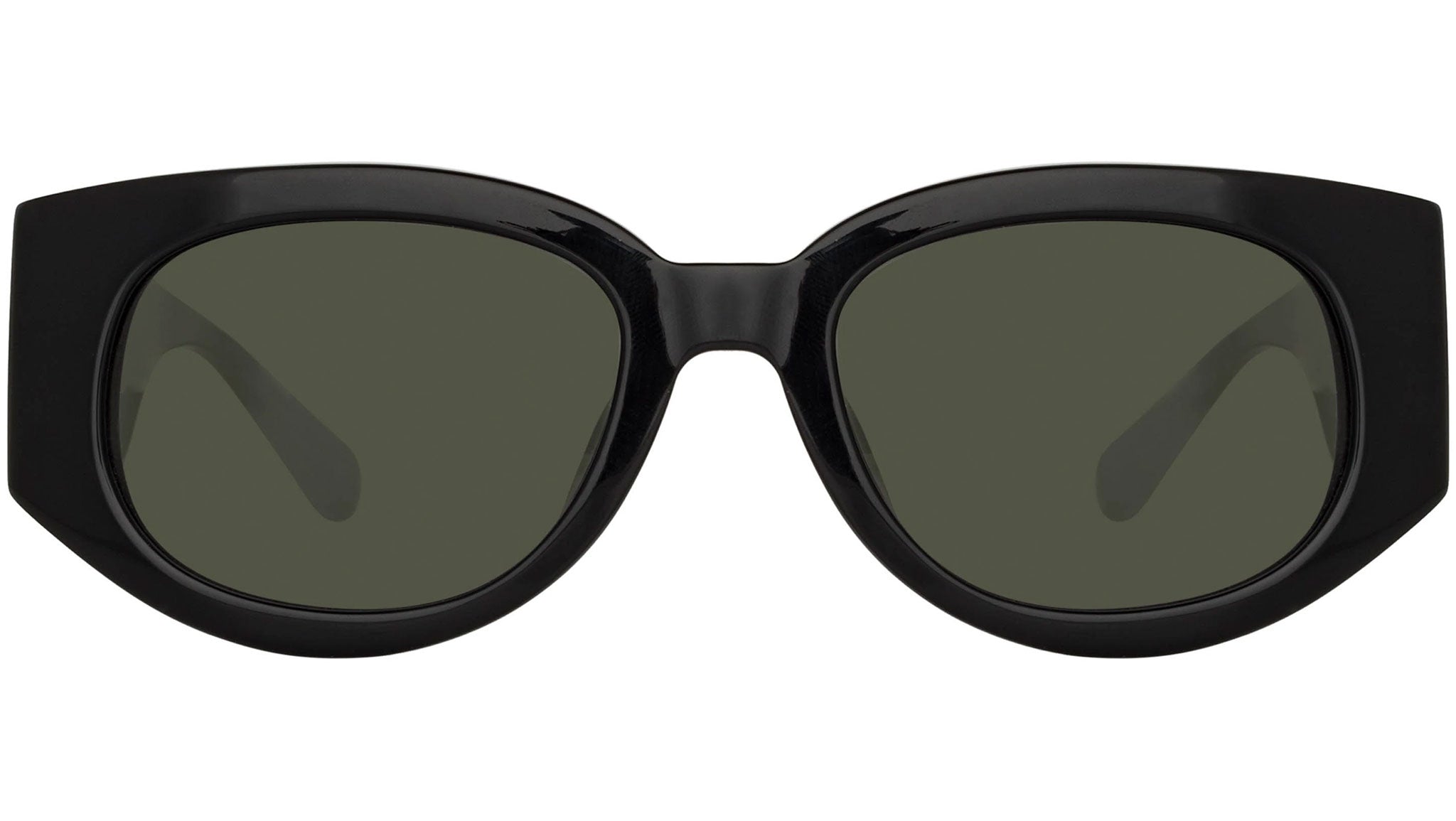 Formed from recycled black acetate these sculpted sunglasses from the Linda Farrow collection are hand polished for a glossy finish. The rounded D-frame style features a gold-plated titanium eyelet set into the temple monogrammed with London 1970 to mark the founding of the brand. The style is fitted with solid grey ZEISS technology lenses for optimum clarity and UV protection. Laminated nose pads and temple tips ensure a comfortable fit.