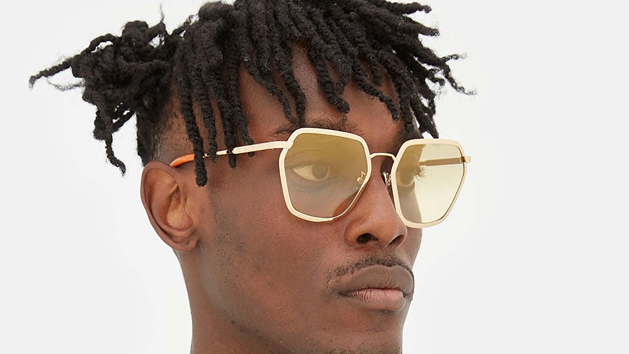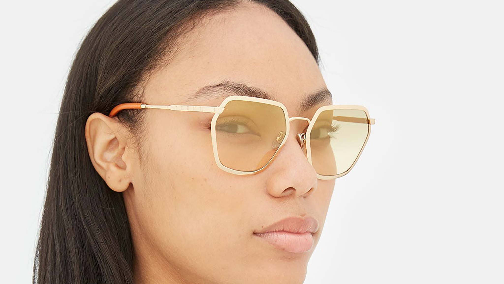 Designed exclusively for Marni, Great Noligwa Mine is a sophisticated metal silhouette characterised by an unexpected geometric shape and appealing oversized fit. It was inspired by a timeless vintage aesthetics, adapted for a contemporary style with a sharper, more streamlined design. The model’s distinctive lenses feature an asymmetrical hexagonal shape, encased within thick metal rims. A curved nose-bridge and sleek temples complete the piece. This model comes with gold metal finish and fading smoky yellow lens. Sizes: R Lens Width: 59 mm. Frame Front: Frame Side: 145 mm. Product Code Size R: 8HI