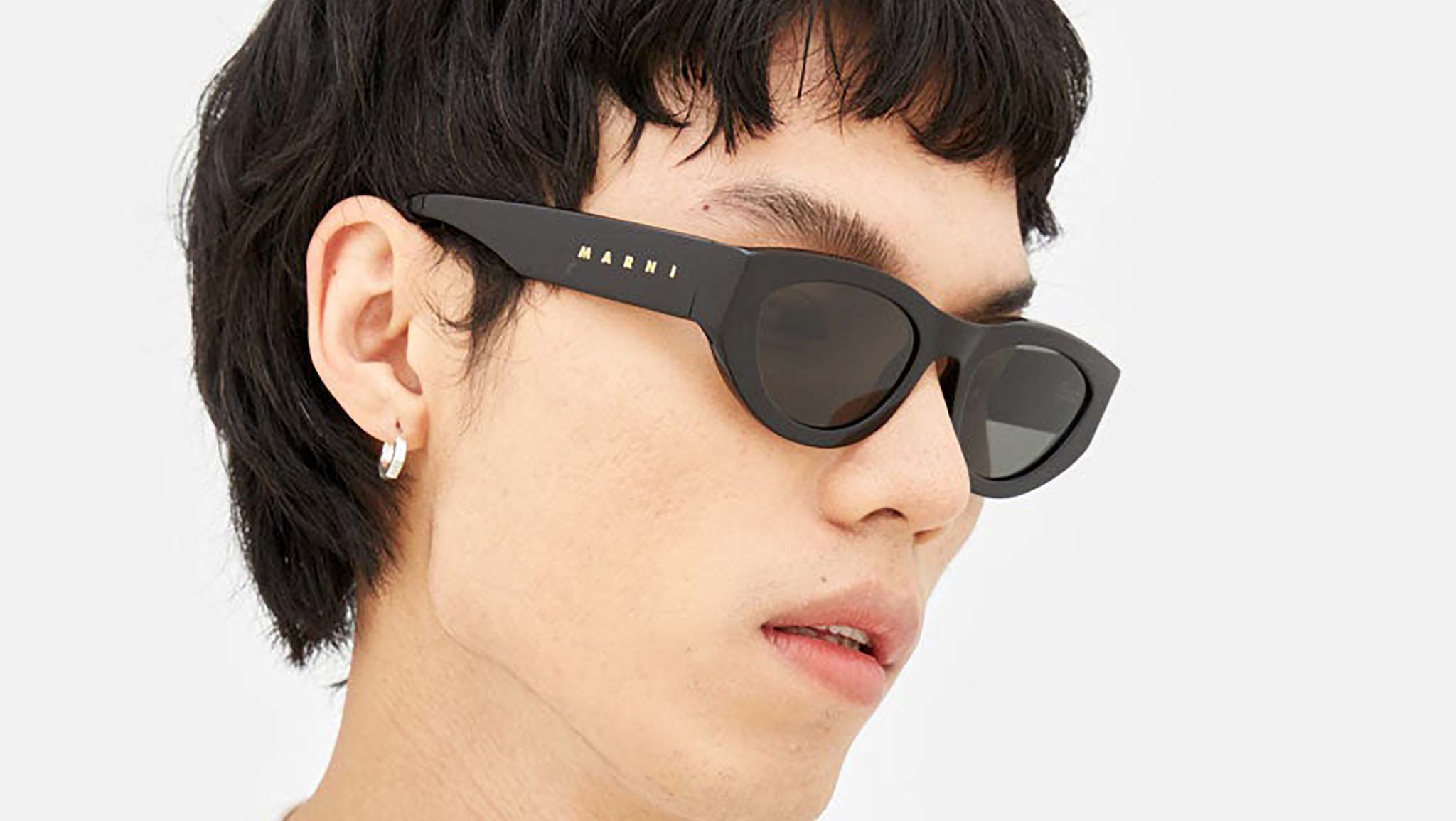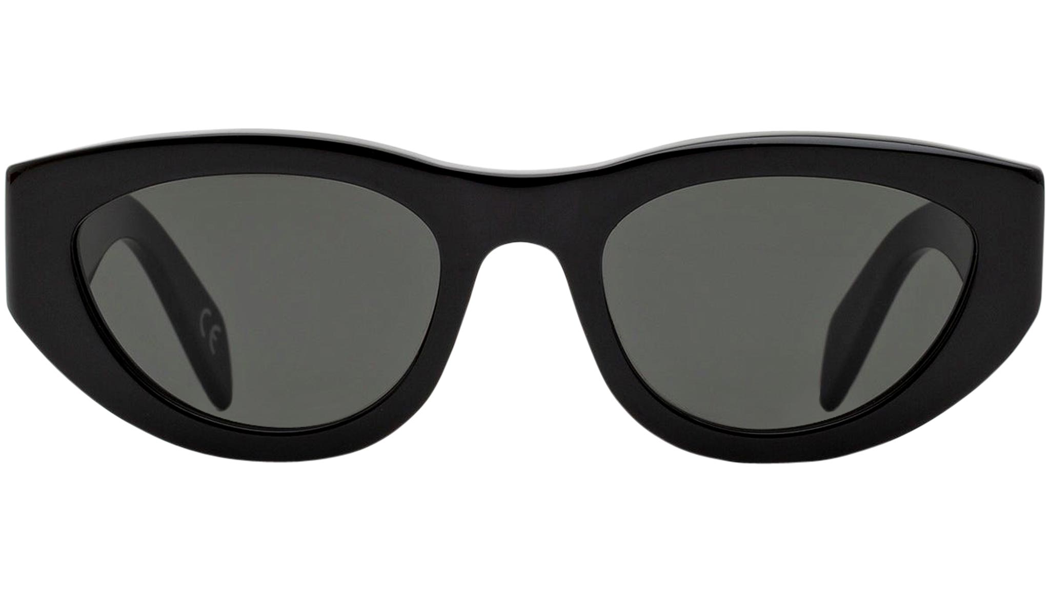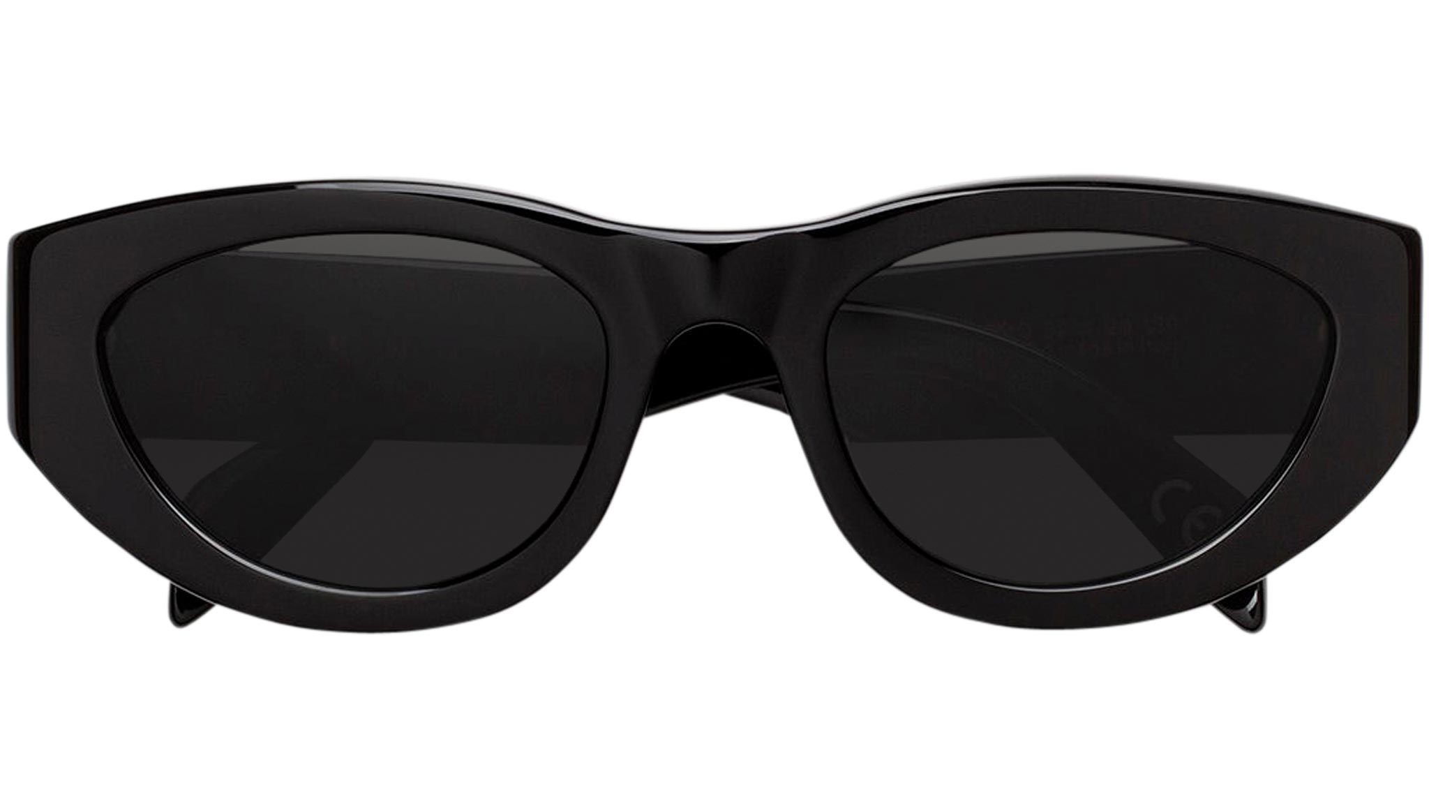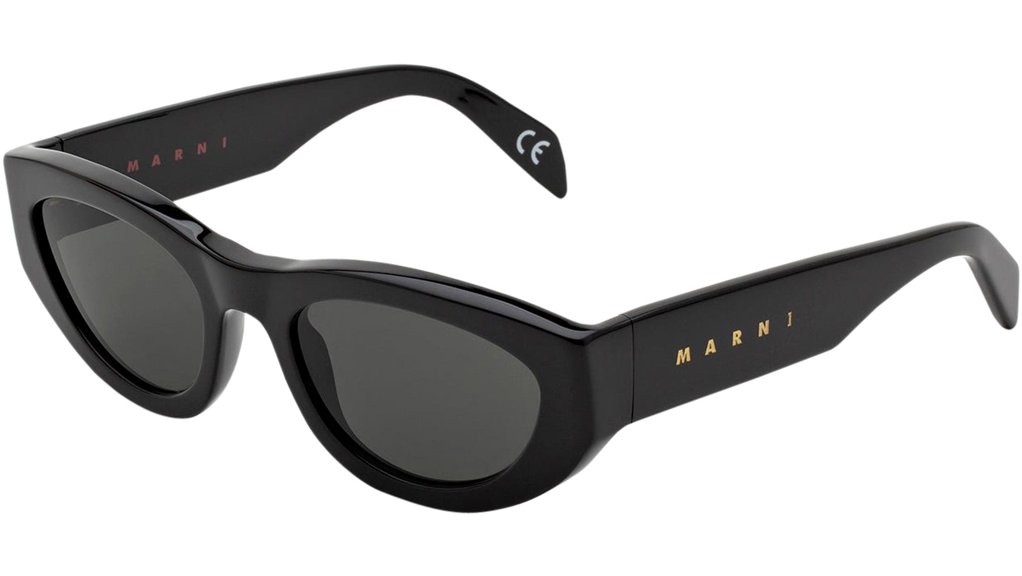 Designed exclusively for Marni, Rainbow Mountains is a fresh contemporary interpretation of classic cat-eye frames. The model features a rounded silhouette with carefully shaped rims encasing oval lenses. Thick temples are engraved with Marni logo in gold. This version comes in a black acetate and matching lenses. Sizes: R Lens Width: 52 mm. Frame Front: Frame Side: 145 mm. Product Code Size R: BMO