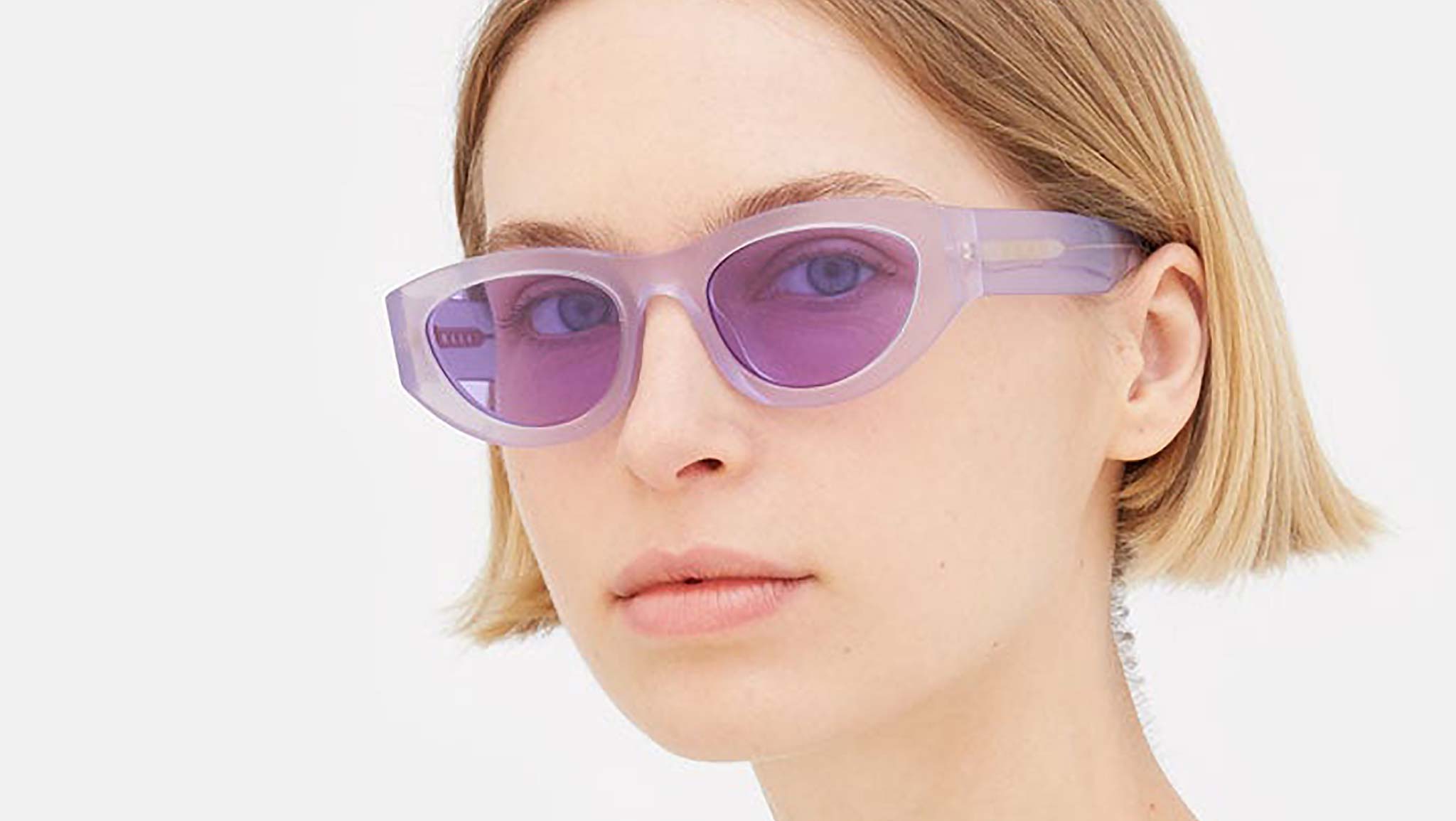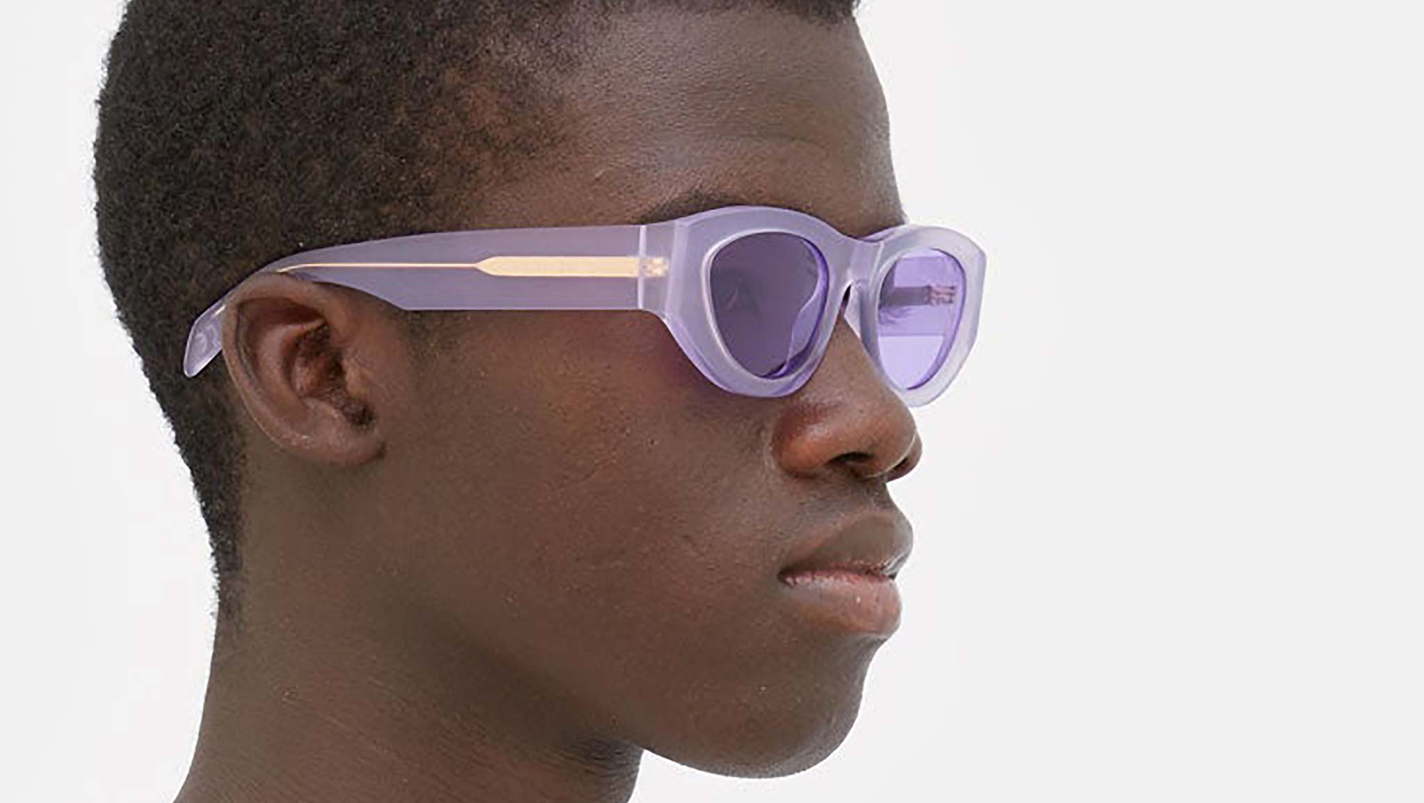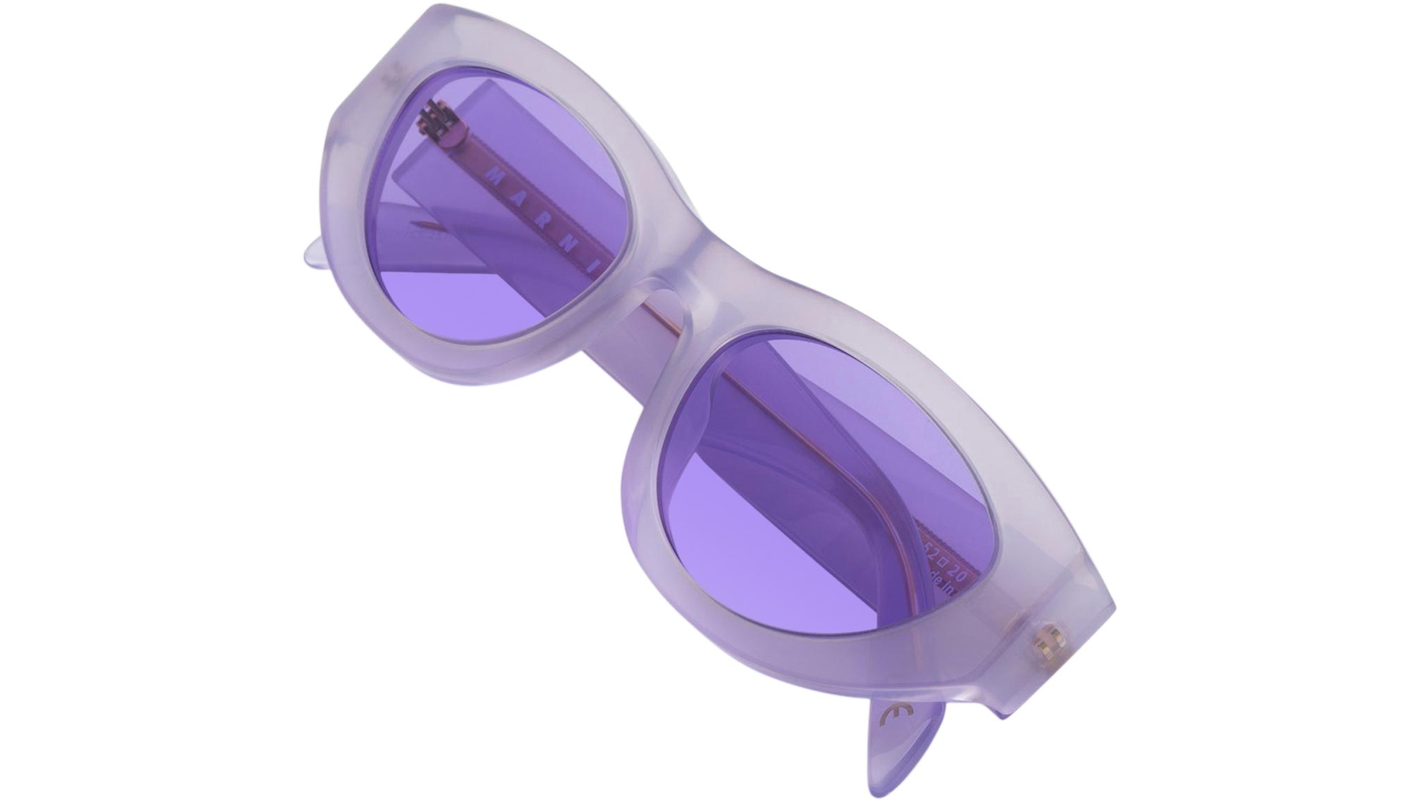 Designed exclusively for Marni, Rainbow Mountains is a fresh contemporary interpretation of classic feminine frames, reshaped for a more fluid, genderless approach to style. The model features a rounded silhouette with carefully shaped rims encasing oval lenses. Thick temples are engraved with Marni logo. This is a playful version that comes in a tinted purple acetate and matching lenses. Sizes: Lens Width: 52 mm. Frame Front: Frame Side: 145 mm.