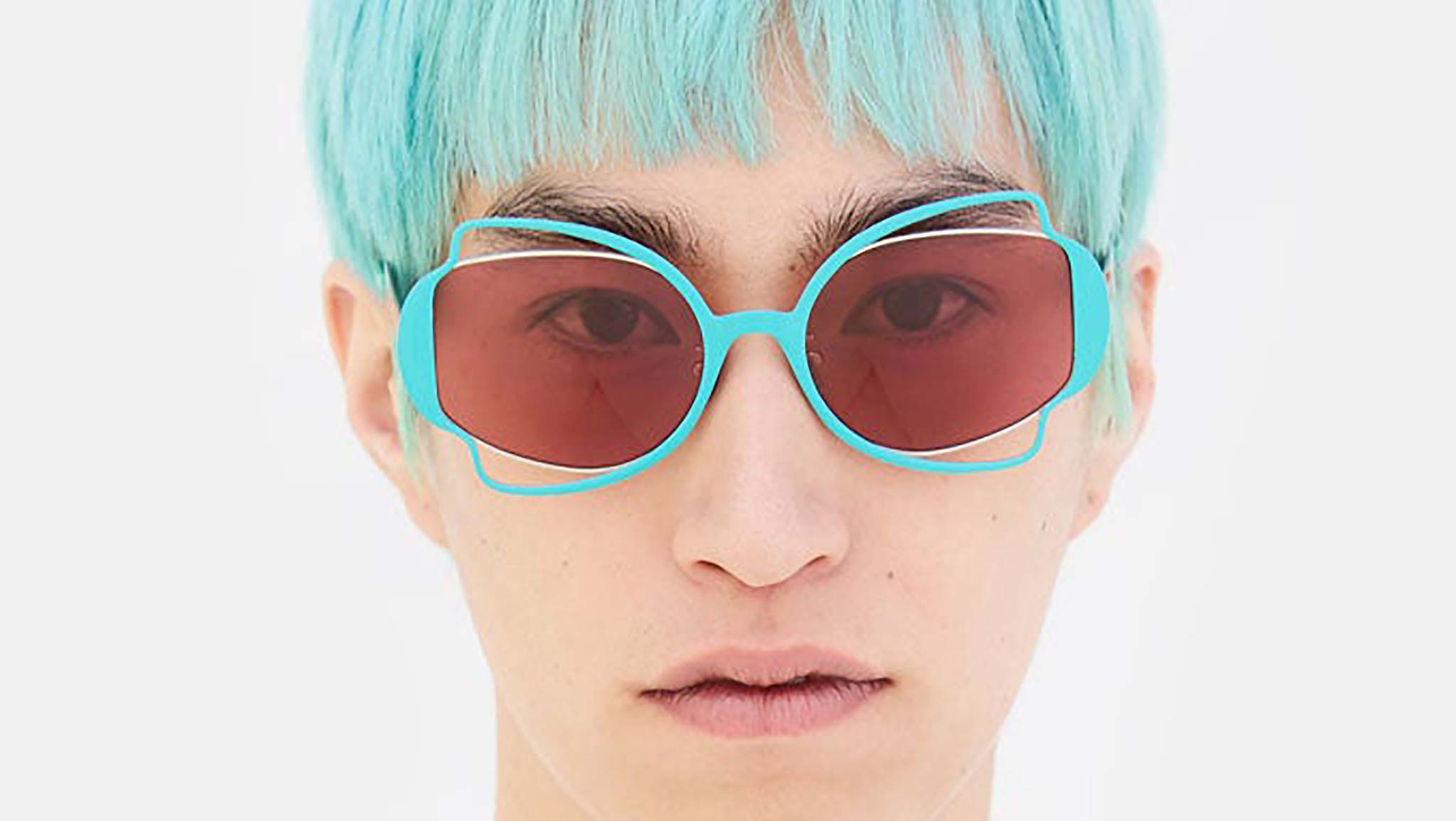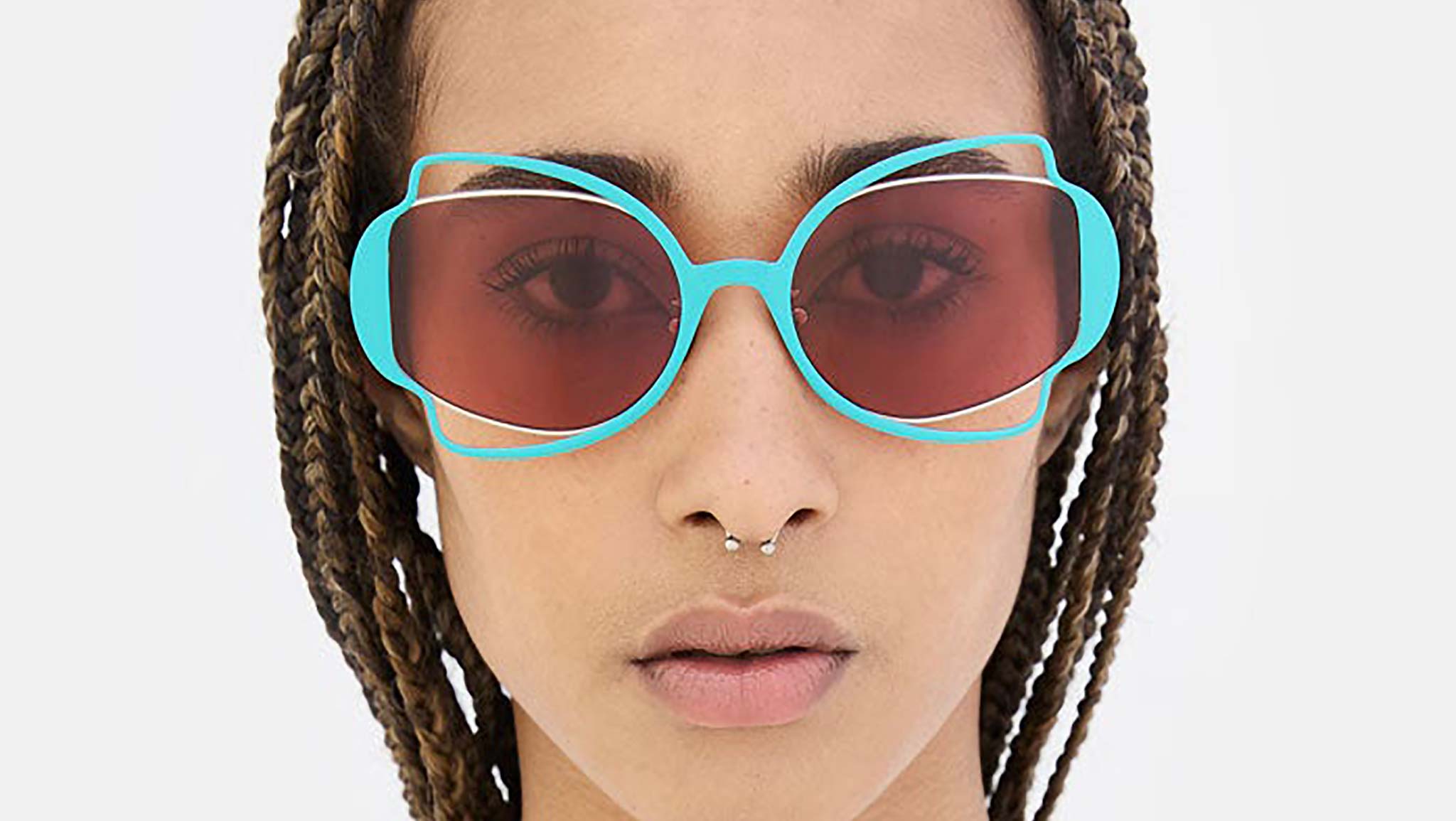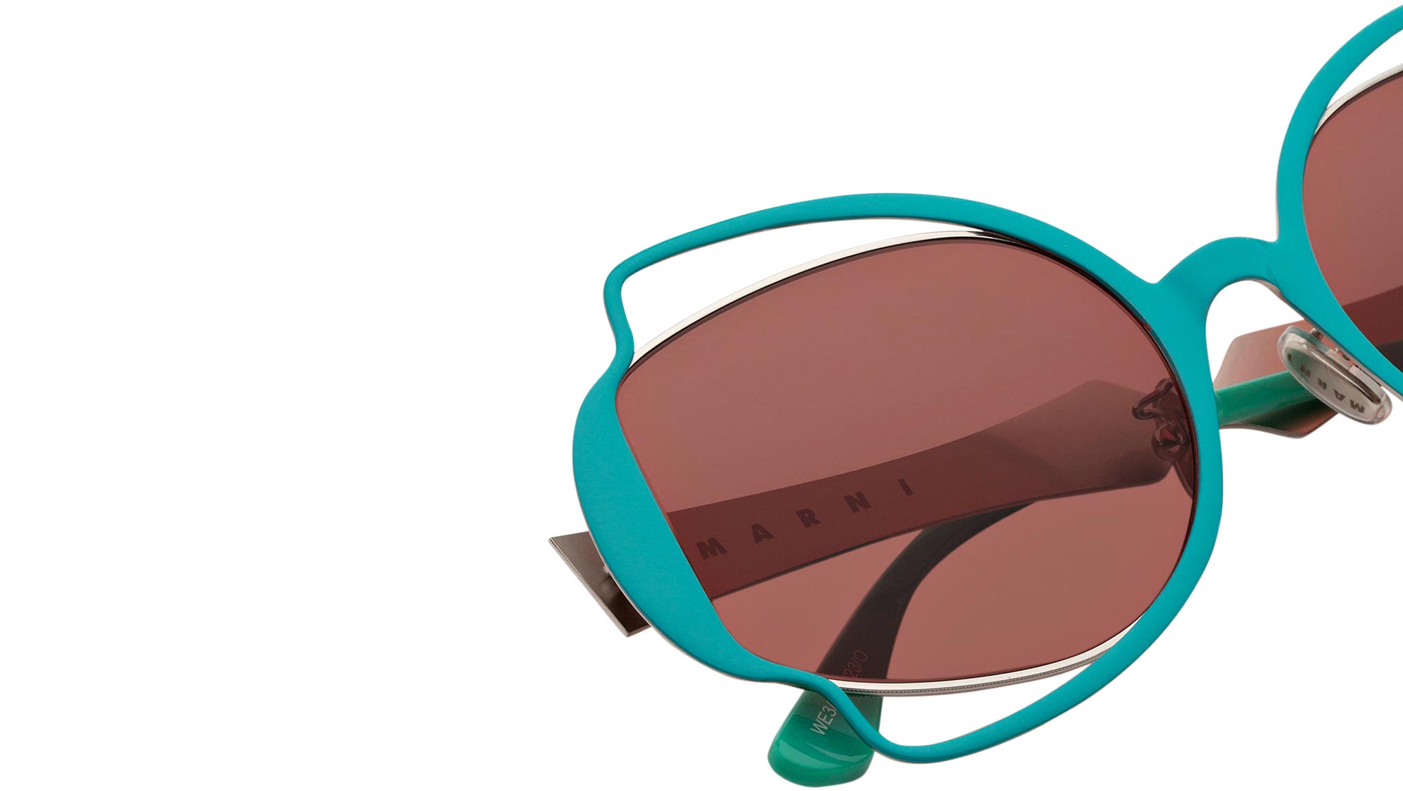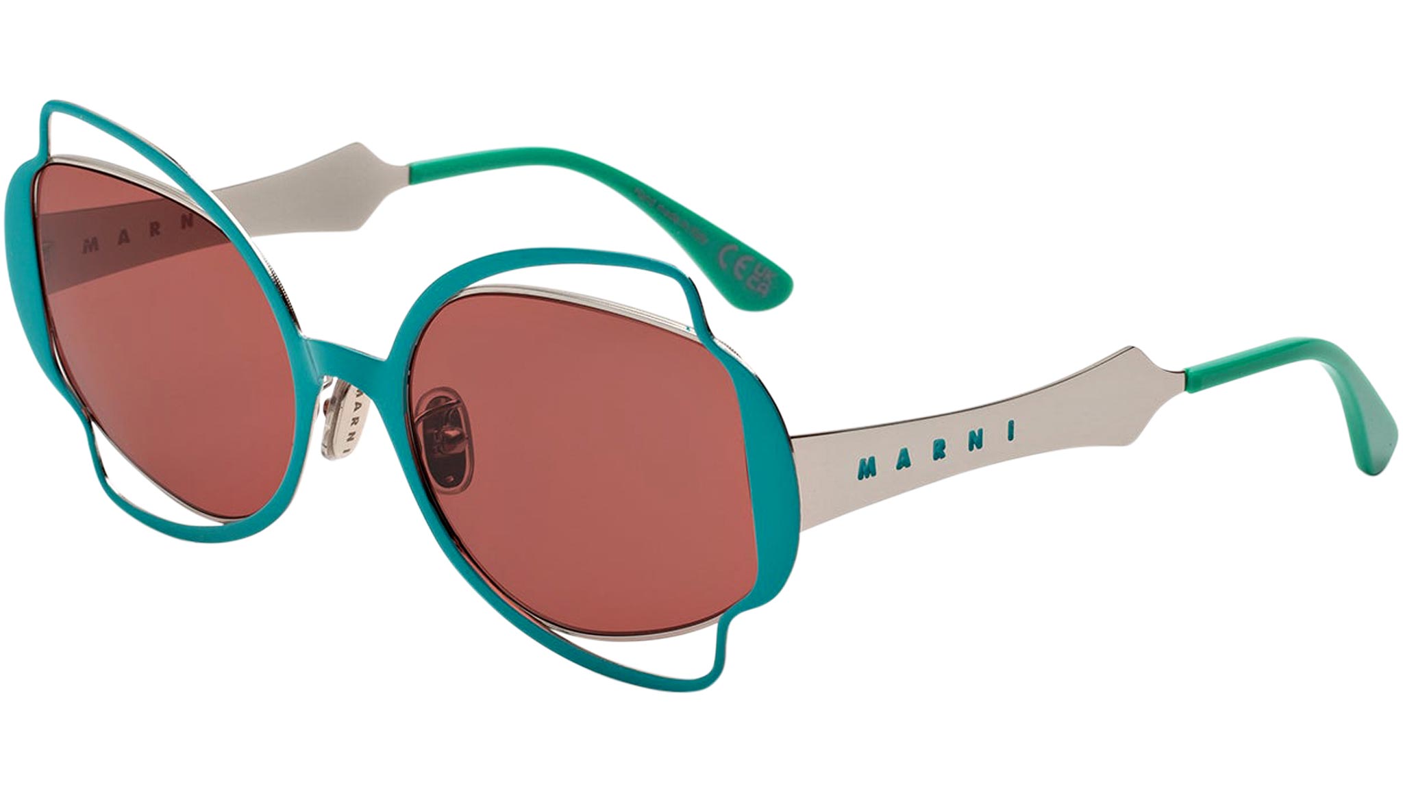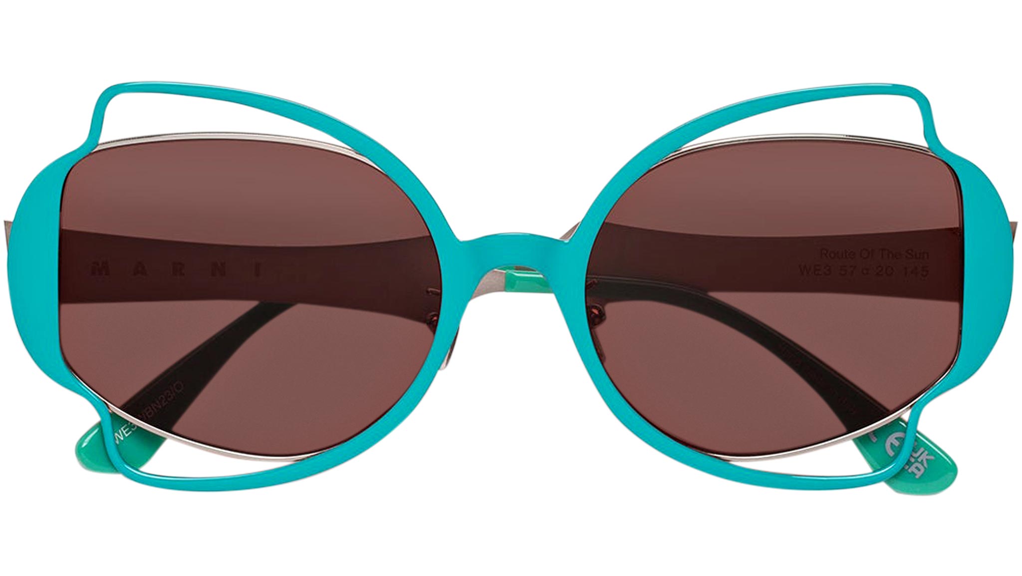 Designed exclusively for Marni, Route of the Sun is a playful oversized shape that features an elaborate metal construction. A thin sheet of metal has been cut to form a decorative silhouette, referencing floral, Art Deco pieces, on both the front and temples. Perforated detailing around the lenses gives this silhouette its distinctive character, with acetate temple tips added for comfort. The model comes with a hand-painted teal metal finish and matching acetate tips, with burgundy lenses. Sizes: R Lens Width: 60 mm. Frame Front: Frame Side: 130 mm. Product Code Size R: WE3