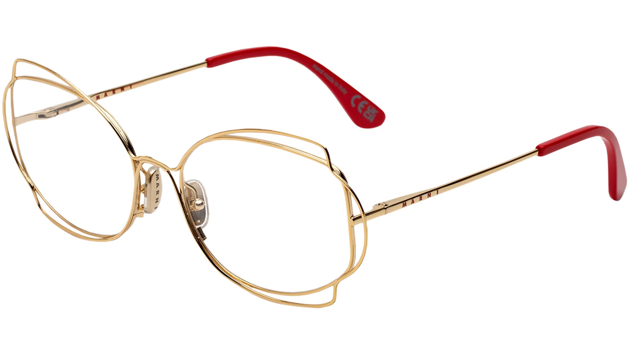 Designed exclusively for Marni, Route of the Sun is a playful optical frame inspired by Art Deco references. The silhouette features an all-metal construction with decorative metal wire encasing its oval lenses and forming an abstract floral shape. Sleek temples with acetate tips complete this unique lightweight frame that comes in a gold finish with red acetate detailing. Sizes: R Lens Width: 58 mm. Frame Front: Frame Side: 135 mm. Product Code Size R: BXL