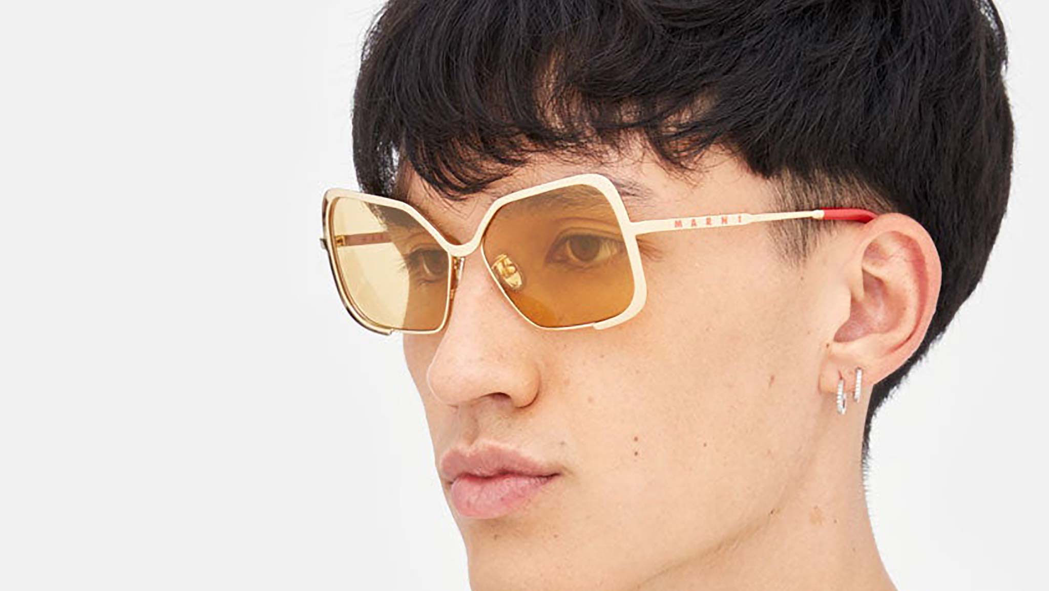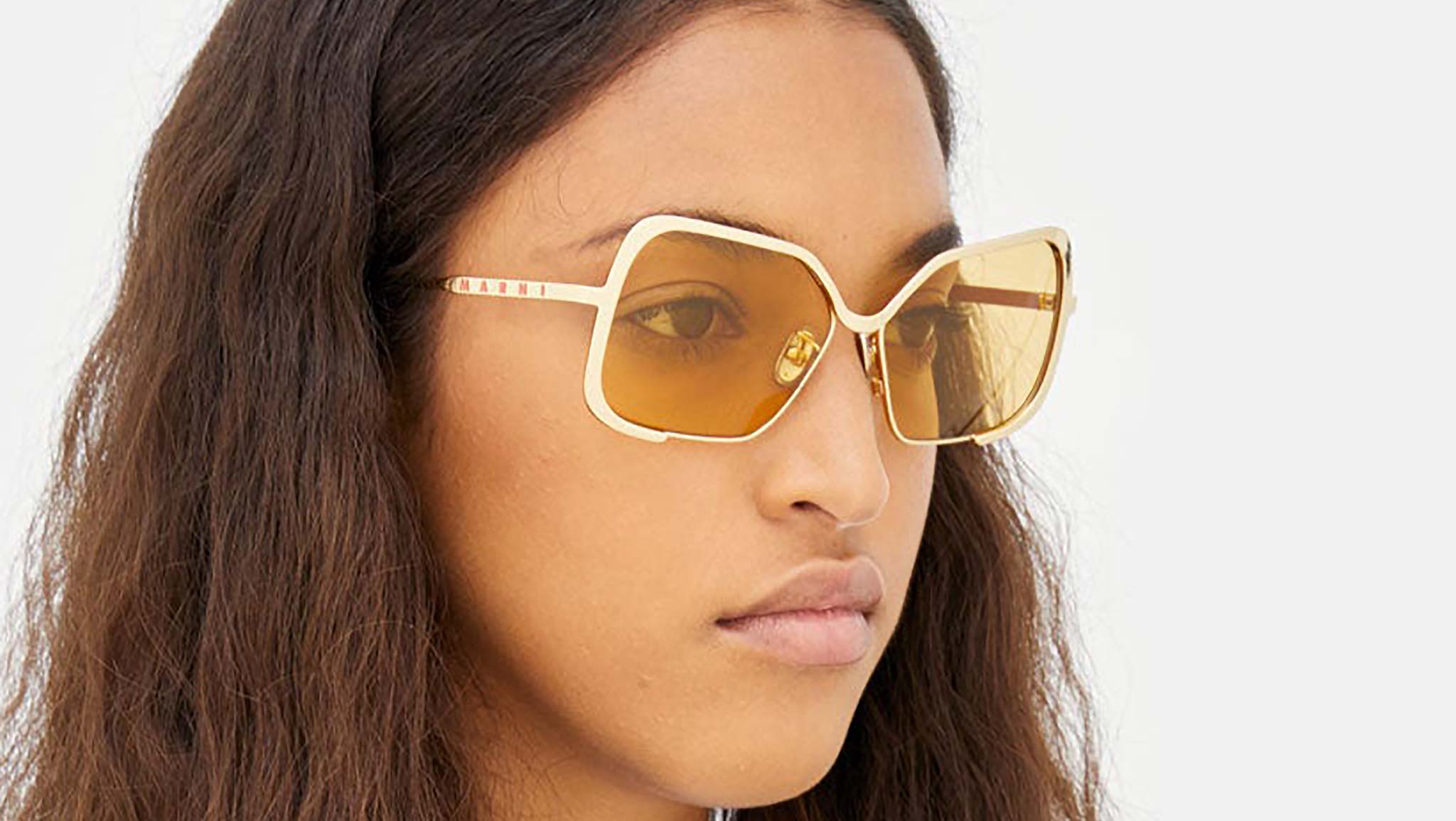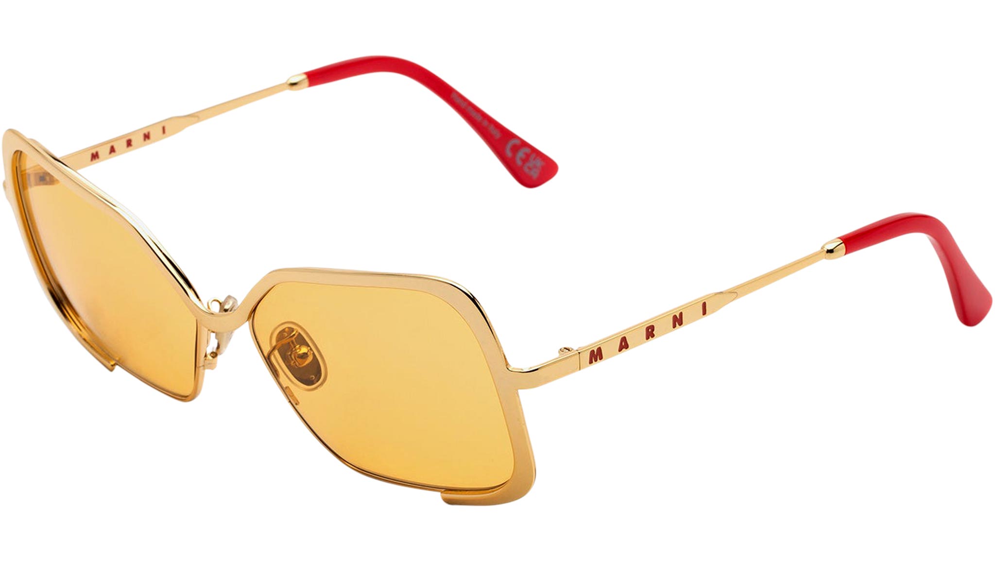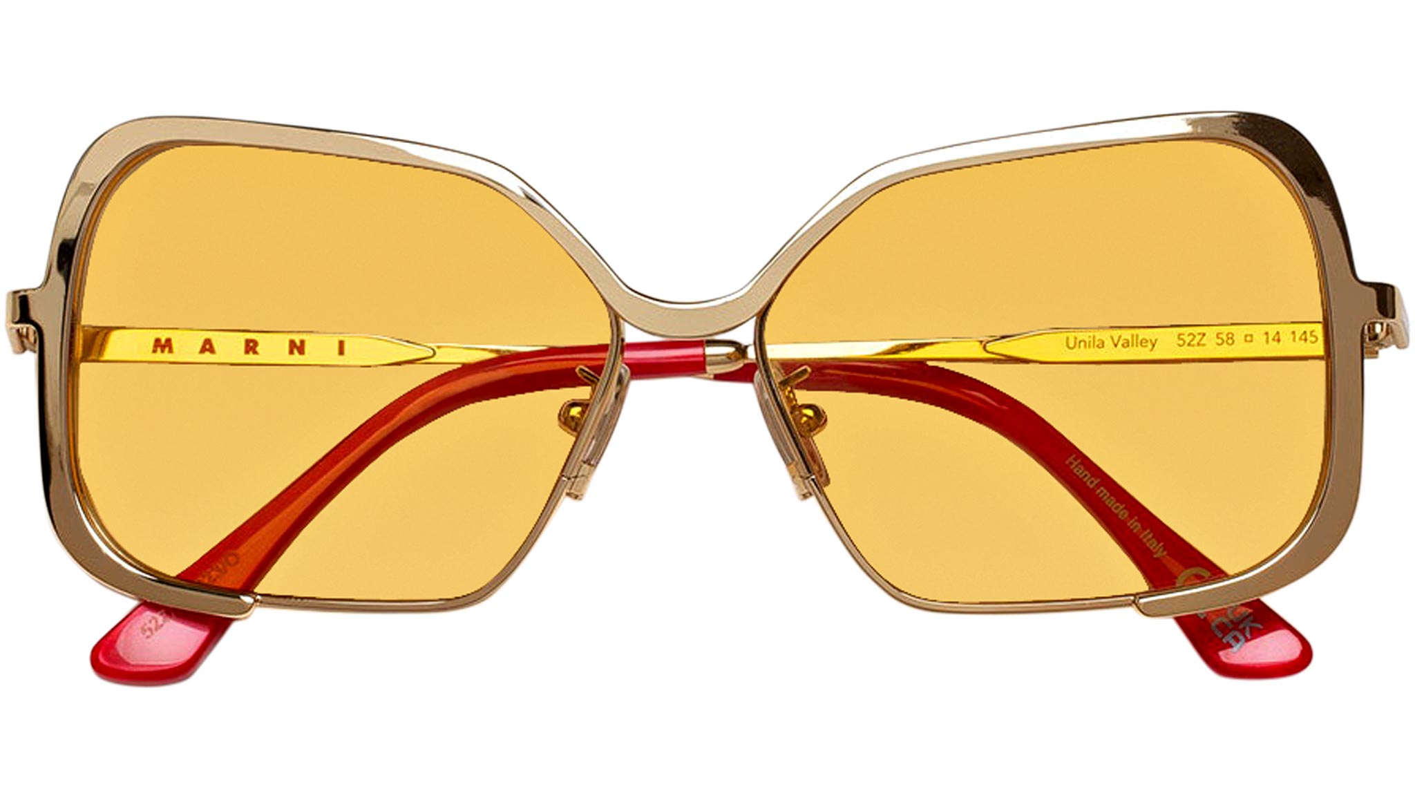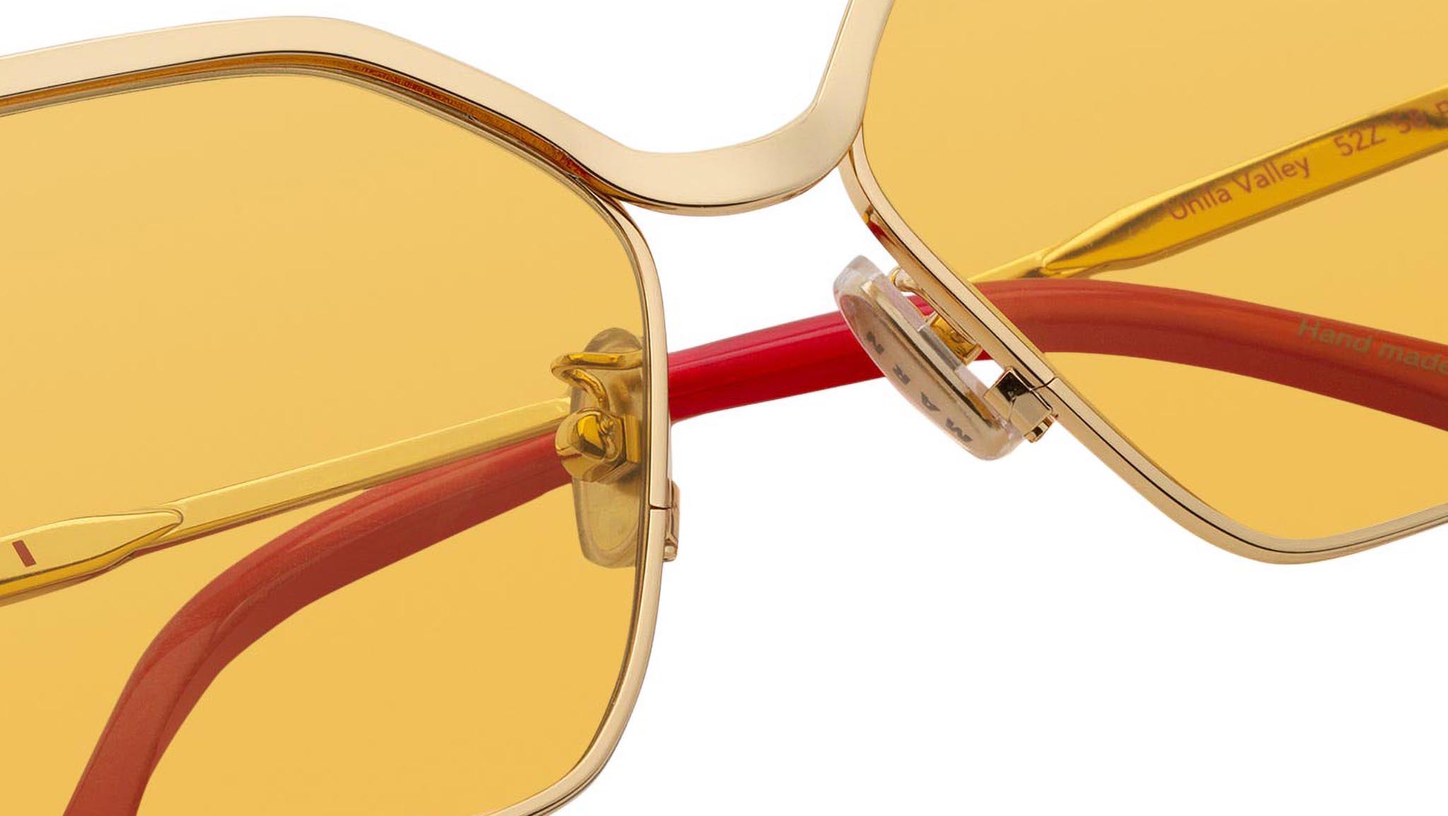 Designed exclusively for Marni, Unila is a unique oversized full-metal silhouette characterized by a single custom-moulded metal rod which carefully embraces the wide geometric lenses. The sturdy metal piece extends over the tow lenses and forms a soft U shaped nose bridge. With flexible metal temples, this is a sophisticated yet bold piece of design. This version of Unila features a gold metal finish, mustard tinted lenses and is topped off with metallic red acetate temple tips. Sizes: R Lens Width: 58 mm. Frame Front: Frame Side: 135 mm. Product Code Size R: 52Z