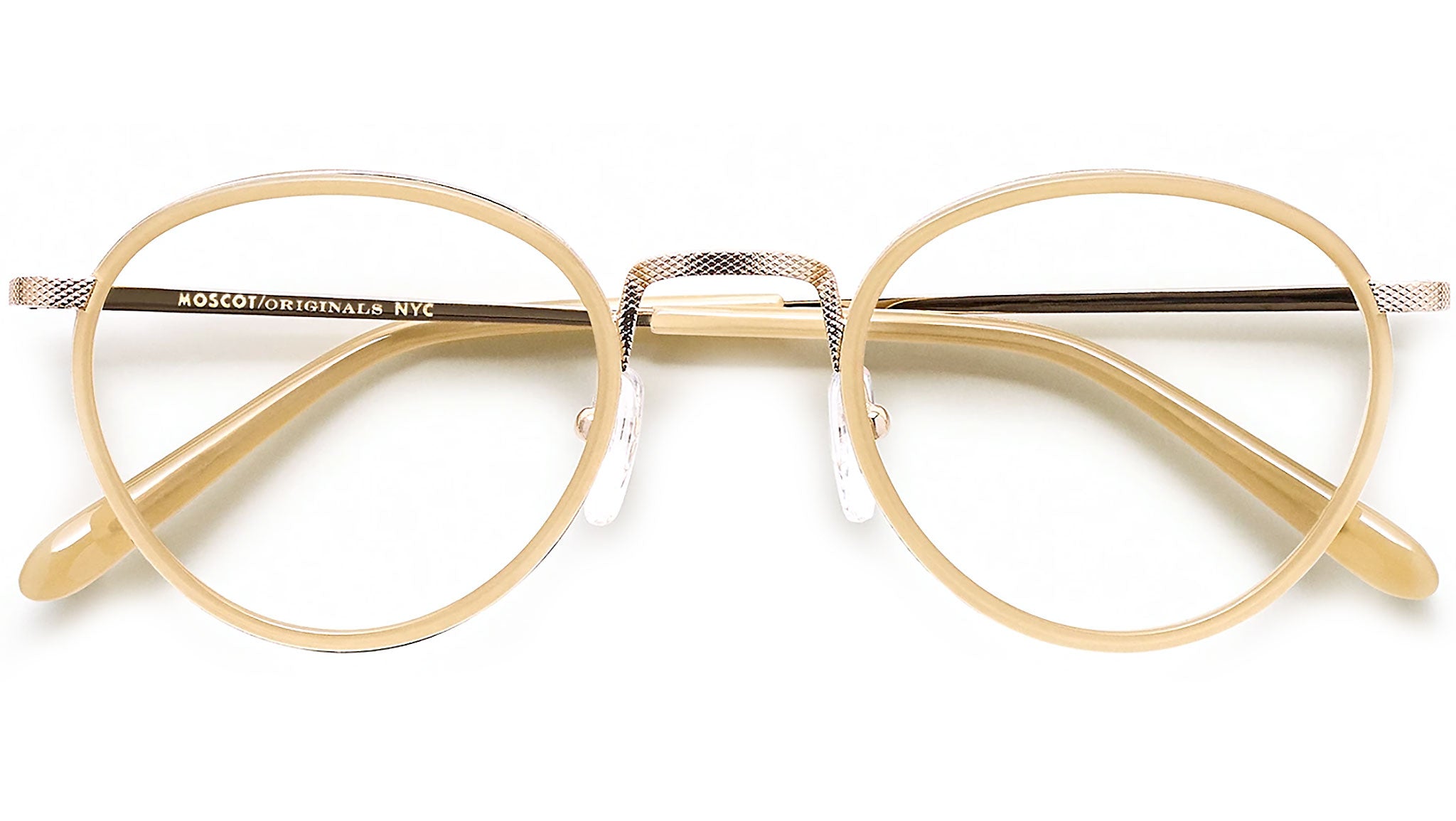 Handcrafted using a combination of metal and Italian acetate. Features classic P-3 shape. Comfortable saddle nose bridge. Intricate diamond texturing on metal features. Includes silicone nose pads. Moscot temple engravings.