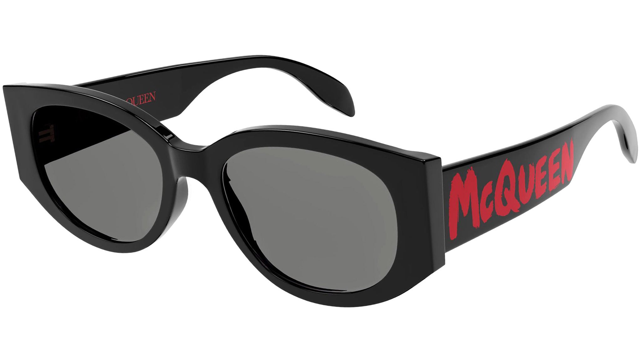Occhiali da sole Alexander McQueen linea Casual Lines modello AM0330S 002, variante colore nero lucido con lenti color grigio fumo tinta unita. Sinonimo di fashion irriverente e senza inibizioni, i modelli Alexander McQueen Eyewear rappresentano la pura giustapposizione tra elementi contrastanti, declinata in modelli da passerella dal segno unico, stimolante e moderno.