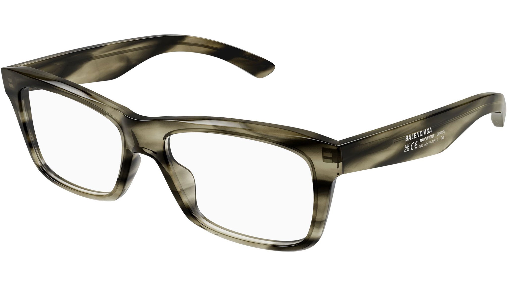 Occhiali da vista Balenciaga BB0426O 004 uomo con montatura rettangolare in acetato riciclato avana verde militare fiammato lucido e lenti demo. Linea: Everyday. Codice modello: BB0426O. Codice colore: 004. Made in Italy. Rivenditore autorizzato Balenciaga online. Gli occhiali vengono consegnati con custodia e accessori originali e sono coperti dalla garanzia ufficiale di 12 mesi del produttore.