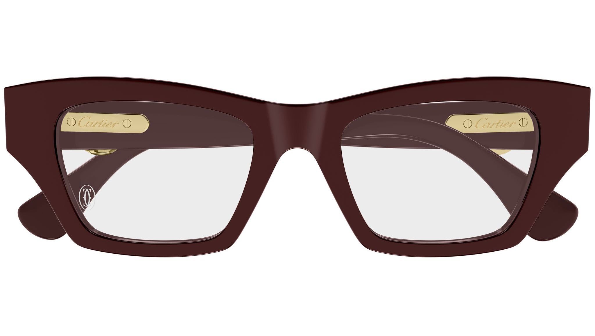 Occhiali da vista Cartier CT0639O 008 donna con montatura cat eye in acetato riciclato color bordeaux e lenti demo. Linea: Contemporary. Codice modello: CT0639O. Codice colore: 008. Made in Italy. Rivenditore autorizzato Cartier online. Gli occhiali vengono consegnati con custodia e accessori originali e sono coperti dalla garanzia ufficiale di 12 mesi del produttore.