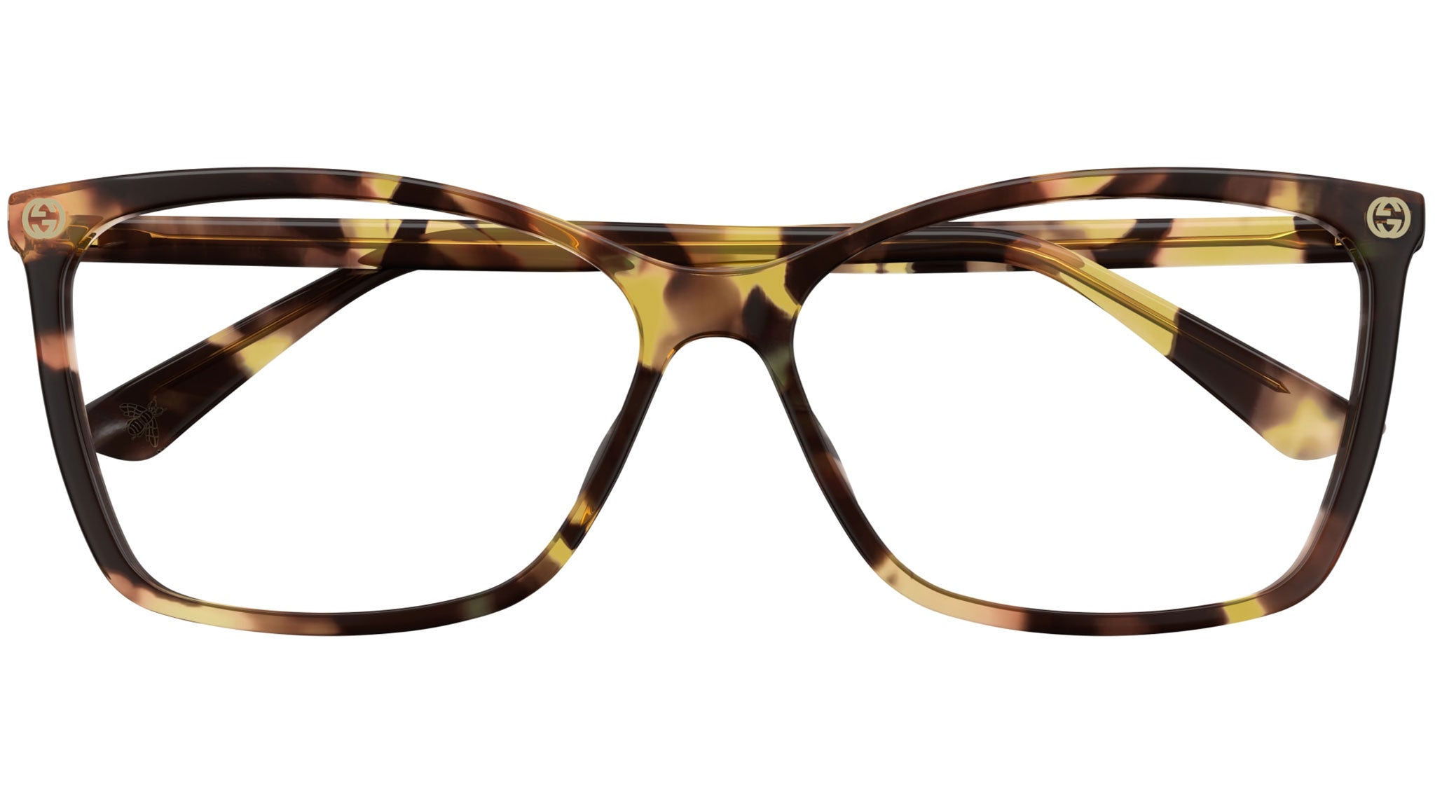 Occhiali da vista Gucci modello GG0025O linea GG Logo in acetato forma a gatto verde ambra melange lucido e avana nero con aste in tartaruga e lenti demo. Rivenditore autorizzato Gucci online. Gli occhiali vengono consegnati con custodia e accessori originali e sono coperti dalla garanzia ufficiale di 12 mesi del produttore.