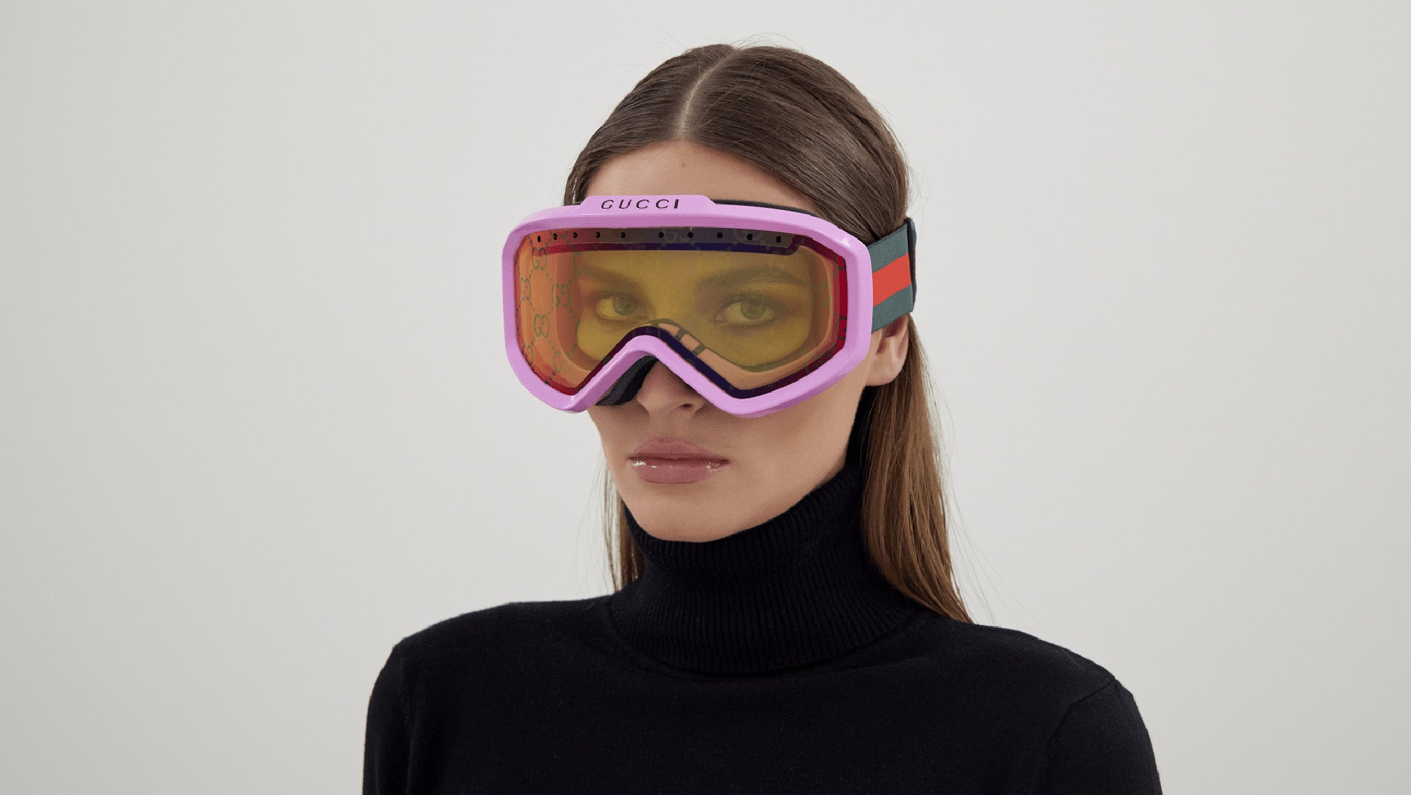 Occhiali da sole Gucci linea Seasonal Icon modello GG1210S 004 in iniettato rosa tinta unita lucido con aste color multicolore e lenti giallo con logo Guccissima.