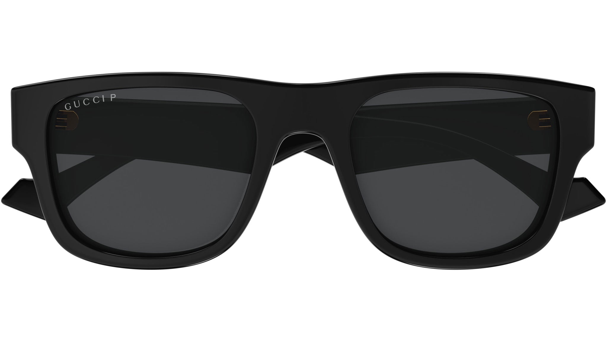 Occhiali da sole Gucci linea Lettering modello GG1427S 002 in acetato riciclato nero lucido tinta unita con aste color nero e lenti grigio tinta unita con AR blu interno.
