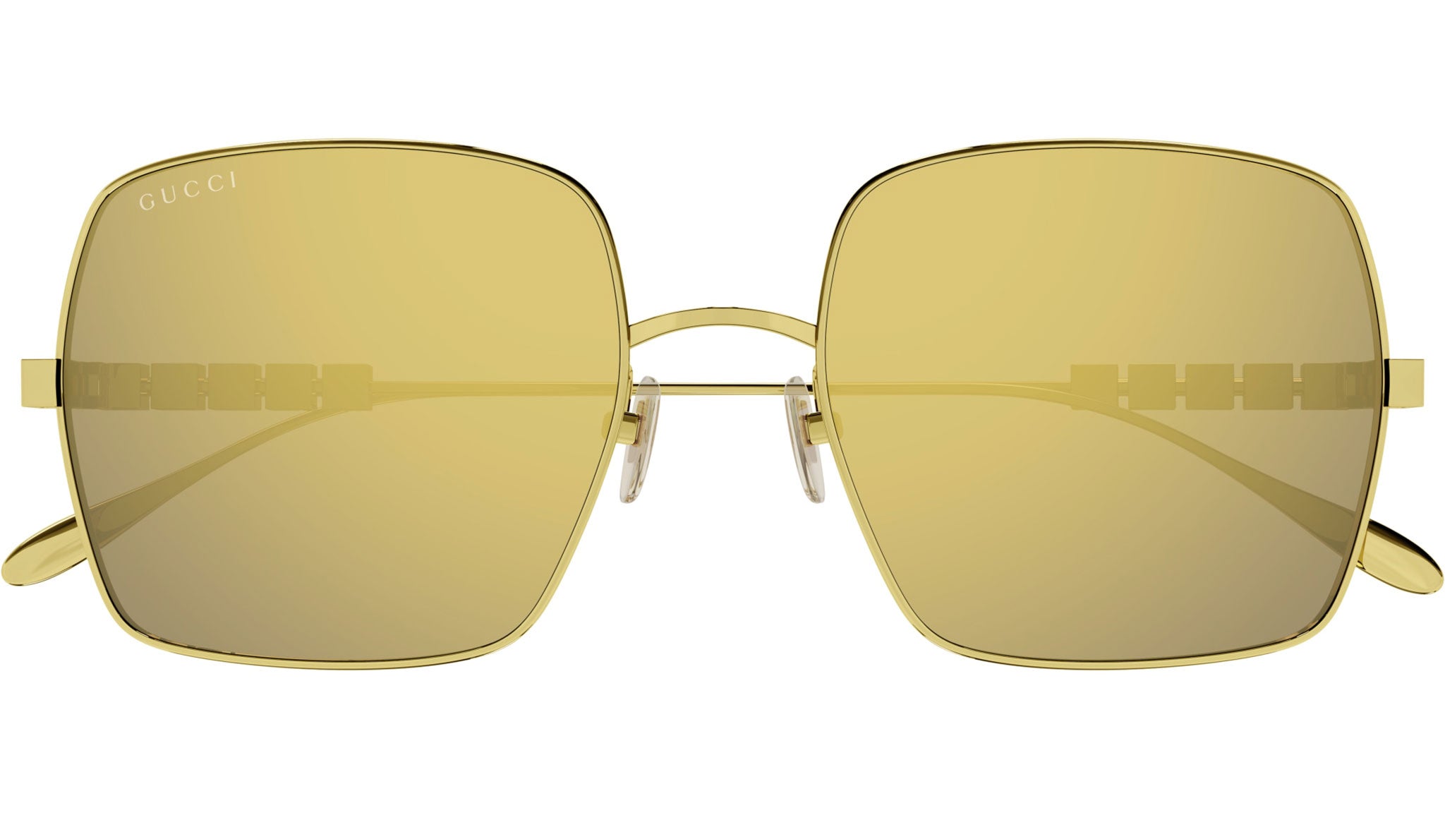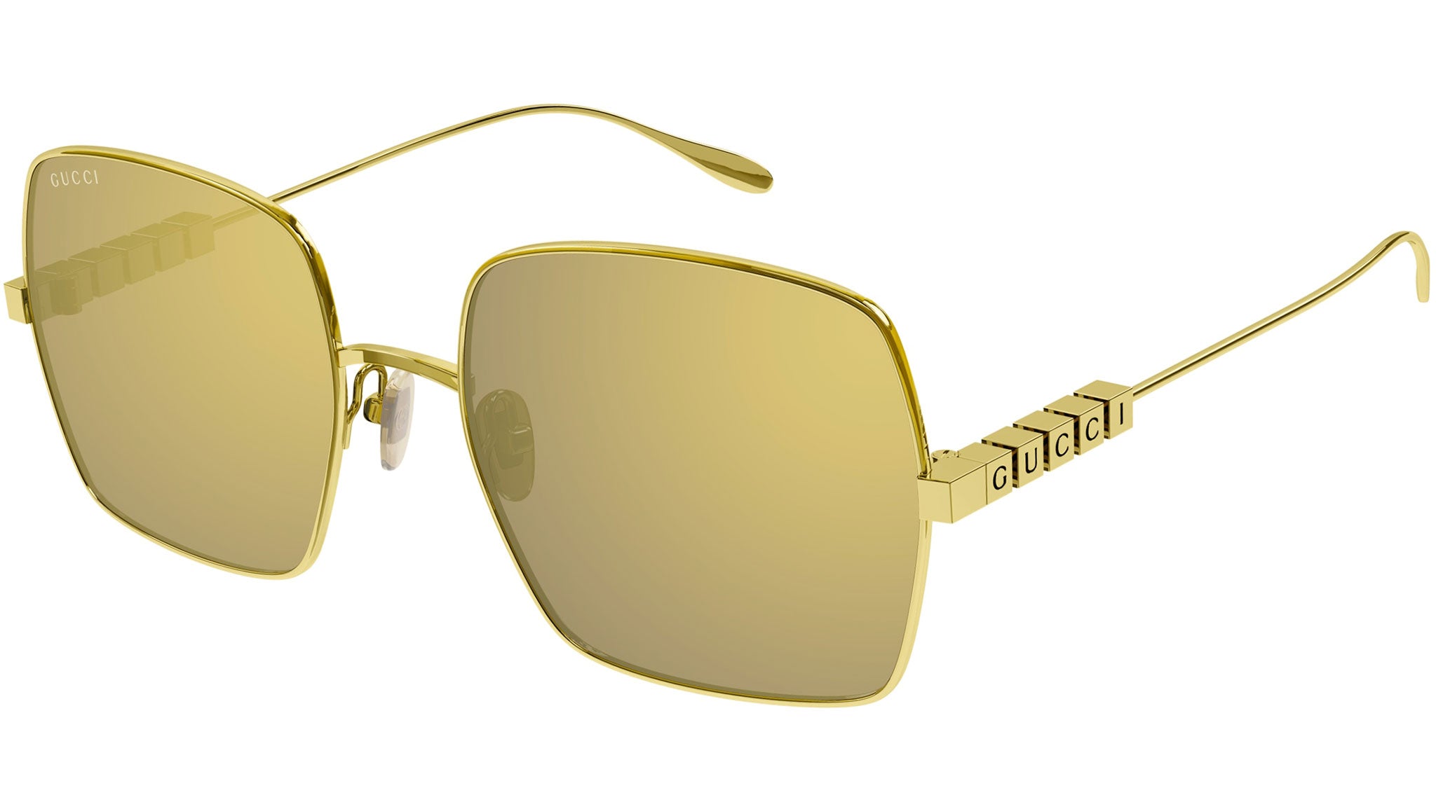 Occhiali da sole Gucci linea Lettering Logo modello GG1434S 004 in metallo oro giallo lucido con aste color oro e lenti marrone tinta unita e oro.