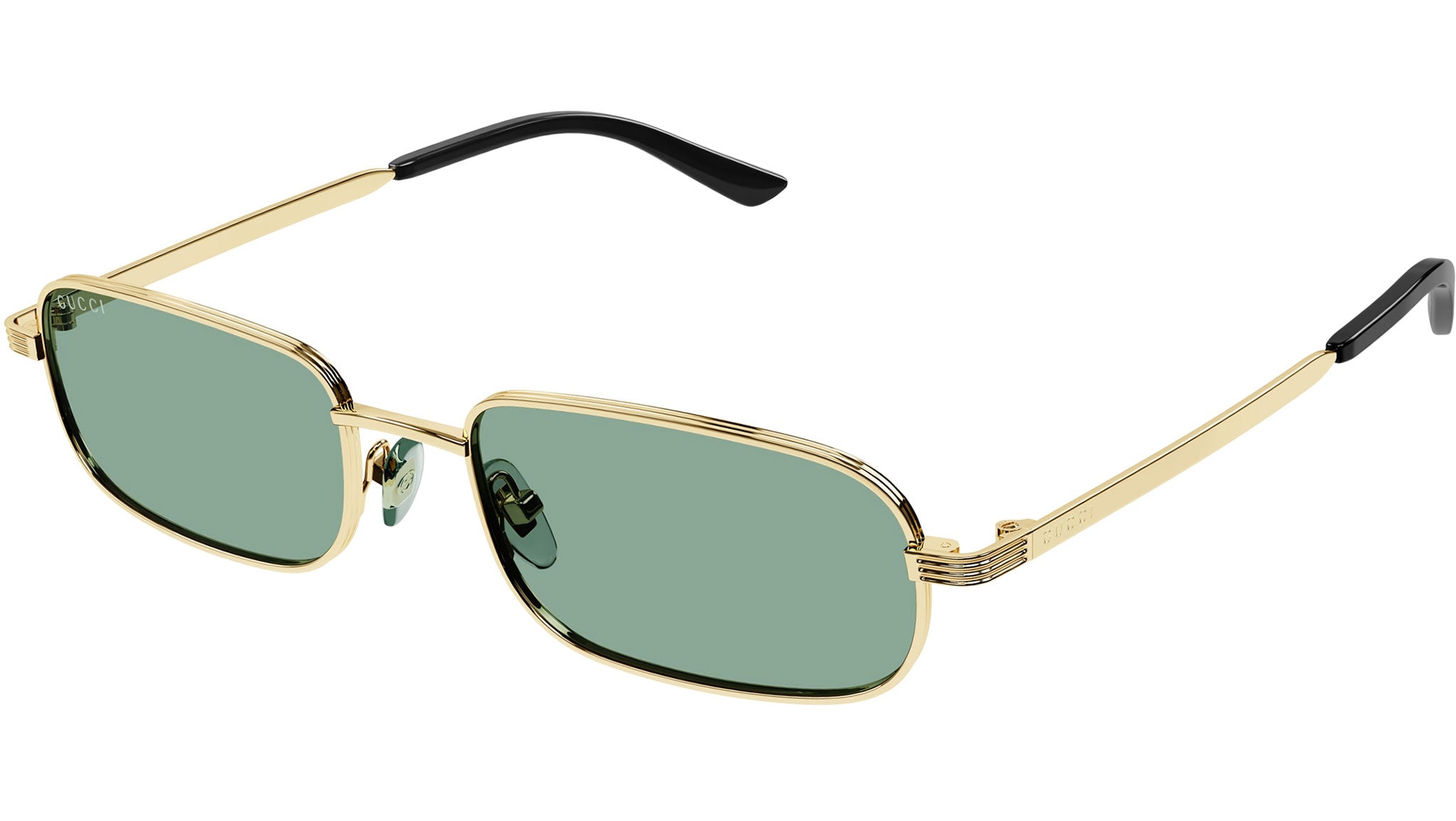 Occhiali da sole Gucci linea Lettering modello GG1457S 005 in metallo oro endura lucido con aste color oro e lenti verde tinta unita.