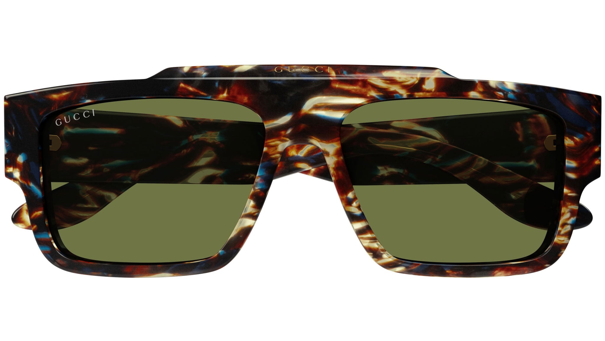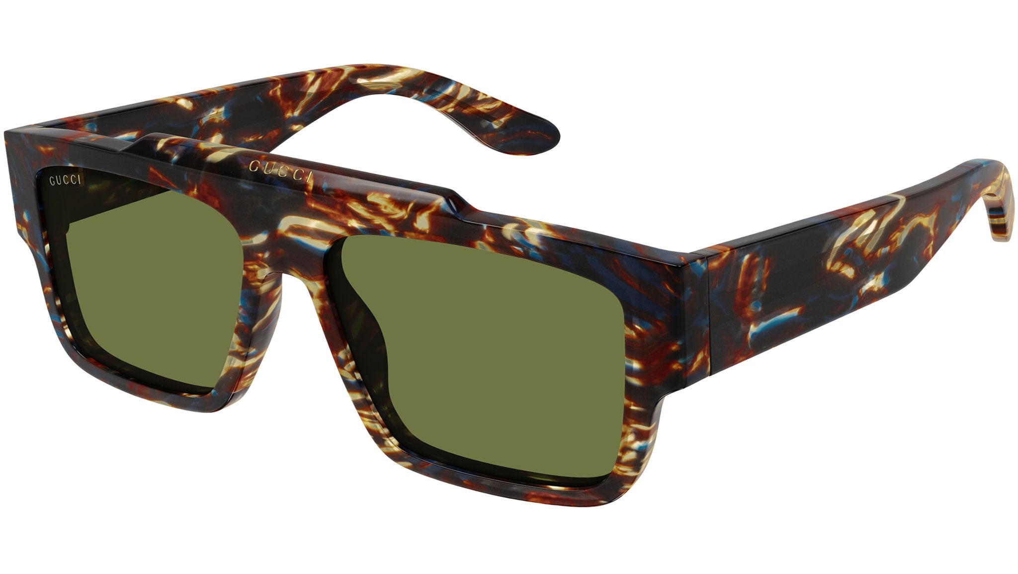 Occhiali da sole Gucci linea Lettering modello GG1460S 002 in acetato riciclato marrone havana a righe lucido con aste color tartaruga e lenti verde tinta unita.