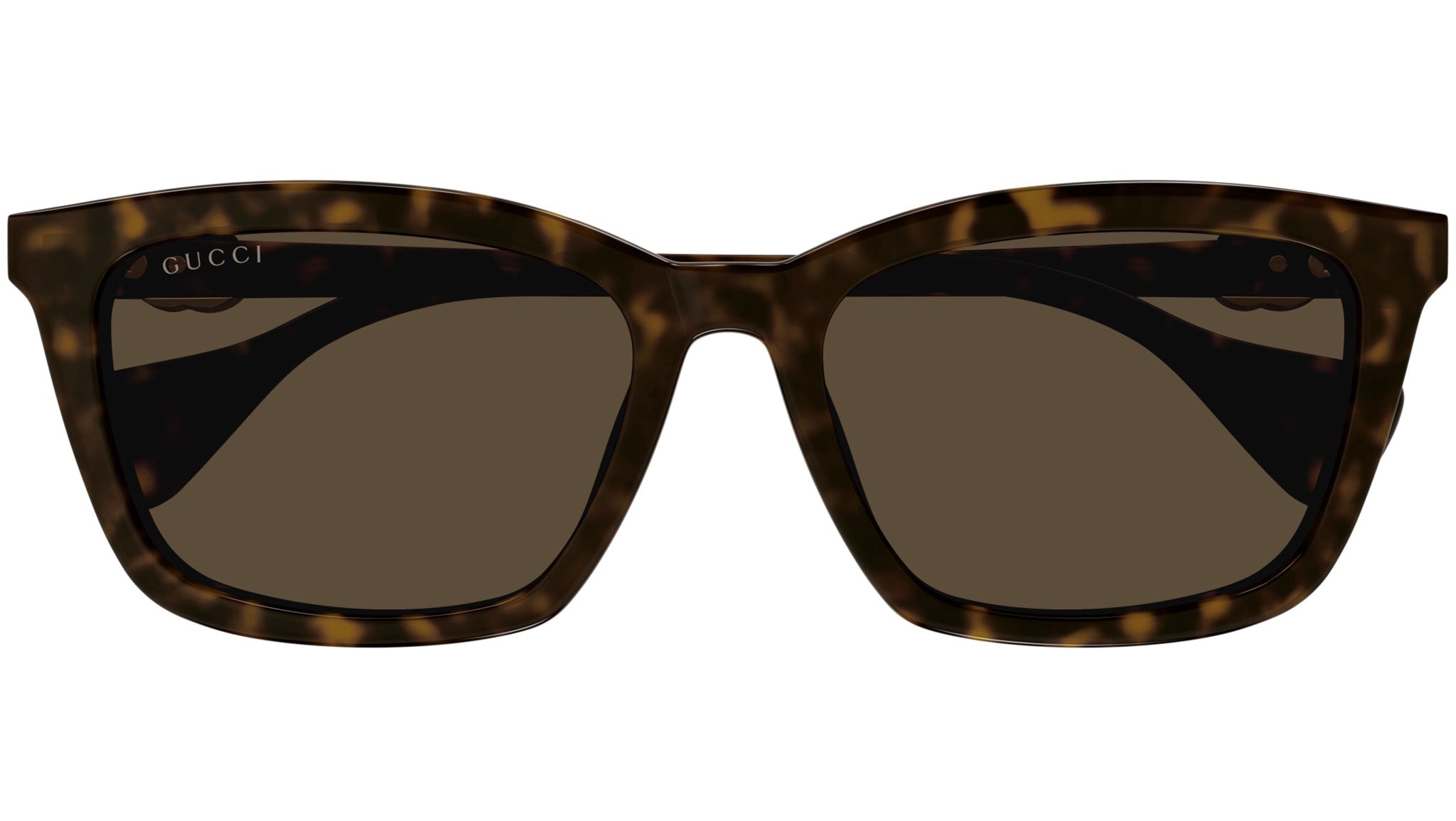 Occhiali da sole Gucci linea GG Logo modello GG1596SK rettangolari in acetato riciclato codice colore 003 tartaruga scuro lucido con aste tartaruga e lenti color marrone scuro tinta unita.
