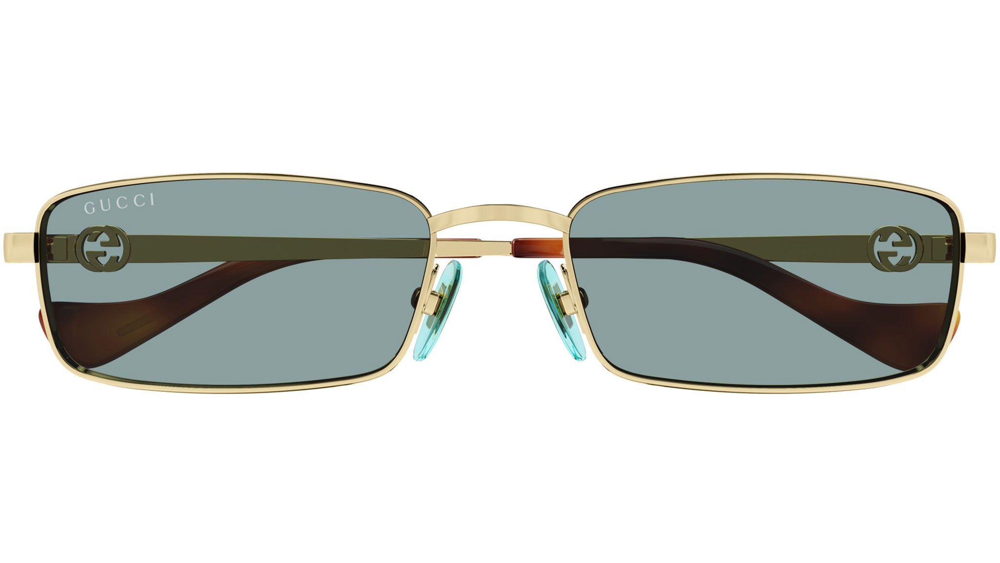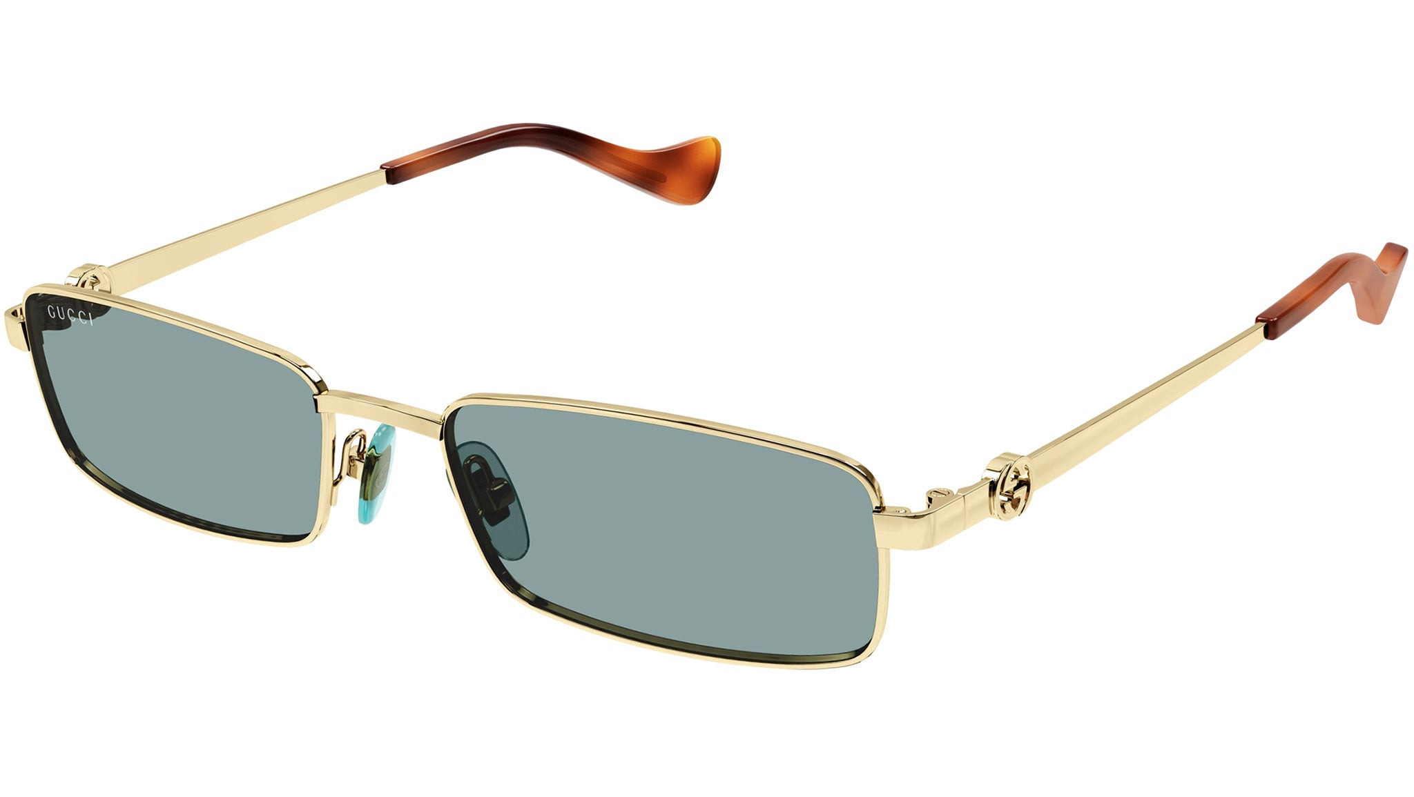Occhiali da sole Gucci linea GG Logo modello GG1600S rettangolari in metallo codice colore 003 oro endura lucido con aste oro e lenti color verde chiaro tinta unita.