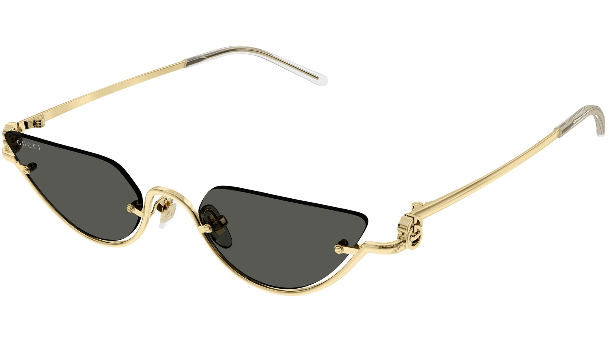 Occhiali da sole Gucci linea GG Logo modello GG1603S cat eye in metallo codice colore 001 oro endura lucido con aste oro e lenti color grigio tinta unita.