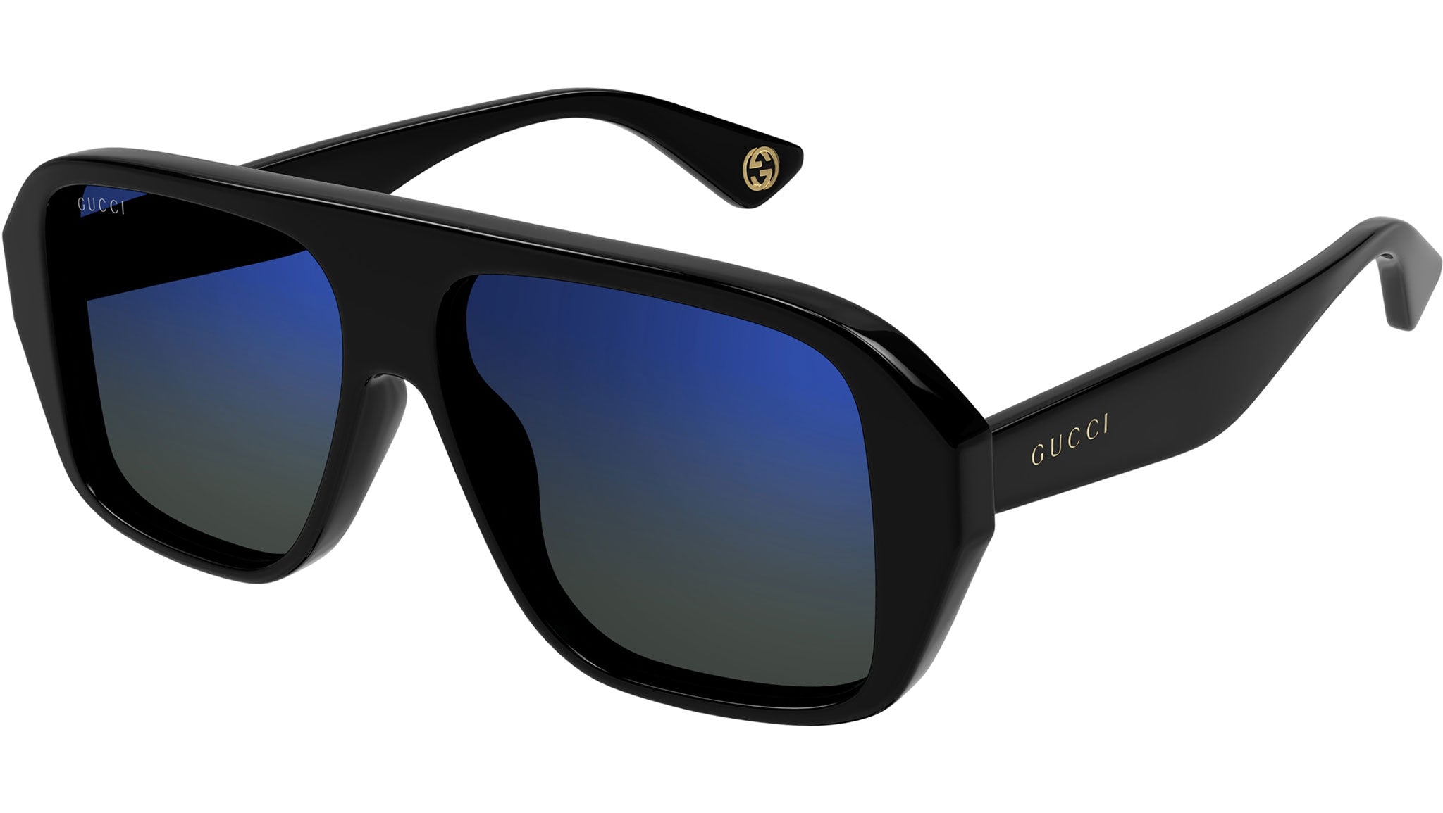 Occhiali da sole Gucci linea Lettering modello GG1615S aviatore in acetato riciclato codice colore 001 nero lucido con aste nero e lenti color verde scuro solido + blu sfumato a specchio.