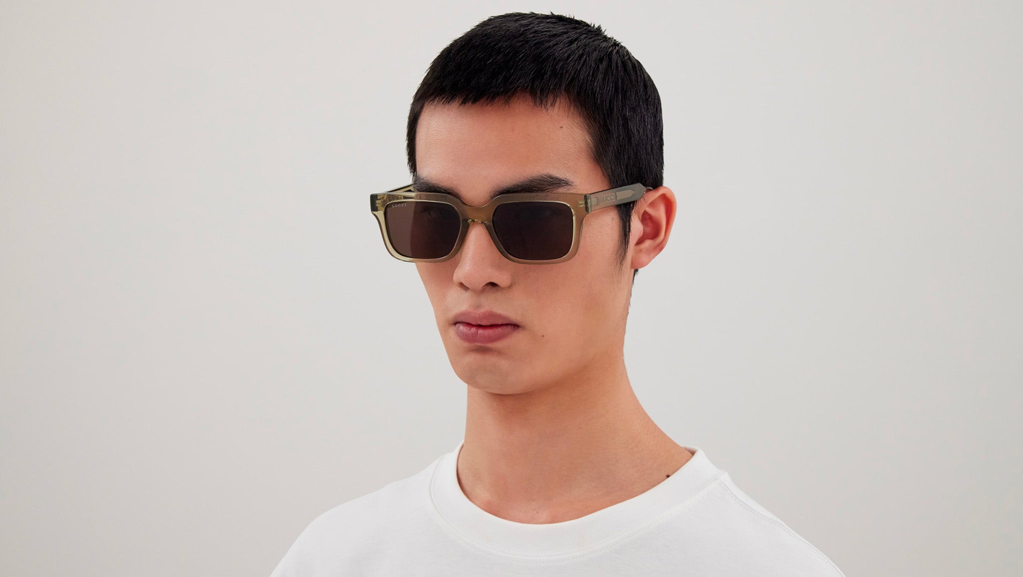Occhiali da sole Gucci modello GG1732SK linea Lettering in iniettato forma rettangolare codice colore 003 verde salvia trasparente lucido con aste verde e lenti marrone tinta unita. Rivenditore autorizzato Gucci online. Gli occhiali vengono consegnati con custodia e accessori originali e sono coperti dalla garanzia ufficiale di 12 mesi del produttore.