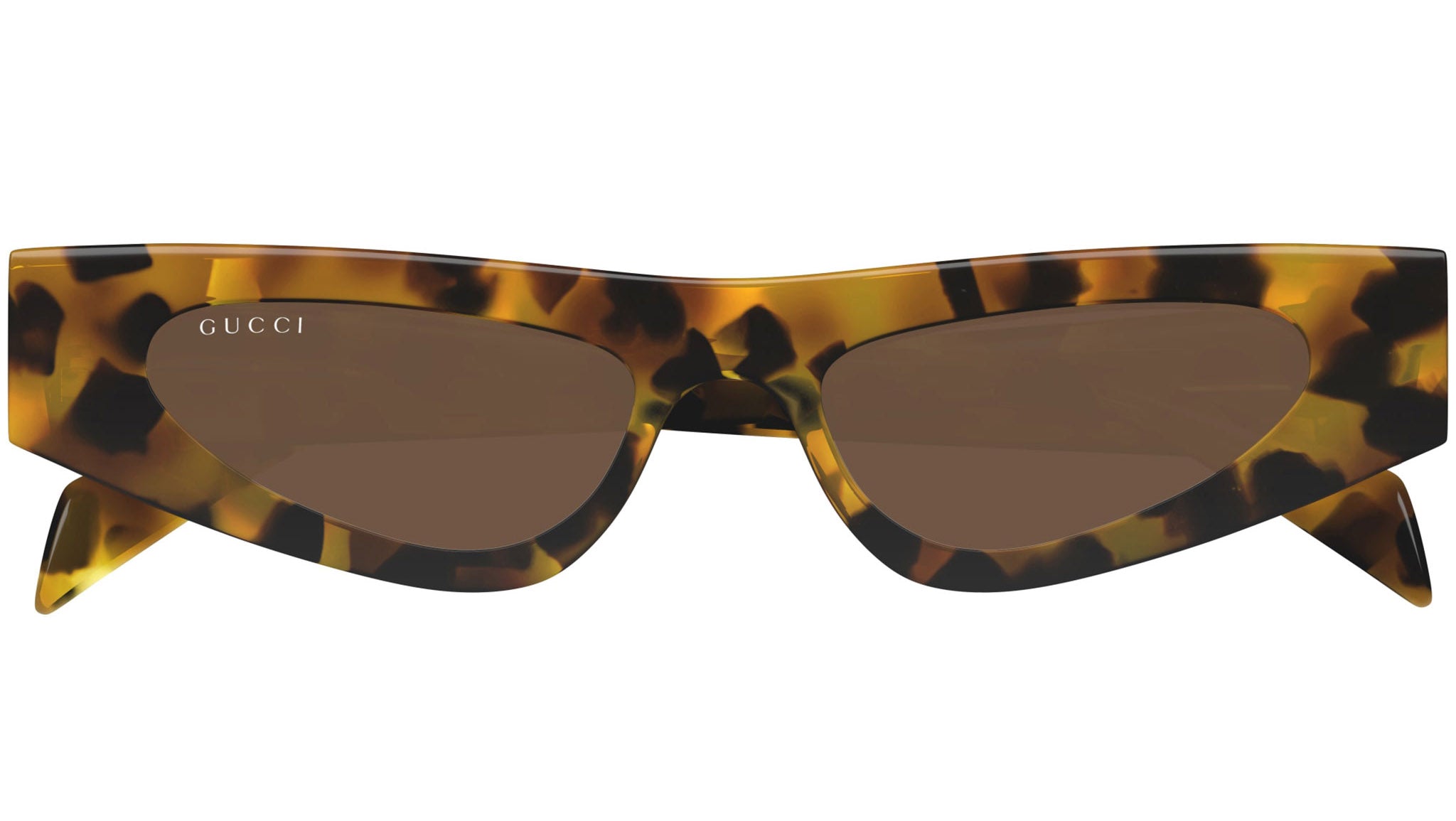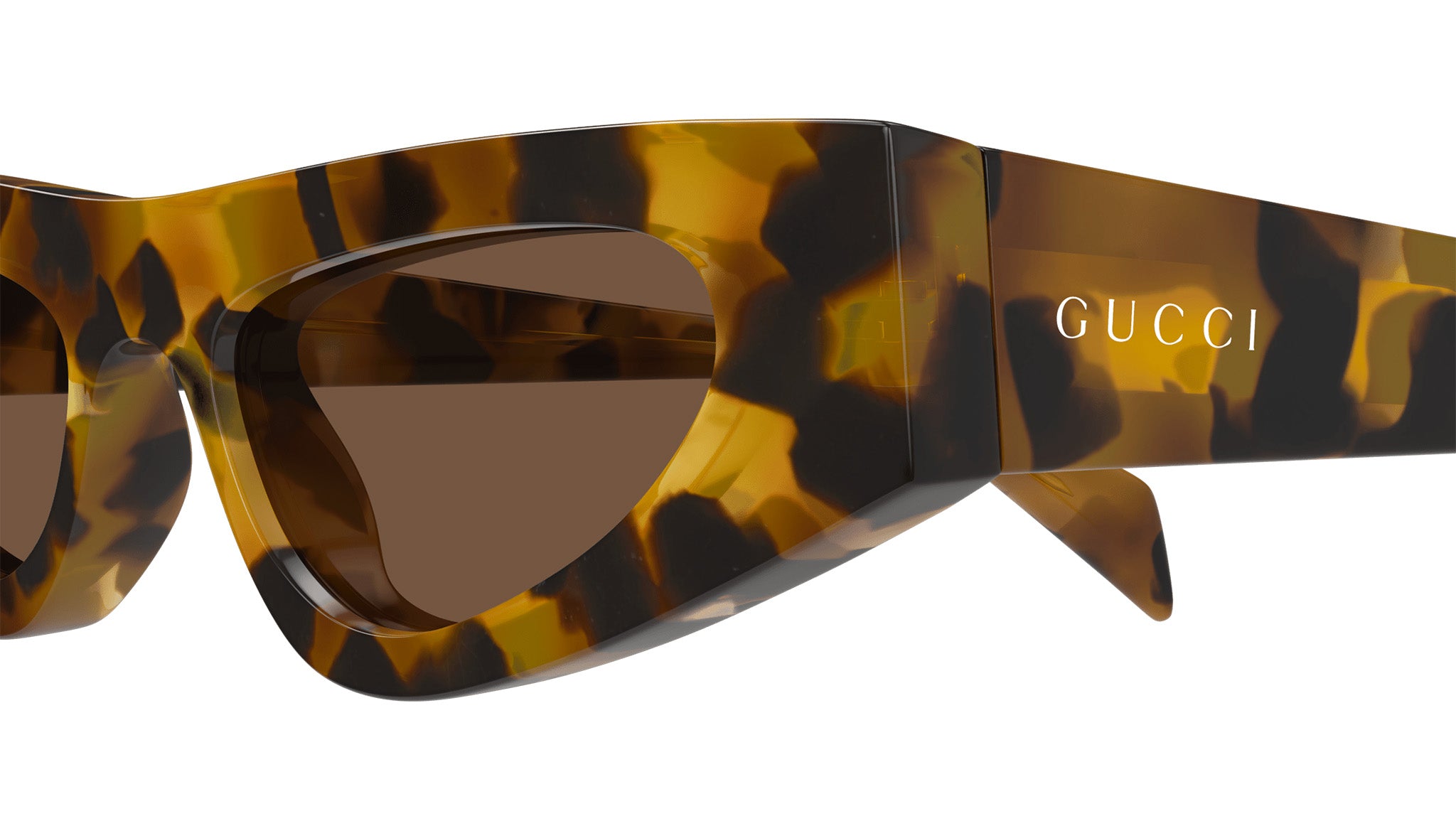 Occhiali da sole Gucci modello GG1779S linea Fashion in acetato riciclato forma a gatto codice colore 004 avana maculato lucido con aste tartaruga e lenti marrone tinta unita. Rivenditore autorizzato Gucci online. Gli occhiali vengono consegnati con custodia e accessori originali e sono coperti dalla garanzia ufficiale di 12 mesi del produttore.