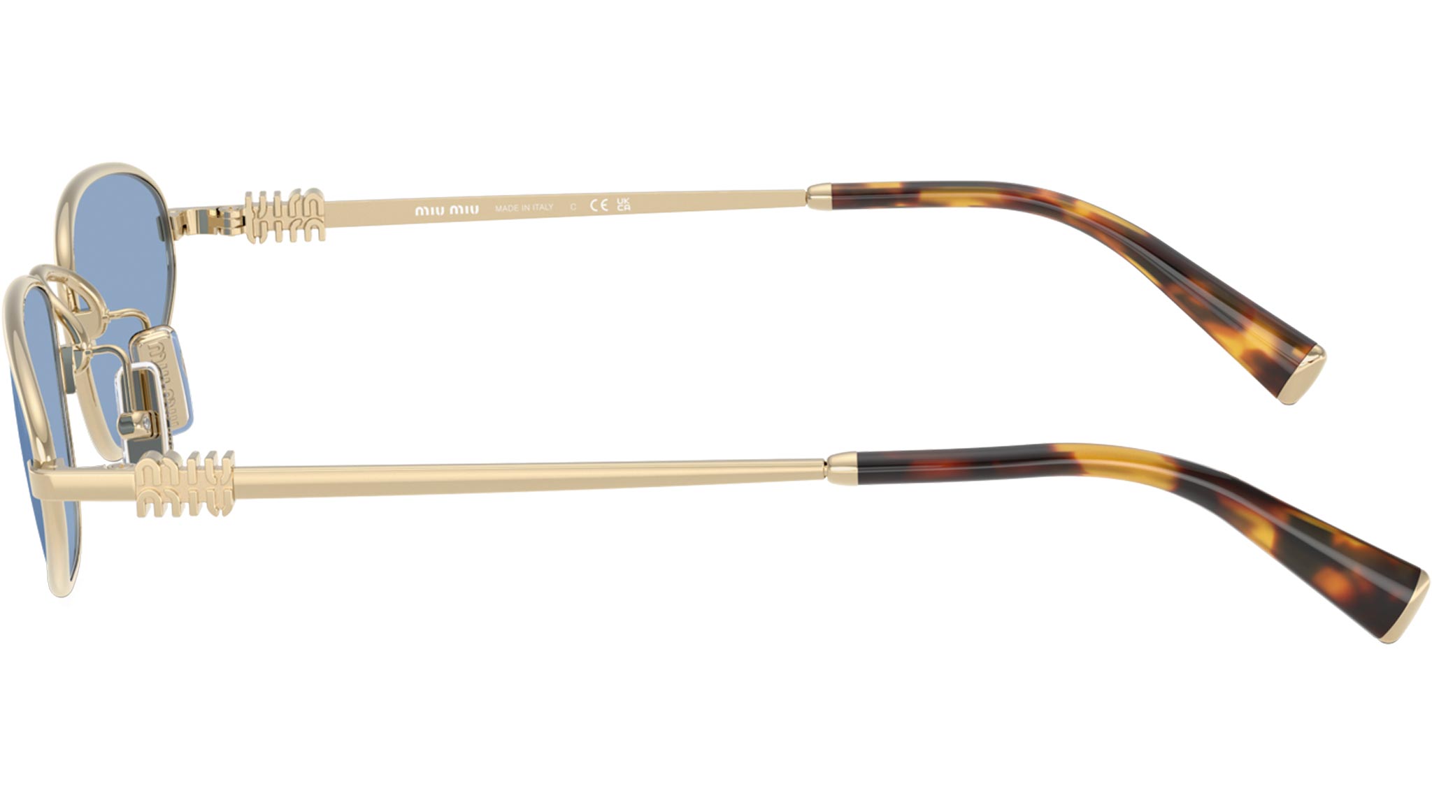 Occhiali da sole Miu Miu MU A52S ZVN60O donna con montatura geometrica in metallo oro pallido e lenti in bio poliammide color azzurro. Naselli regolabili. Linea: Miu Regard. Codice modello: 0MU A52S. Codice colore: ZVN60O. Made in Italy. Rivenditore autorizzato Miu Miu online. Gli occhiali vengono consegnati con custodia e accessori originali e sono coperti dalla garanzia ufficiale di 12 mesi del produttore.