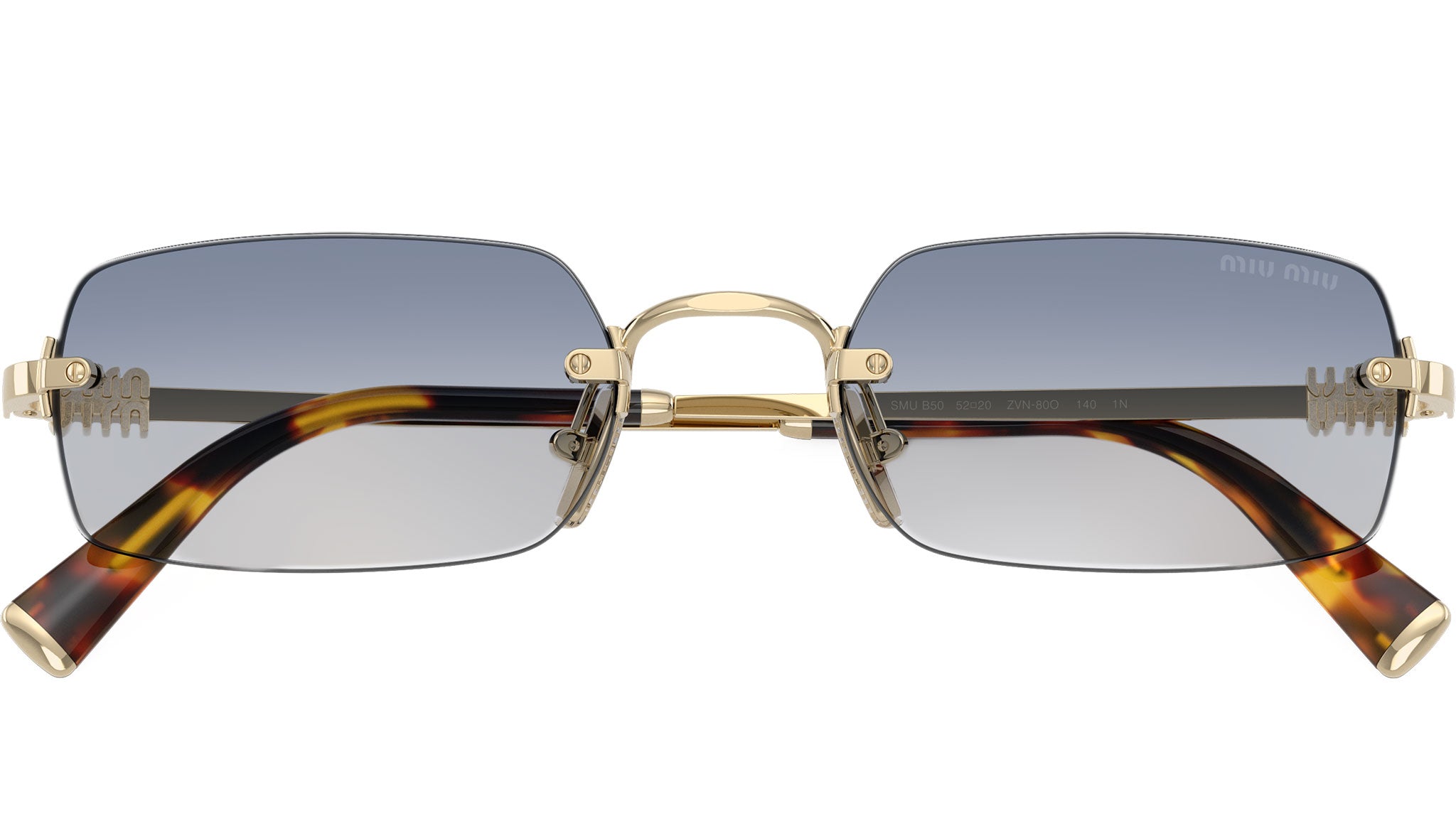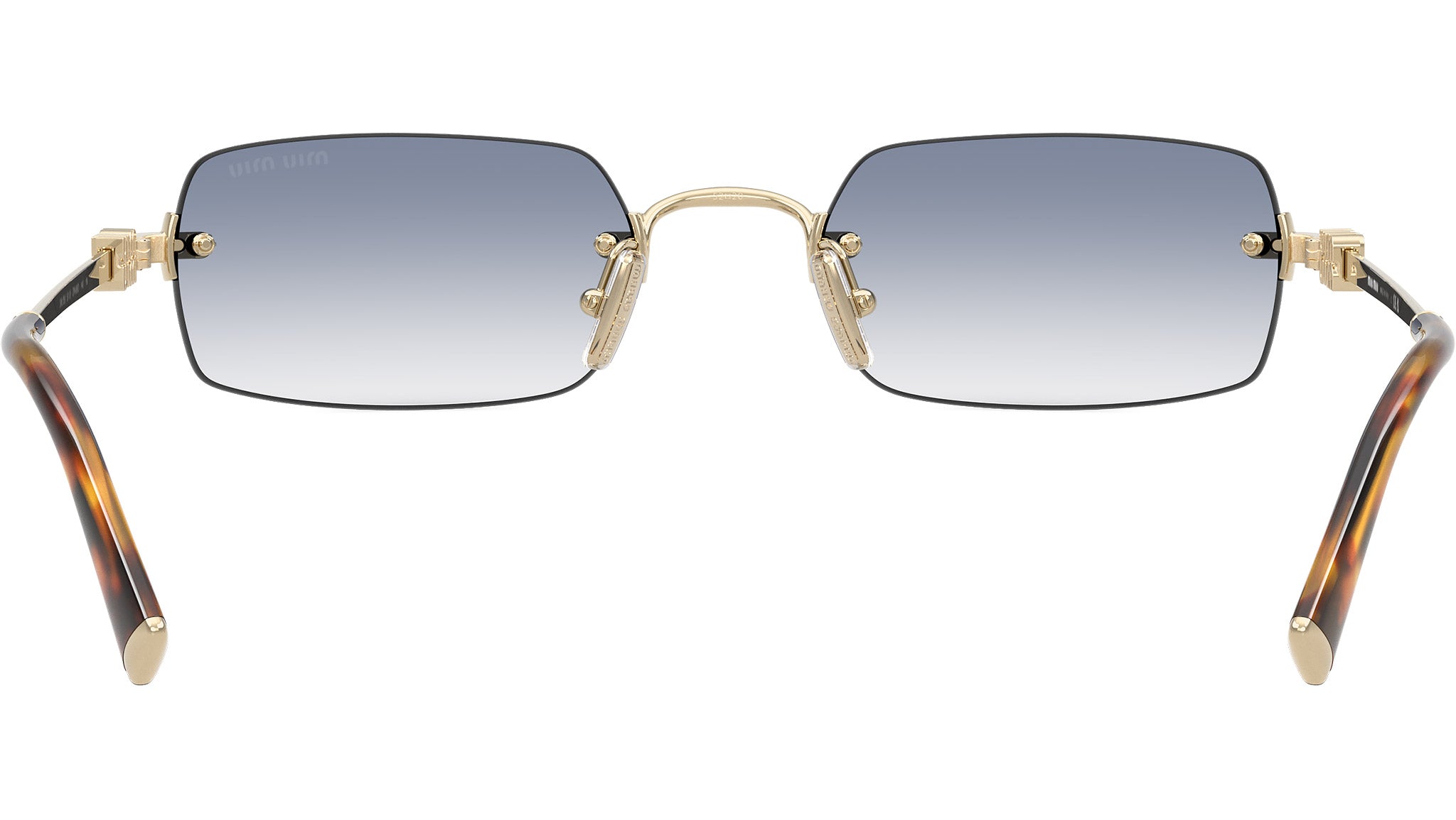 Occhiali da sole Miu Miu MU B50S ZVN80O donna con montatura rettangolare in metallo oro pallido e lenti in bio poliammide color trasparente sfumato blu chiaro. Naselli regolabili. Linea: Main Collection. Codice modello: 0MU B50S. Codice colore: ZVN80O. Made in Italy. Rivenditore autorizzato Miu Miu online. Gli occhiali vengono consegnati con custodia e accessori originali e sono coperti dalla garanzia ufficiale di 12 mesi del produttore.