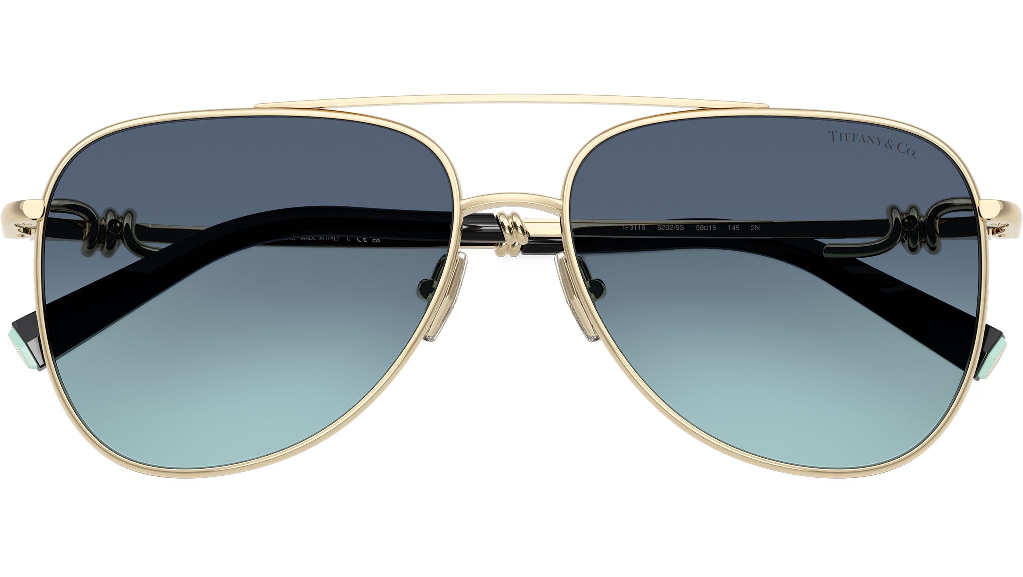 Occhiali da sole Tiffany donna modello TF3116 62029S con montatura navigator in metallo oro chiaro e lenti in bio poliammide blu azzurro sfumato base 4. Naselli regolabili. Linea: Icons. Codice Brand: 0TF3116. Codice colore: 62029S. Rivenditore autorizzato online Tiffany Eyewear. Ogni prodotto Tiffany viene consegnato con astuccio originale e accessori ed è coperto da garanzia del produttore di 12 mesi.