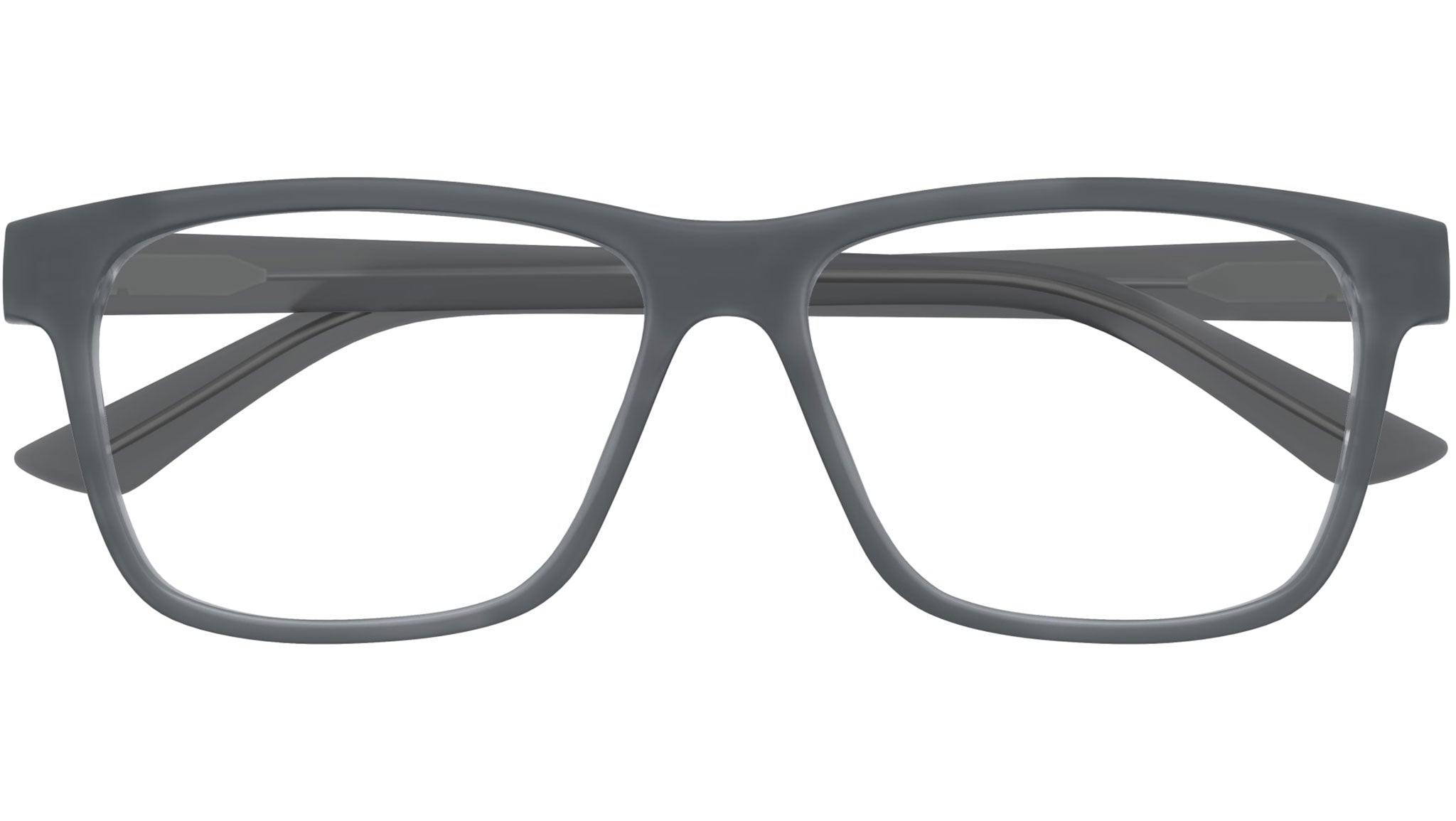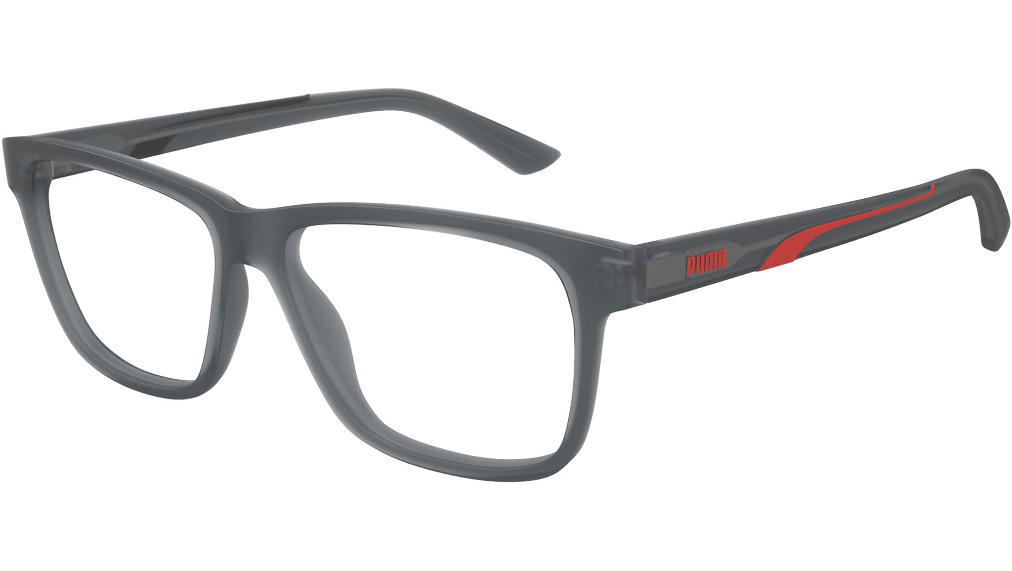 Occhiali da vista Puma Essential modello PU0470O variante colore 003 grigio trasparente opaco con lenti demo. Rivenditore autorizzato Puma online. Gli occhiali vengono consegnati con custodia e accessori originali e sono coperti dalla garanzia ufficiale di 12 mesi del produttore.